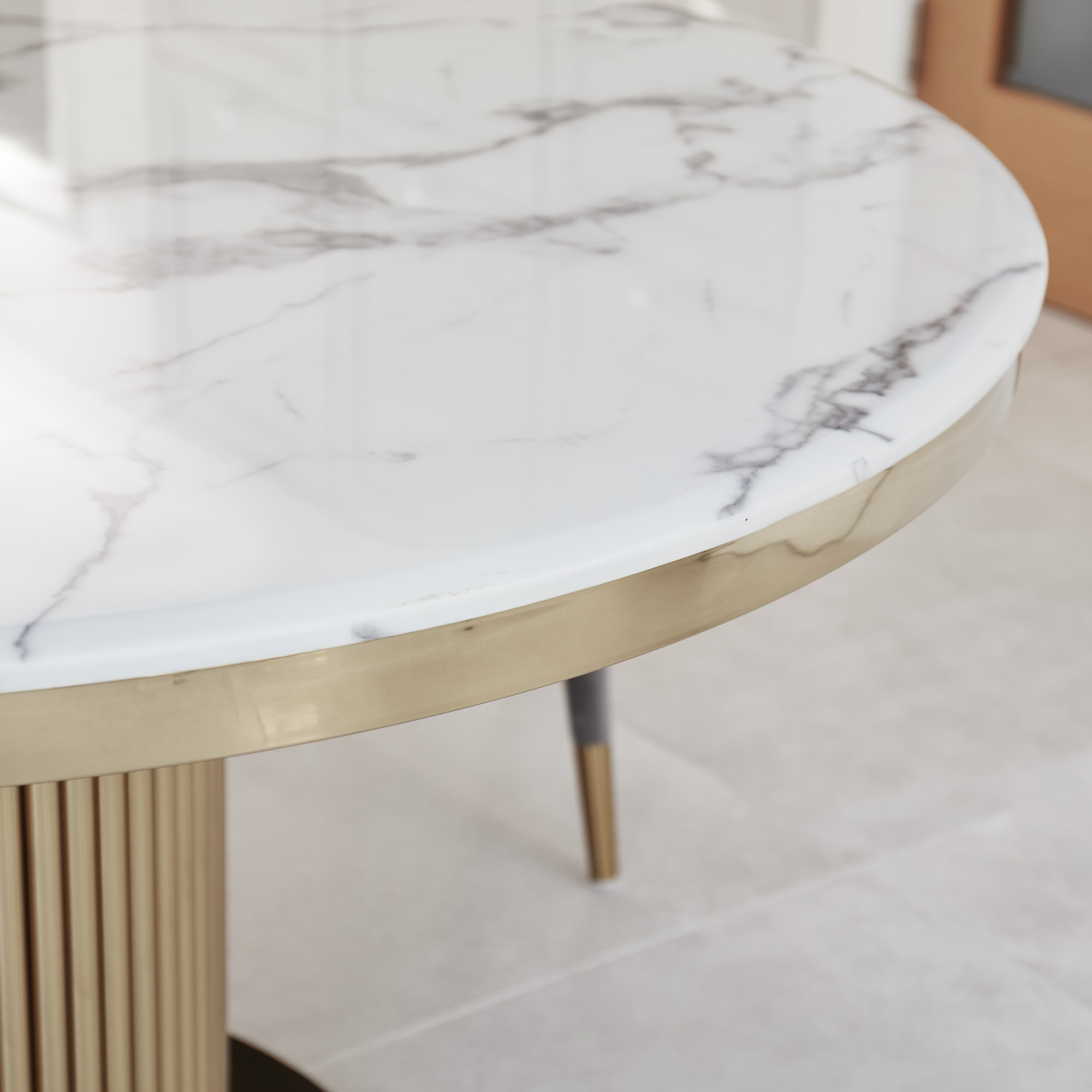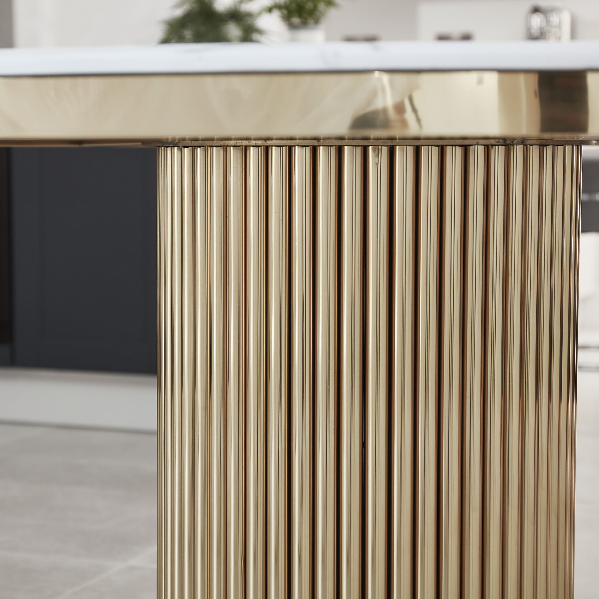 This circular white Marble dining table is sure to make a statement in any room that it is placed in, this table features a white and grey reconstituted marble 18mm marblewith a beveled edge and has a sealed finish. Featuring a reided column polished golden steel pedestal base.