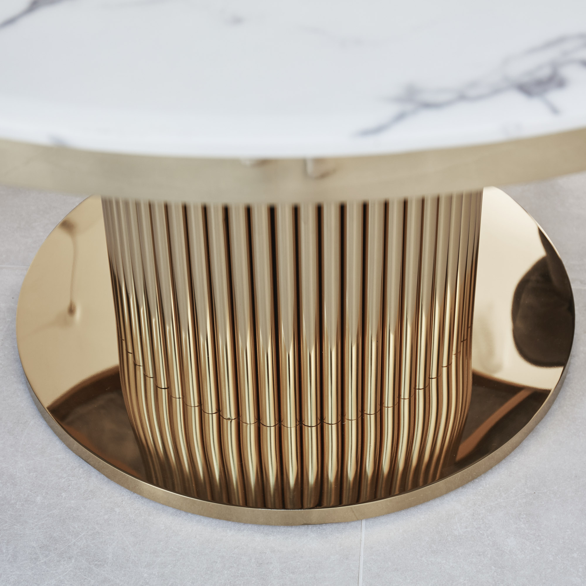 1.3M Circular Pedestal Gold Stainless Steel Dining Table with White Marble Effect