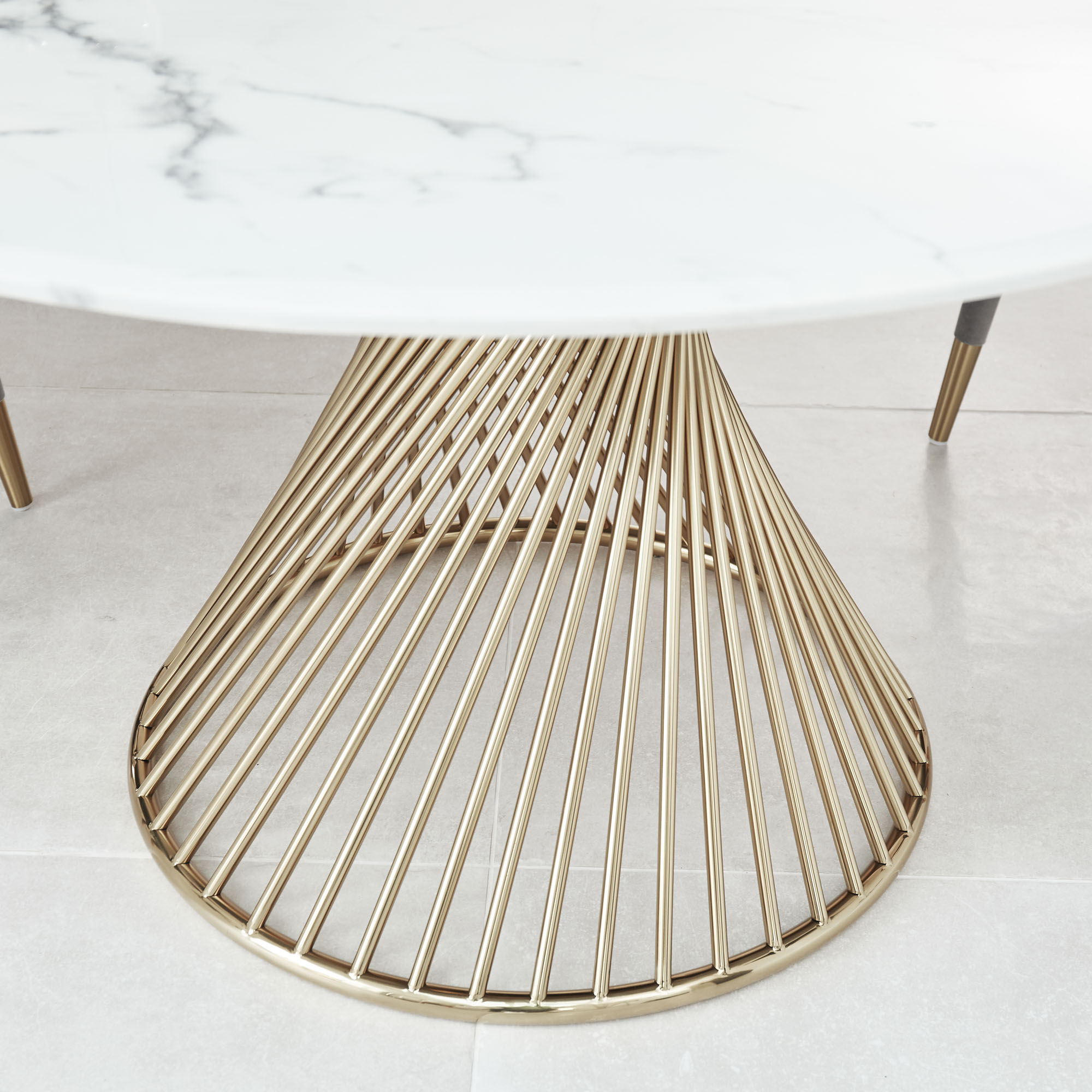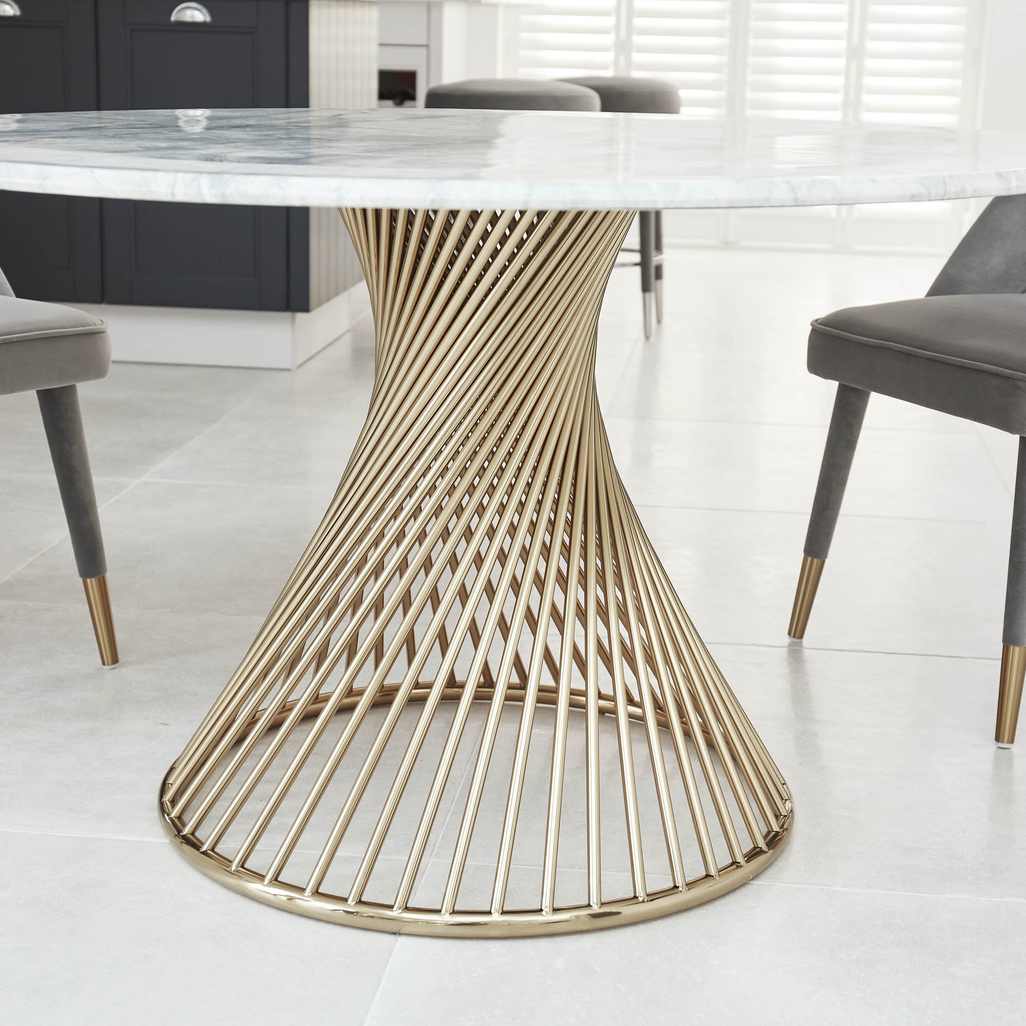 This circular white faux Marble dining table is sure to make a statement in any room that it is placed in, this table features a white and grey marble 18mm hardwood faux marble veneer which has a bevelled top with a sealed finish and features an intertwining polished golden steel cylinder circular base.