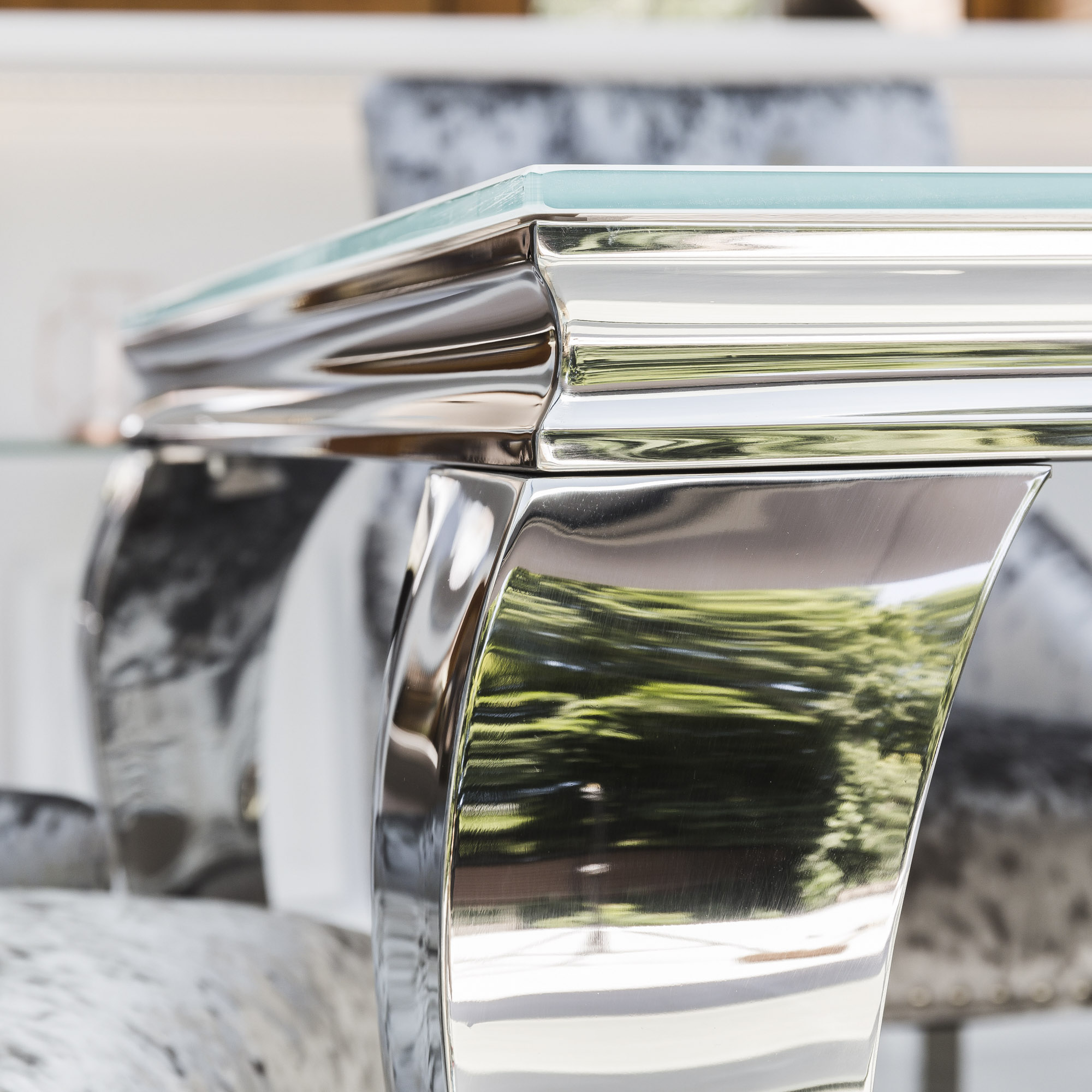 The combination of the white glass and polished stainless steel results in a dining table which is sure to make an impression on any visitors, and results in an evergreen appearance to ensure that this luxury dining table becomes a long term addition to your abode,