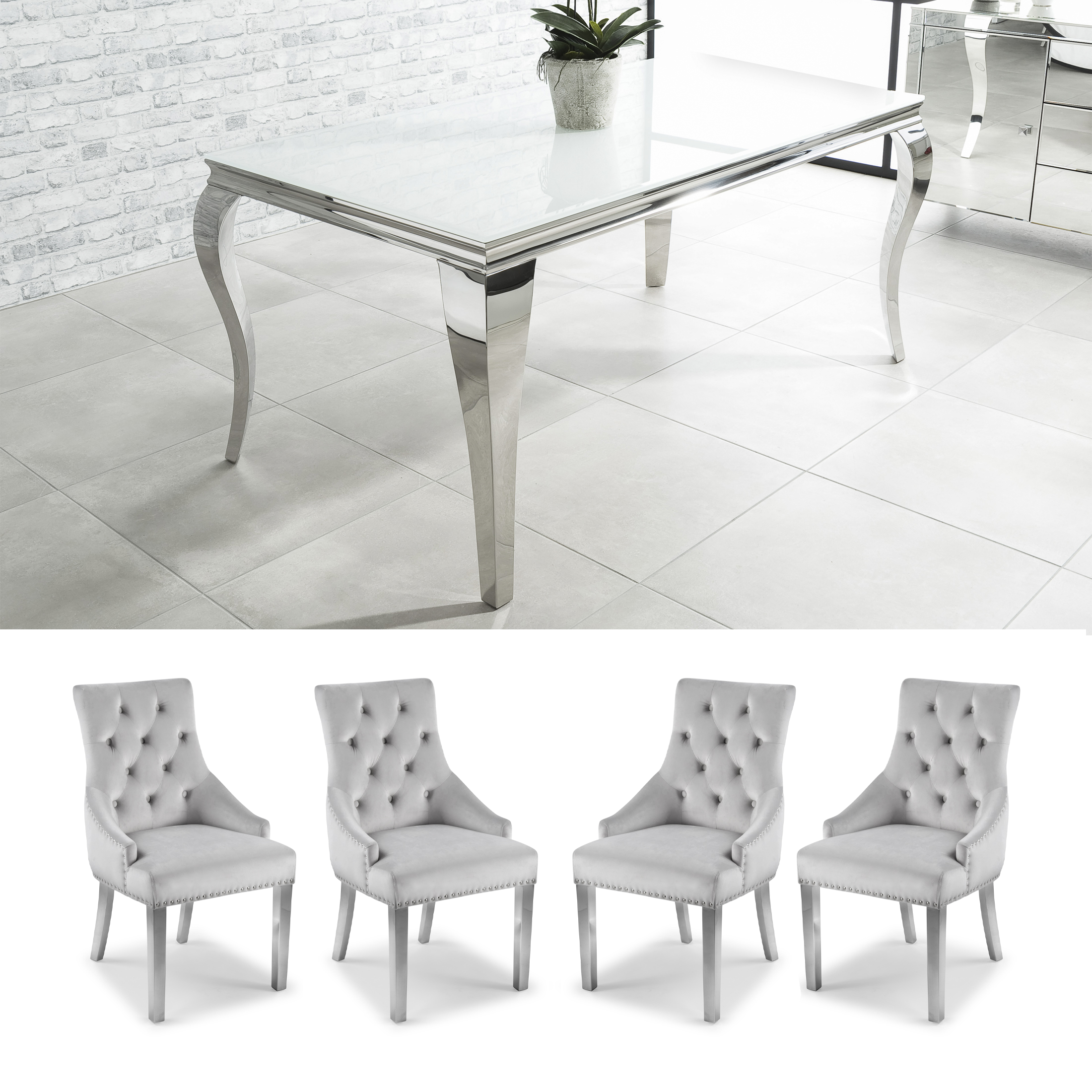 Louis Polished Steel Dining Table with White Glass & 4 Chelsea Light Grey Brushed Velvet Dining Chairs