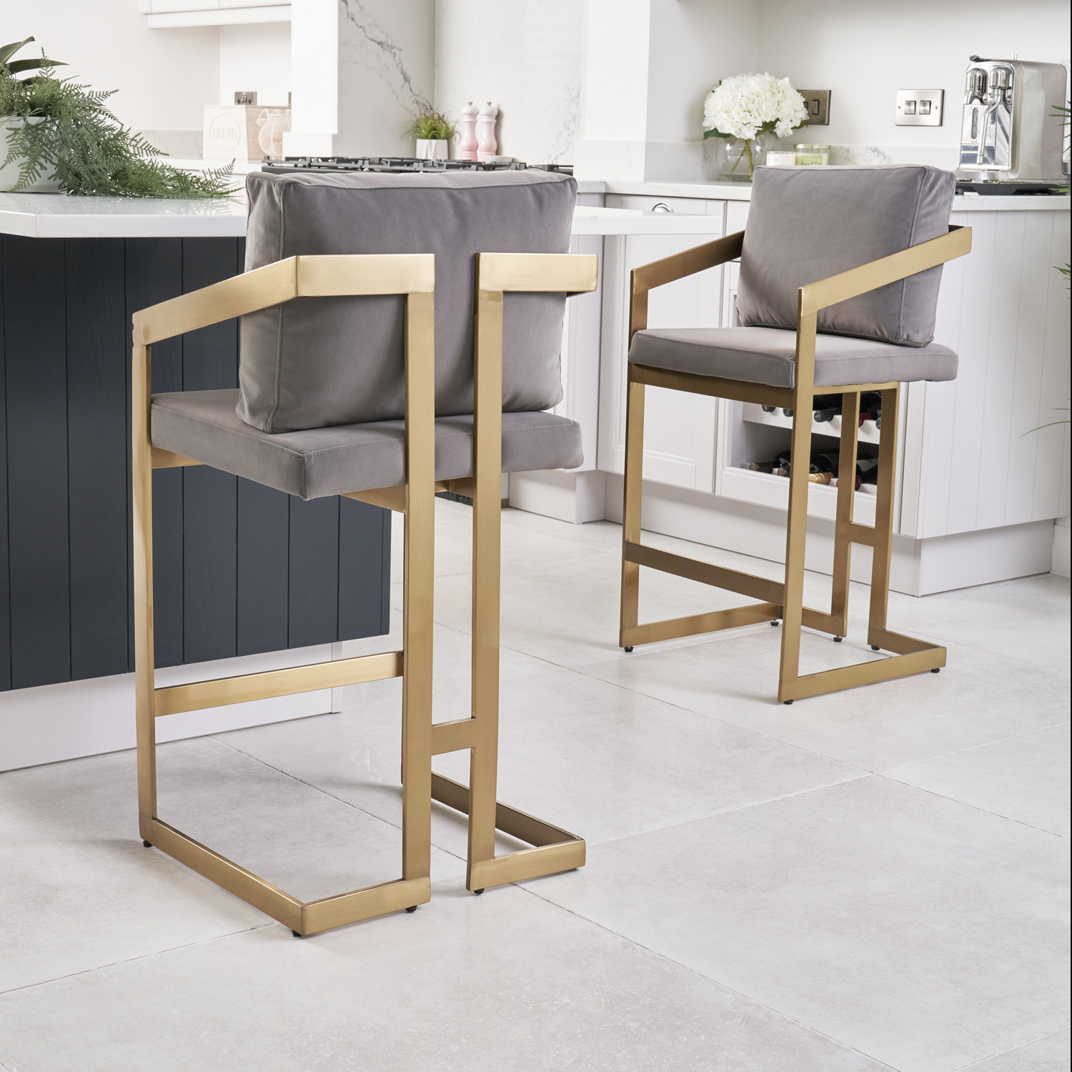 If you enjoy entertaining guests or just want a comfy place to sit in your kitchen/bar, then look no further than these Alexandra counter bar stool which is upholstered in a smooth grey brushed velvet upholstery. The soft is designed to offer you plenty of support with a loose velvet cushion. Featuring a matt gold stainless steel frame with footrest.