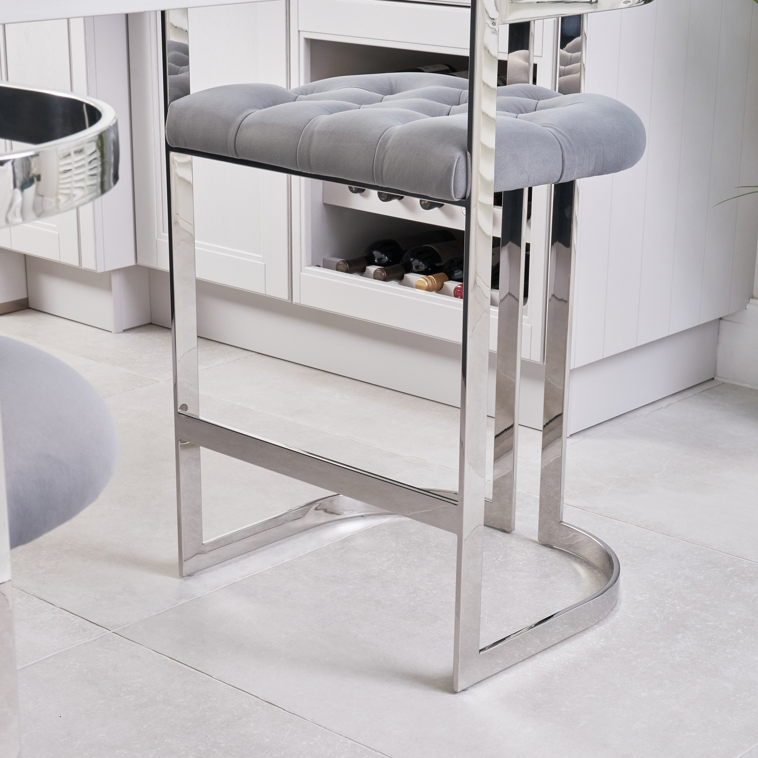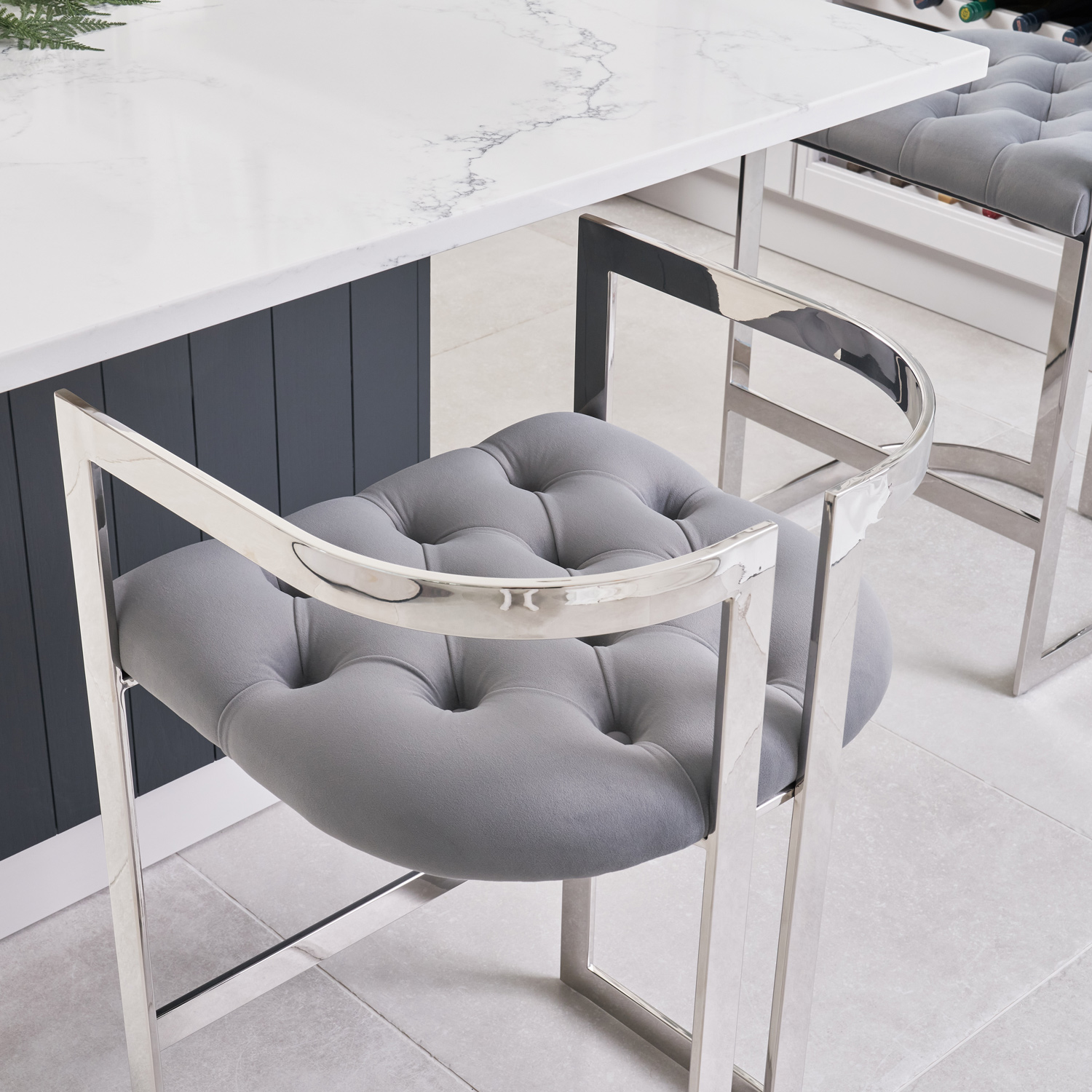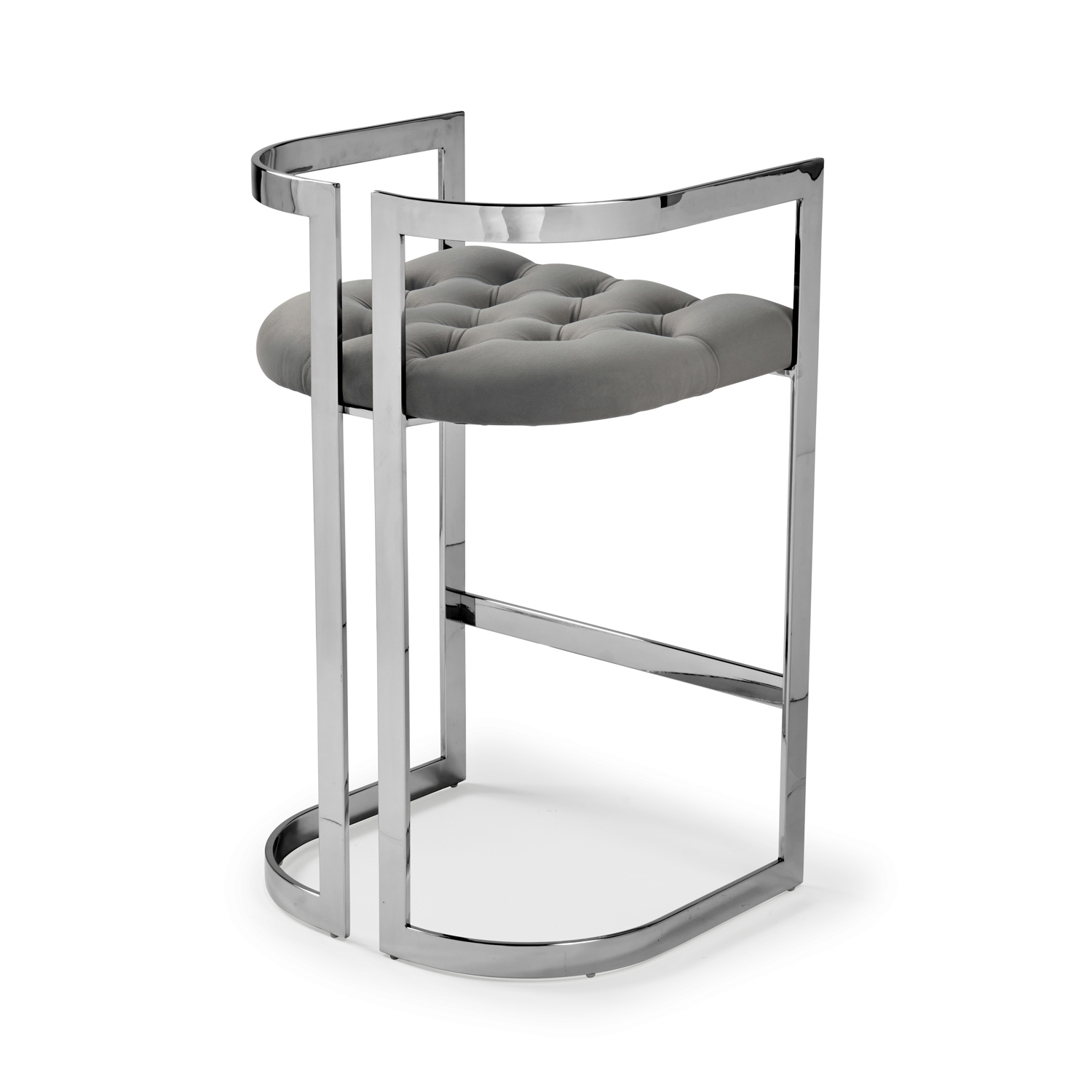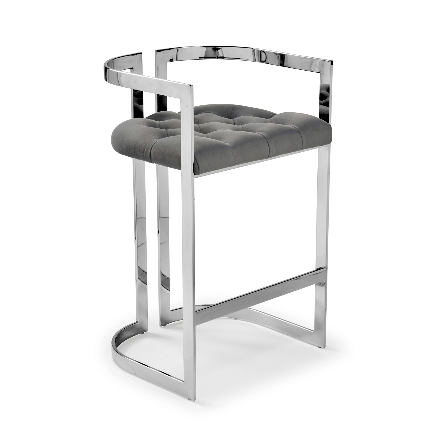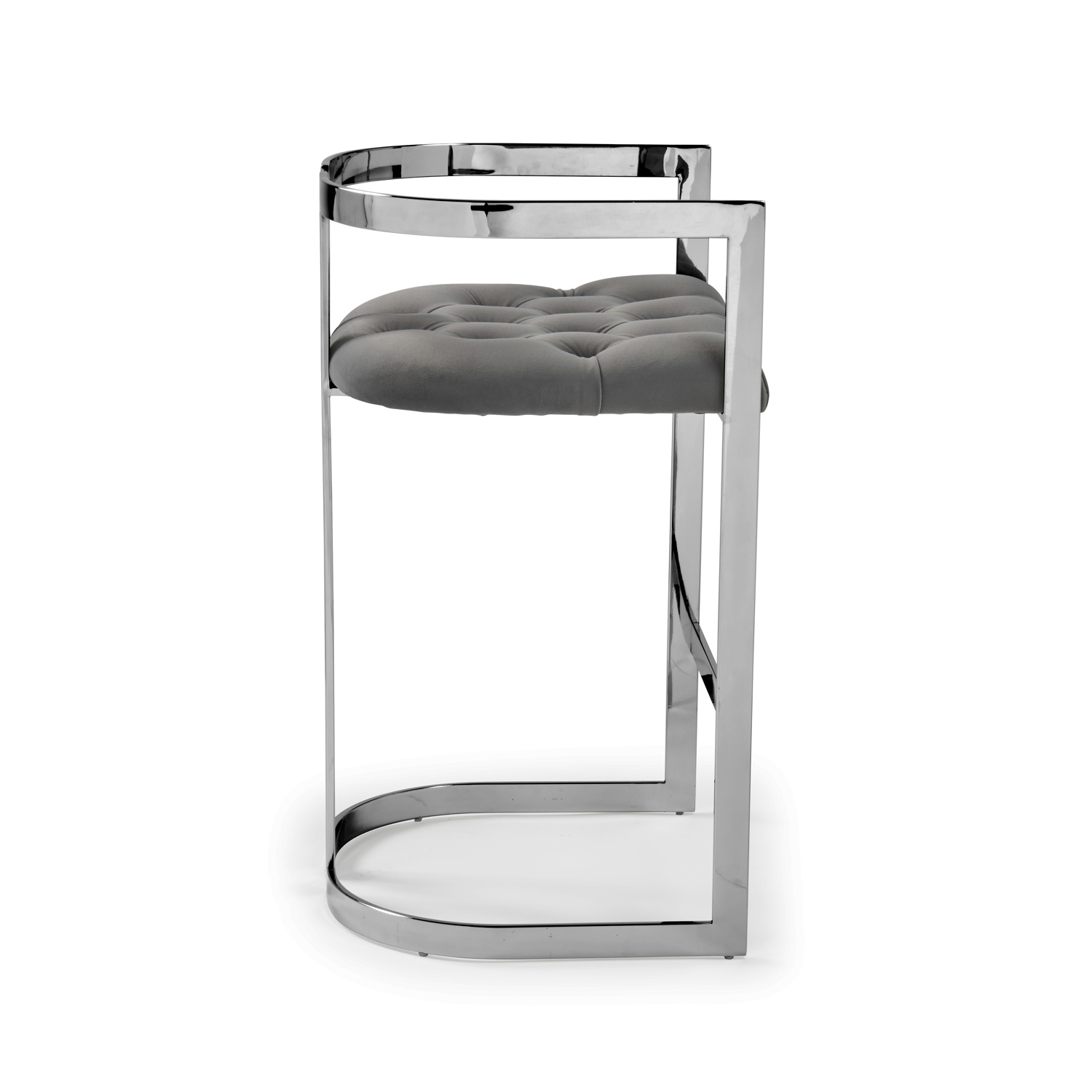 Blend style and comfort when you take ownership of this beautiful grey velvet buttoned counter stool with its luxurious polished stainless steel frame.