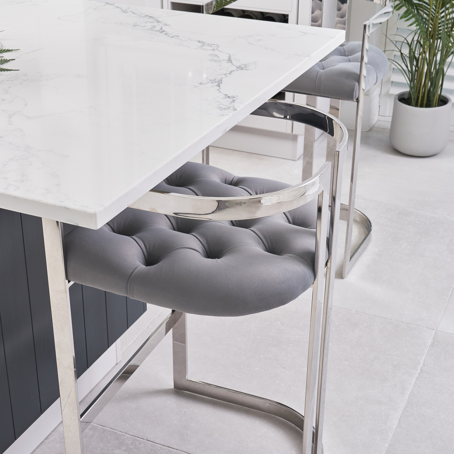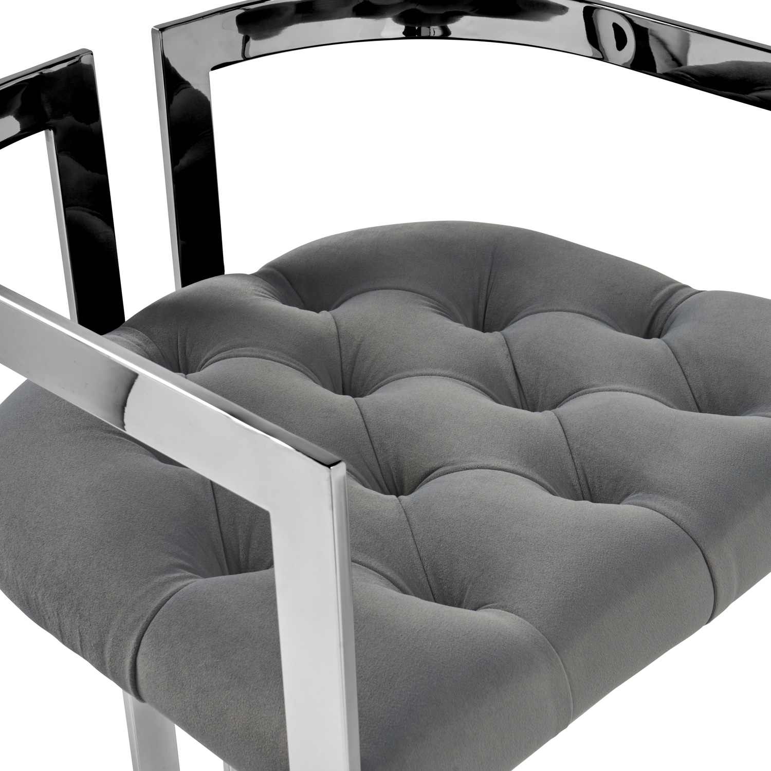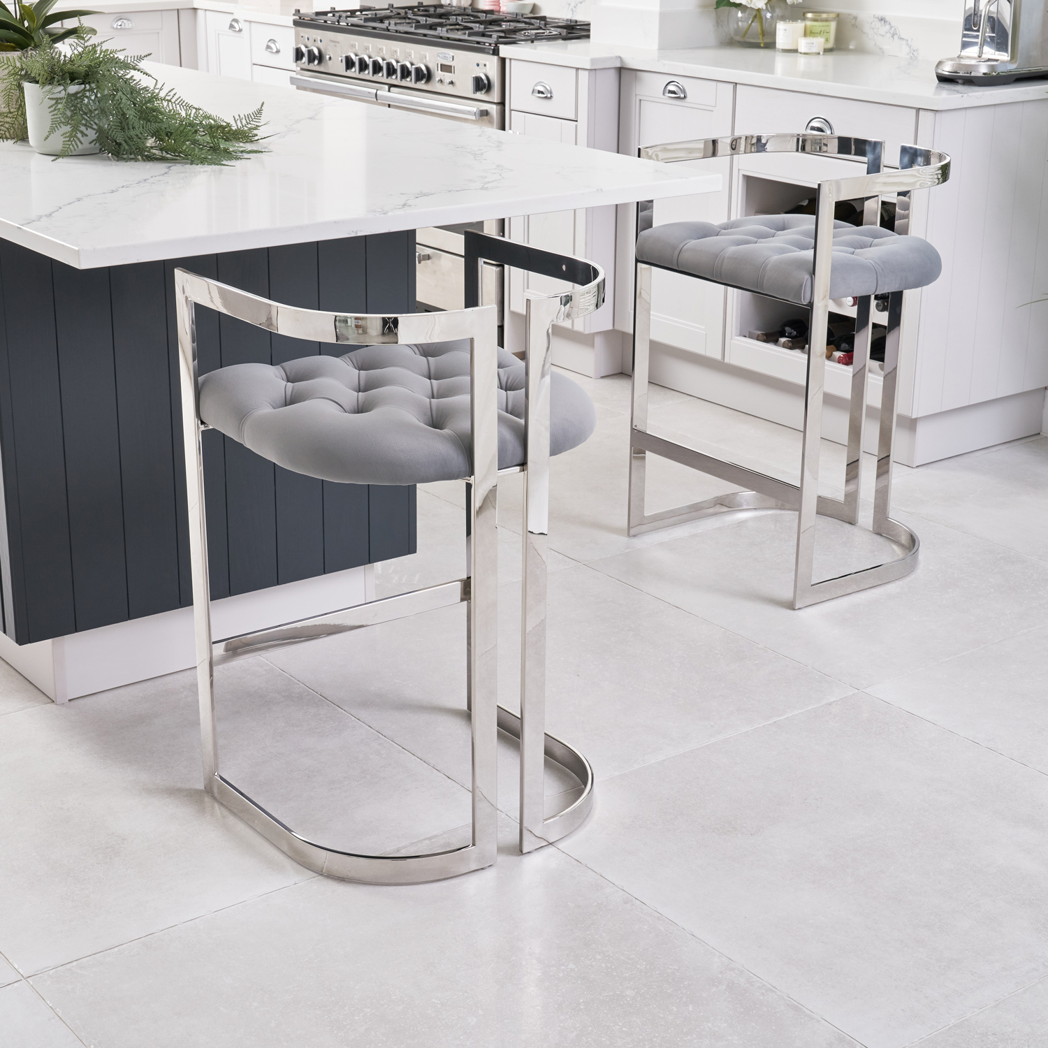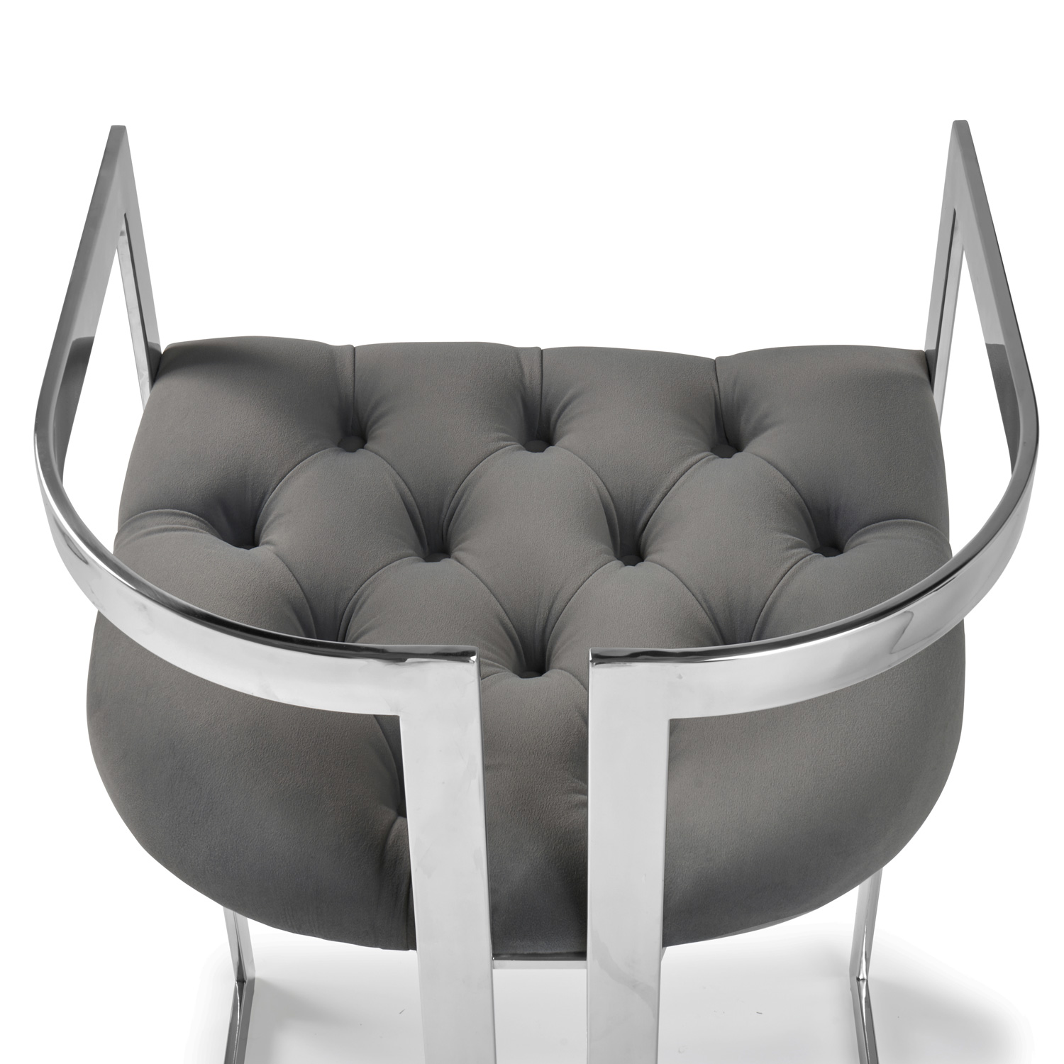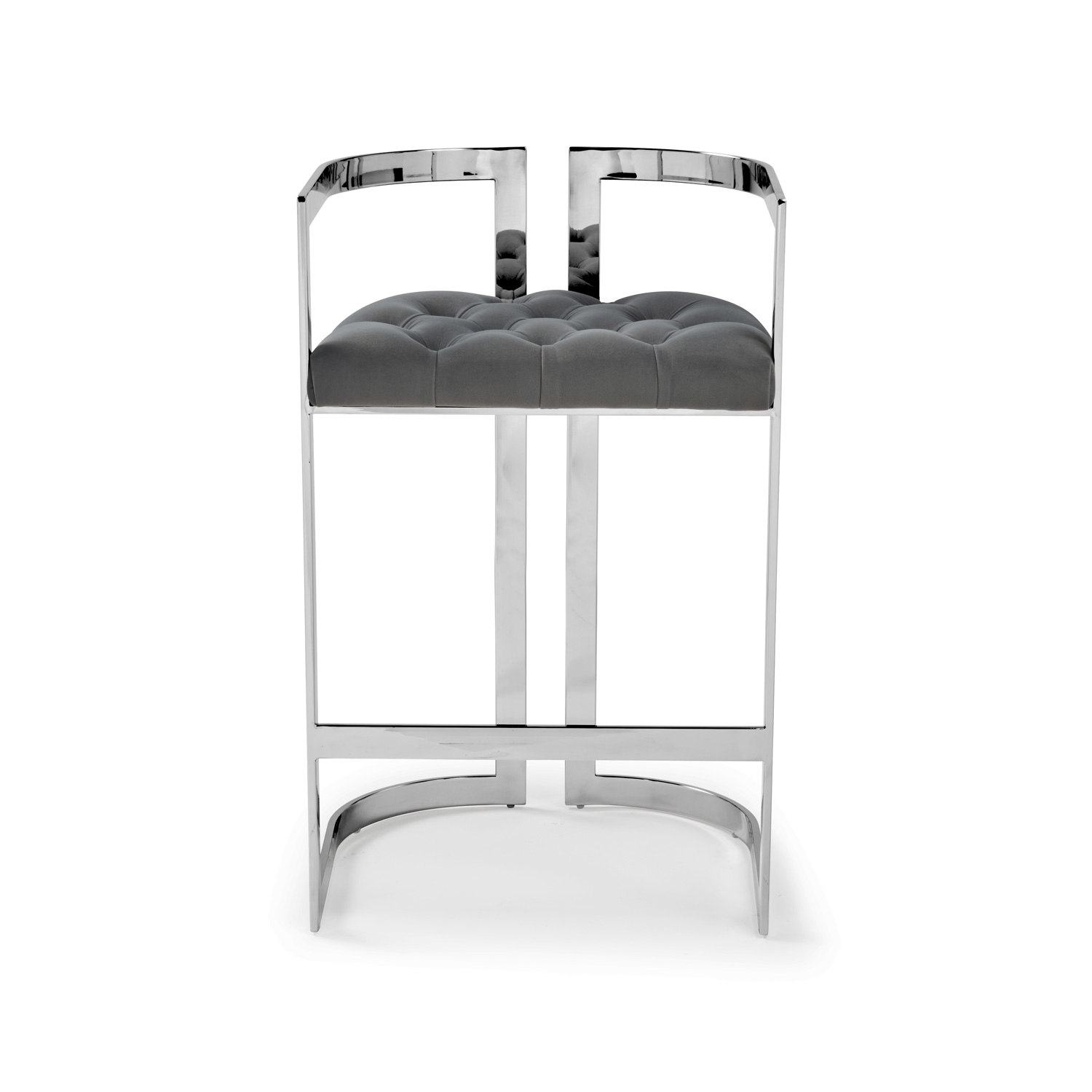 Blend style and comfort when you take ownership of this beautiful grey velvet buttoned counter stool with its luxurious polished stainless steel frame.