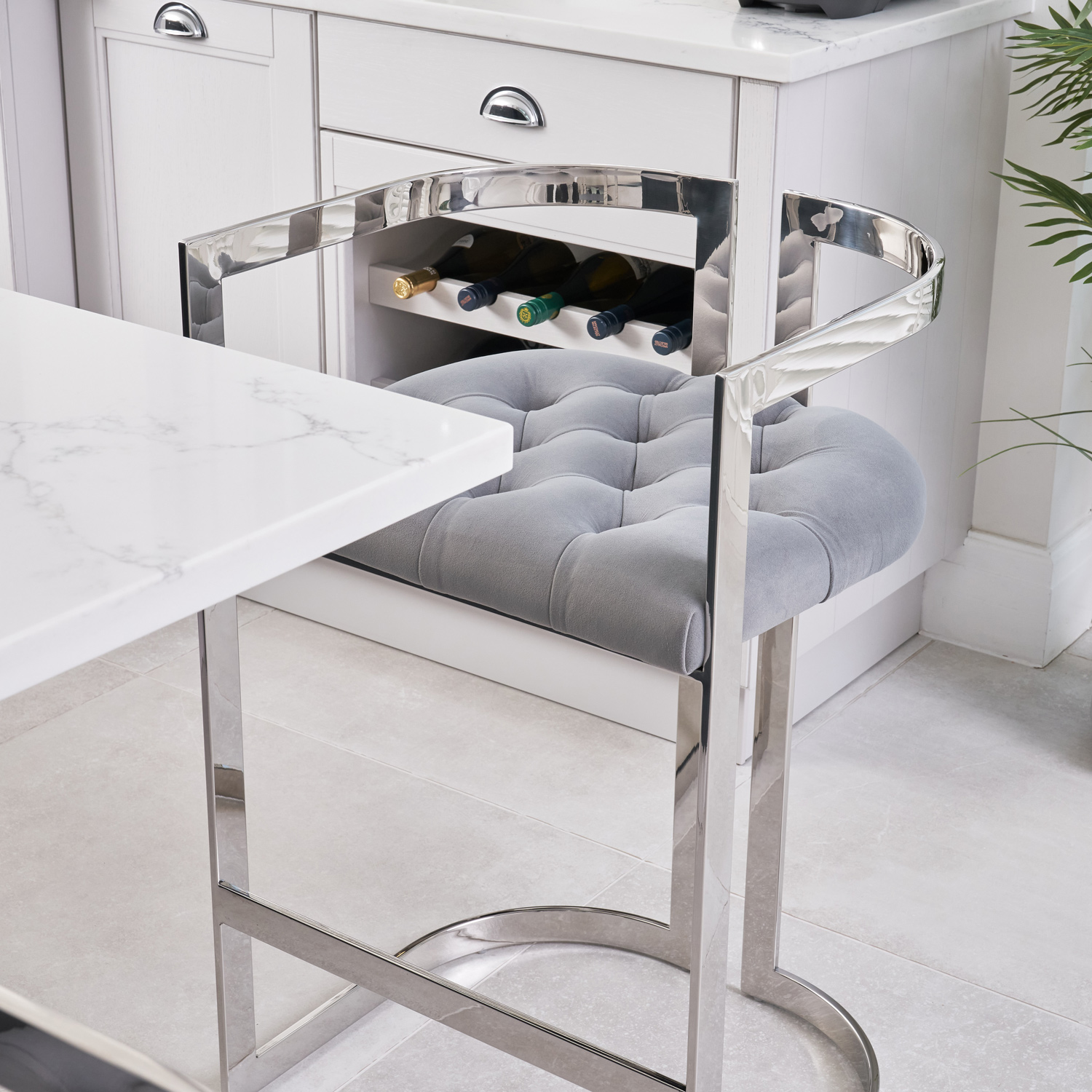 With its elegant curved polished steel backrest and deep button padding, this is a bar stool which offers supreme levels of comfort in addition to adding to the décor of the room. You can be sure that it will stand the test of time thanks to the beautifully crafted grey velvet upholstery which has been manufactured using a traditional weaving technique. This may take longer to craft, but is the only way of ensuring that levels of quality that Grosvenor Furniture demand as standard as it helps to ensure a surface which is both easy to clean and resistant to abrasion.