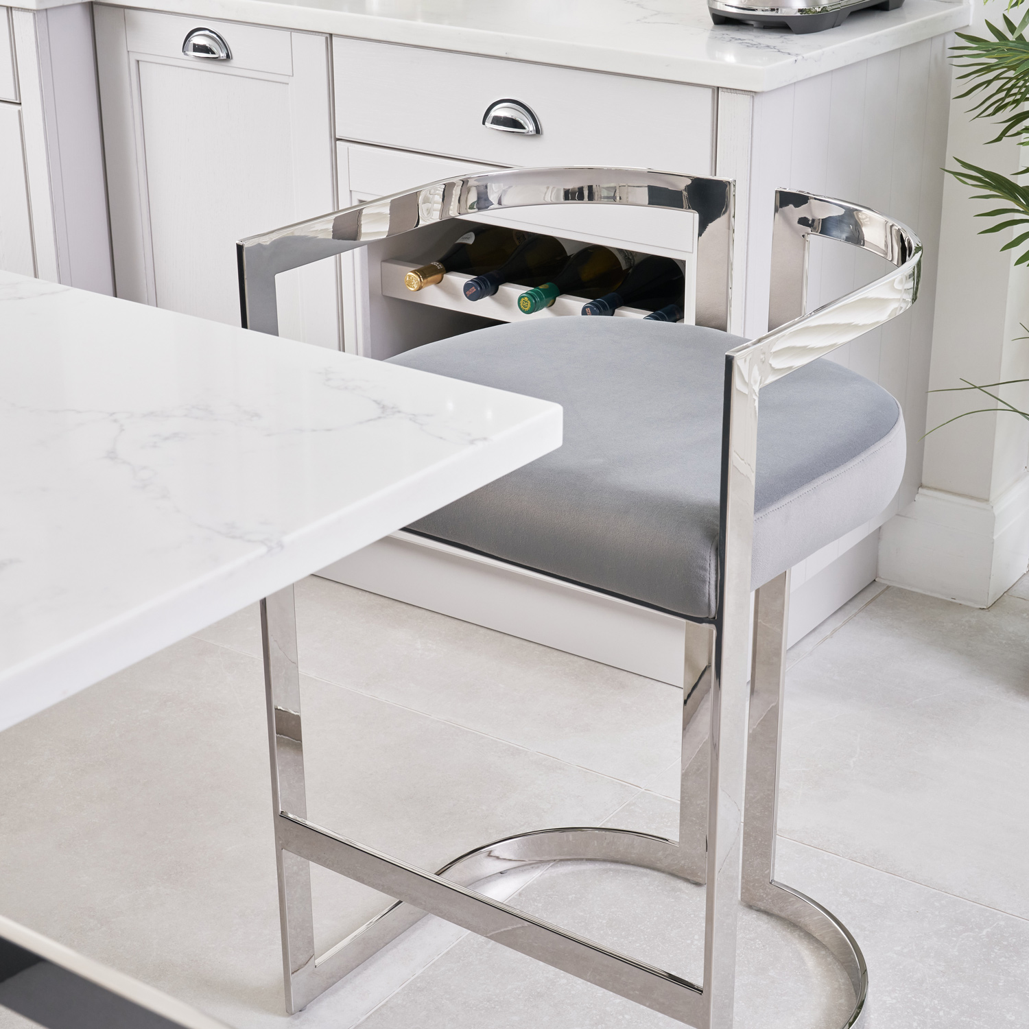 With its elegant curved polished steel backrest and deep upholstered padding, this is a bar stool which offers supreme levels of comfort in addition to adding to the décor of the room. You can be sure that it will stand the test of time thanks to the beautifully crafted grey velvet upholstery which has been manufactured using a traditional weaving technique. This may take longer to craft, but is the only way of ensuring that levels of quality that Grosvenor Furniture demand as standard as it helps to ensure a surface which is both easy to clean and resistant to abrasion.