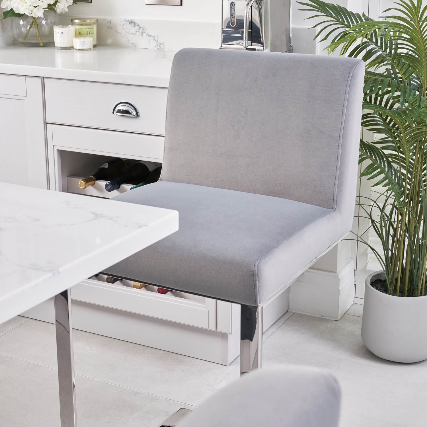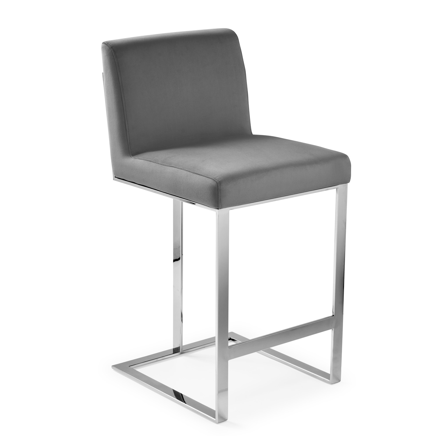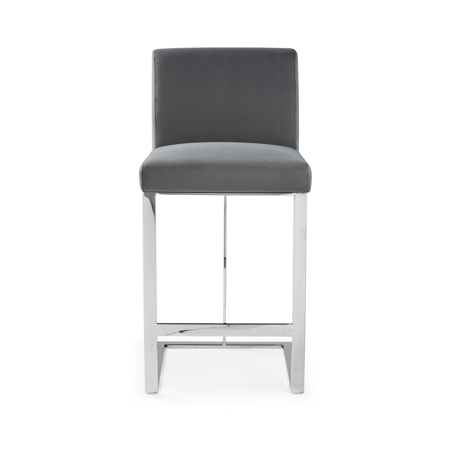 Blend style and comfort when you take ownership of this beautiful grey velvet counter stool with its luxurious polished stainless steel frame.