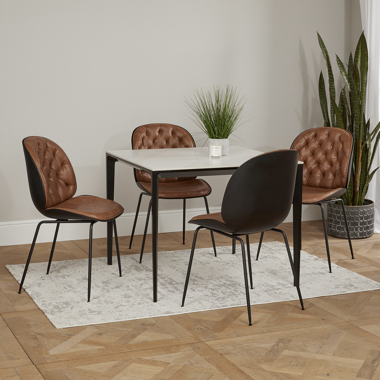 The set is finished with 4 of our Thiago Brown Tan Faux Leather Dining Chairs which are upholstered in a PU which is made of Eco-leather and recycled leather.