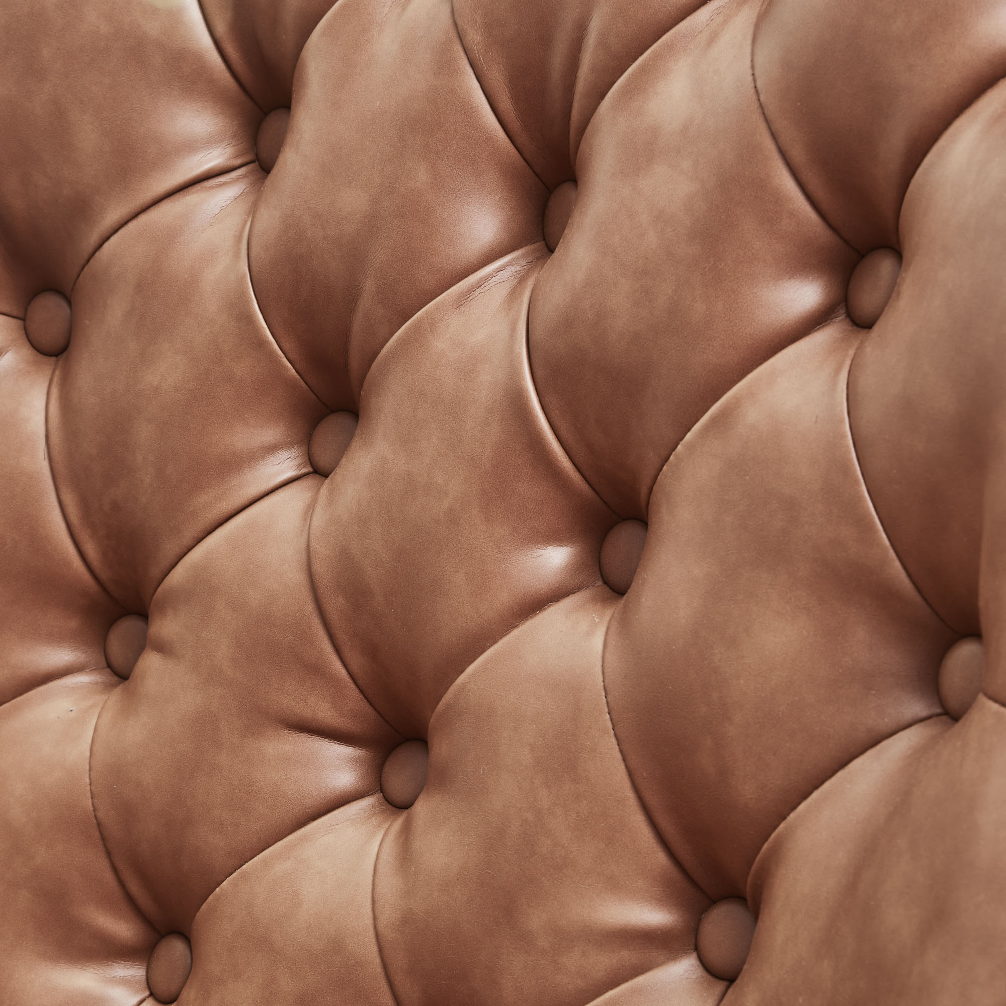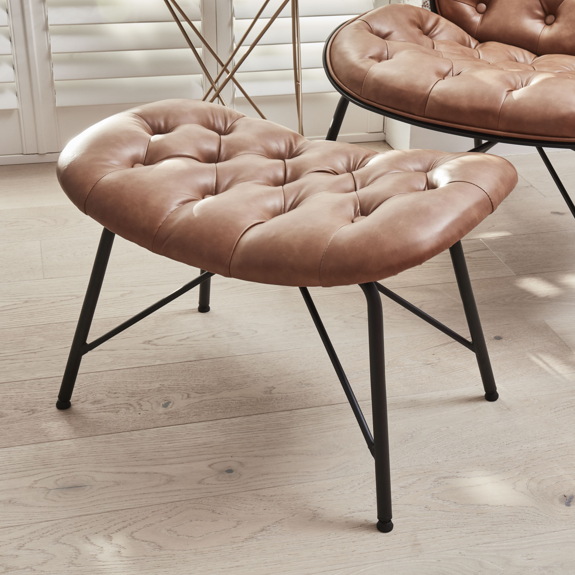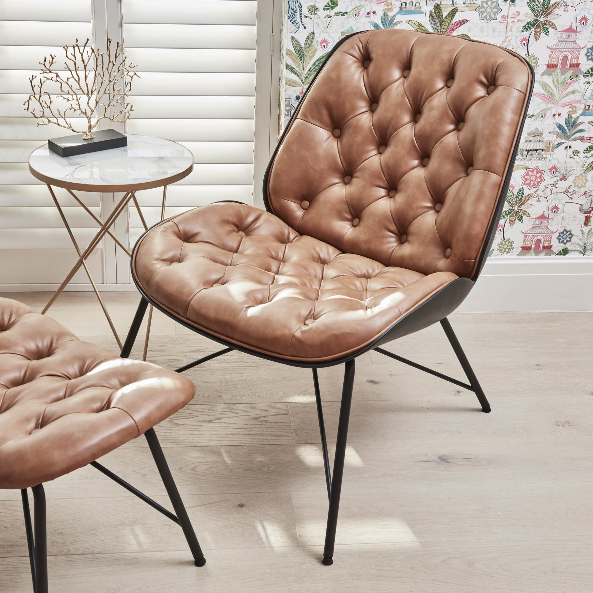 Belvedere Chesterfield Lounge Chair with Footstool In A Tan Brown Faux Leather
