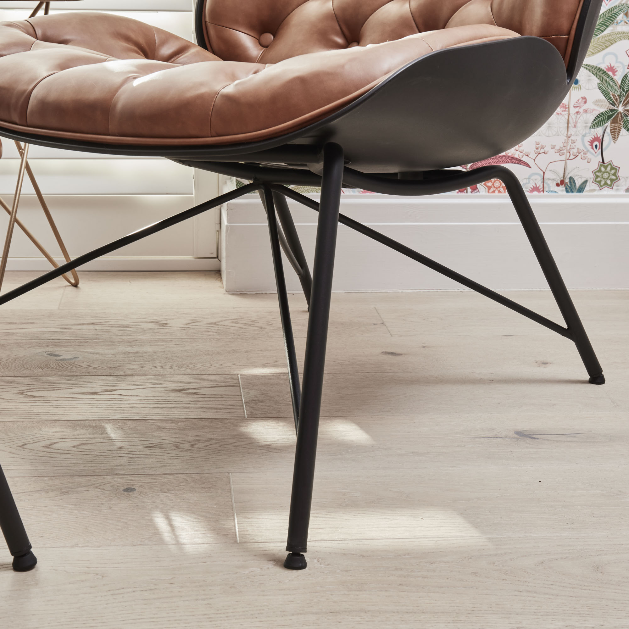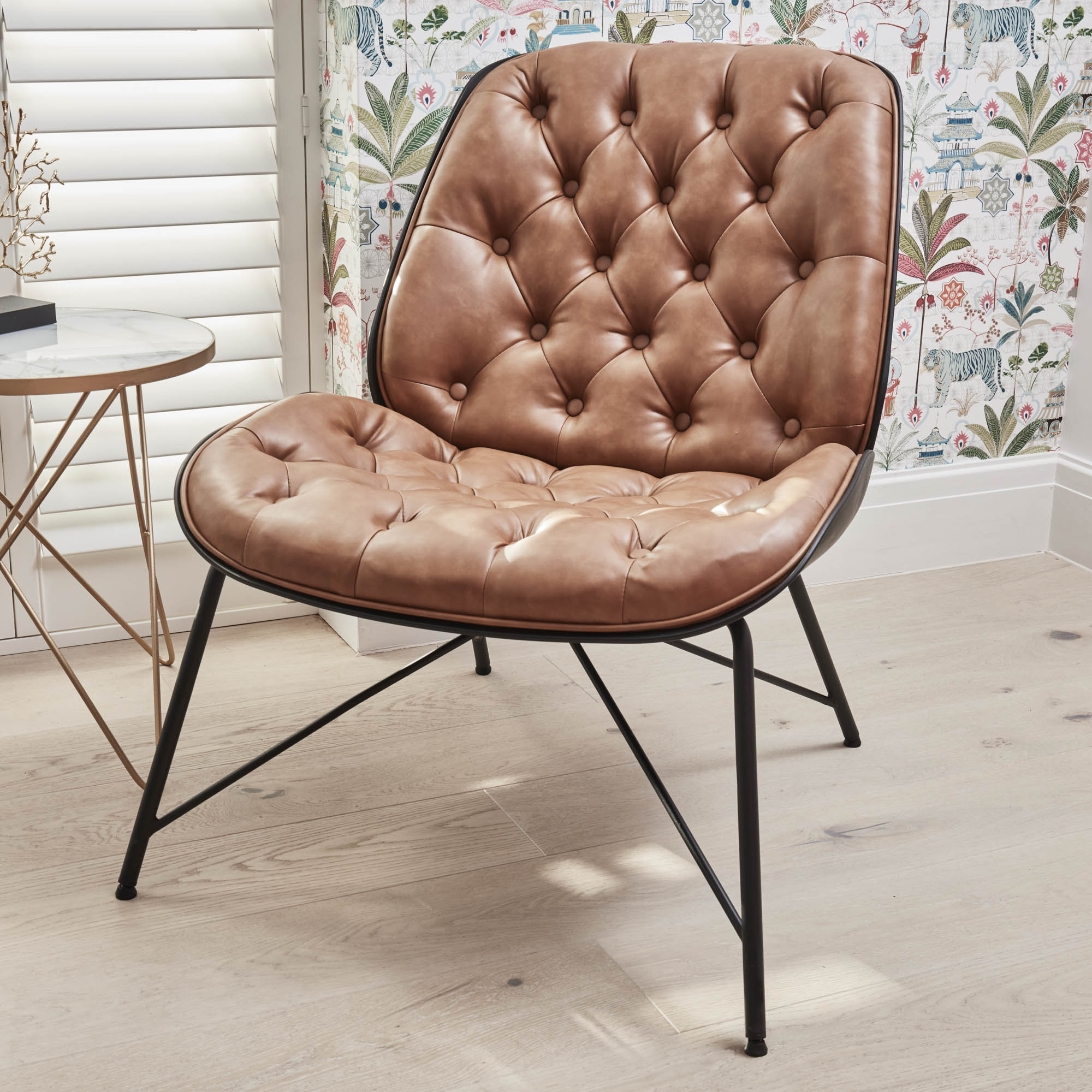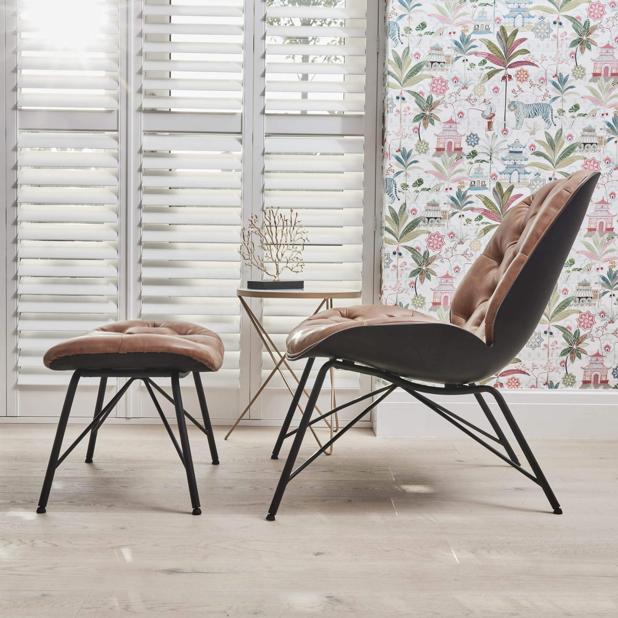 Belvedere Chesterfield Lounge Chair with Footstool In A Tan Brown Faux Leather