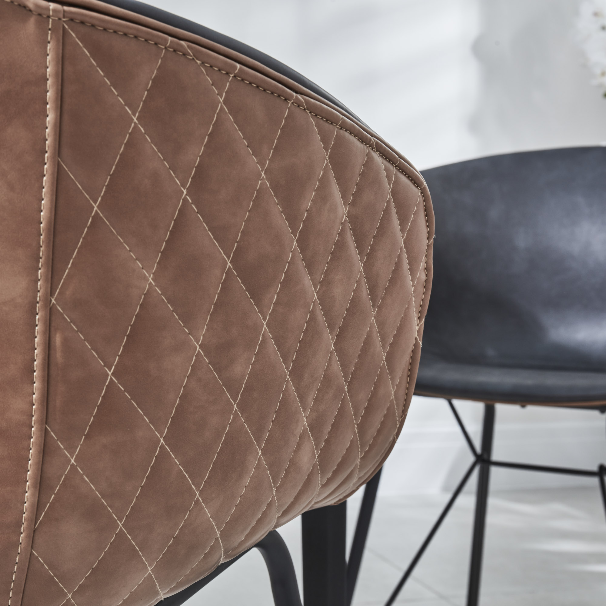 Show casing diamond quilted stitching around the external of the seat, the highest of quality Tan & Grey PU which runs all the way round with a fixed black Satin powder coated base.
