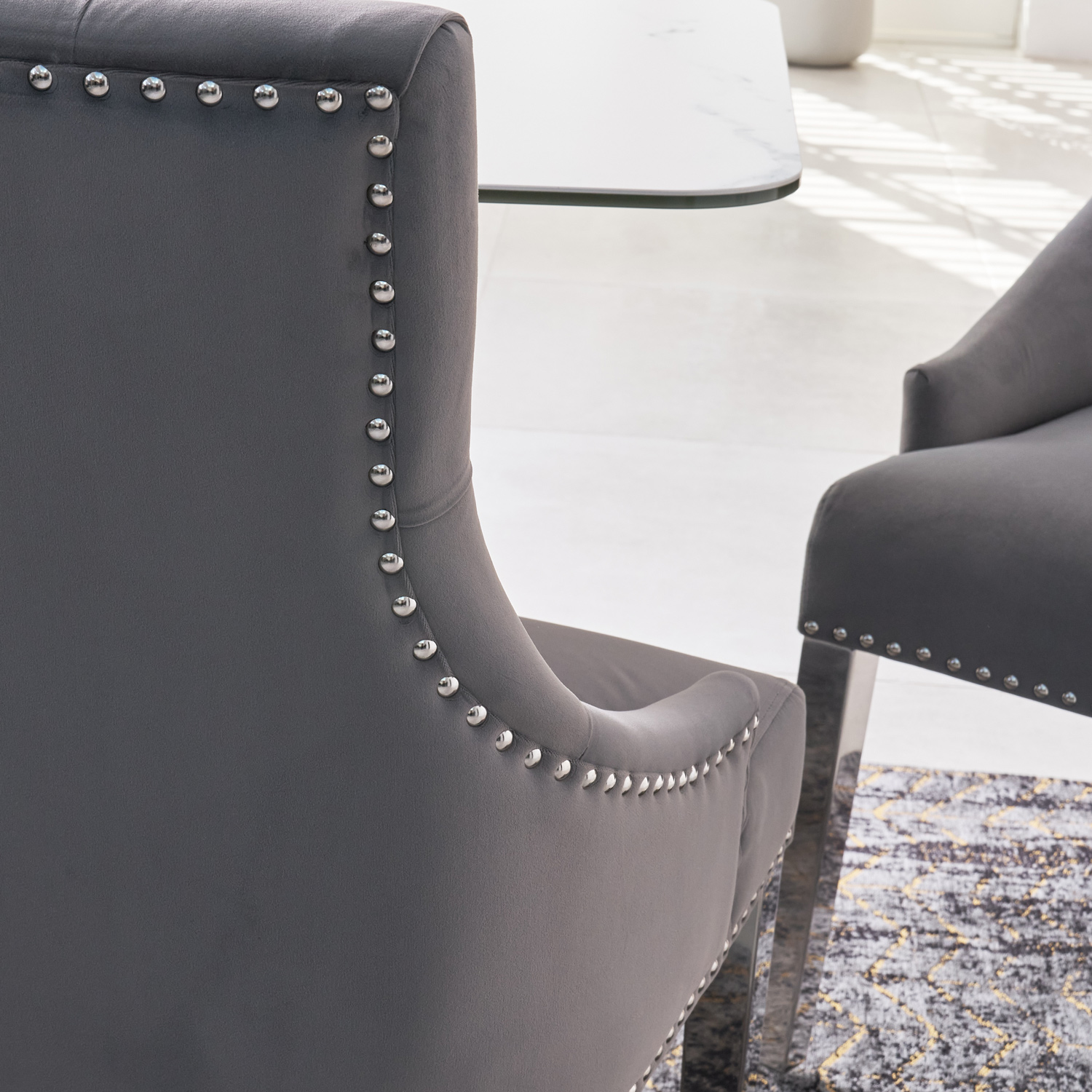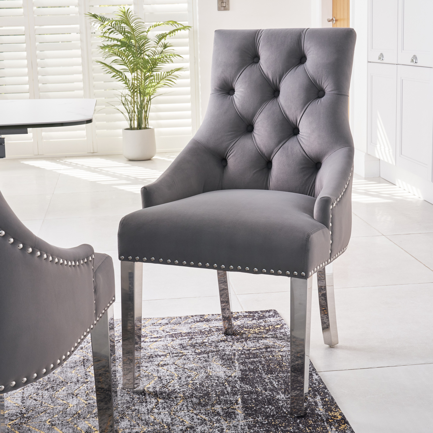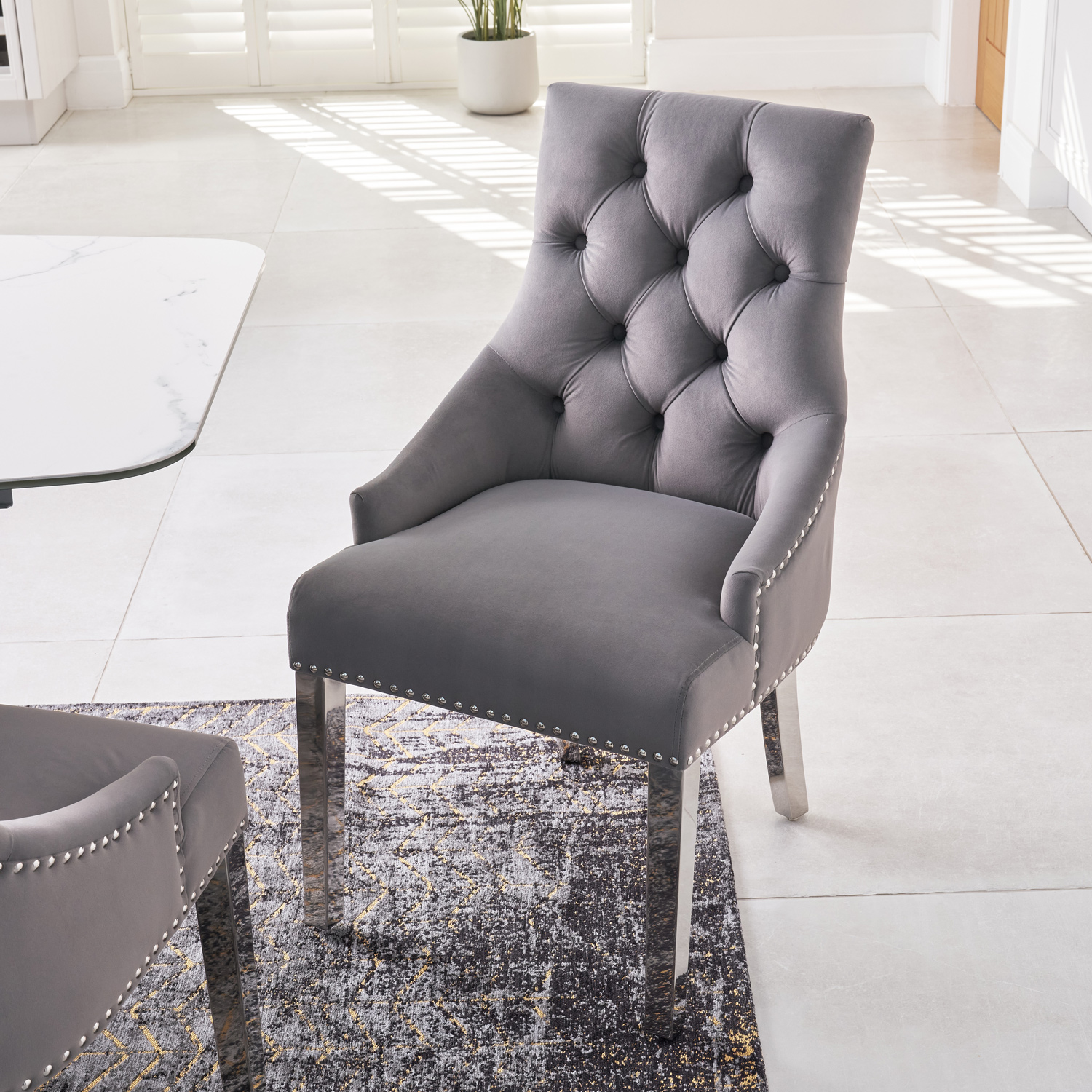 Chelsea Grey Brushed Velvet Scoop Back Dining Chair Silver Studs – Polished Steel Legs