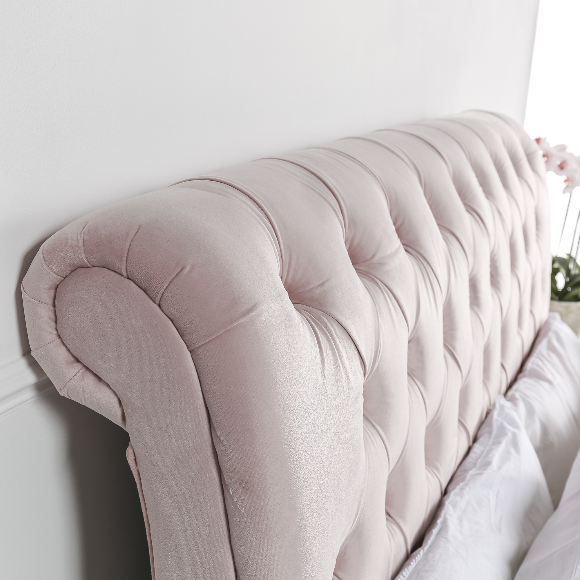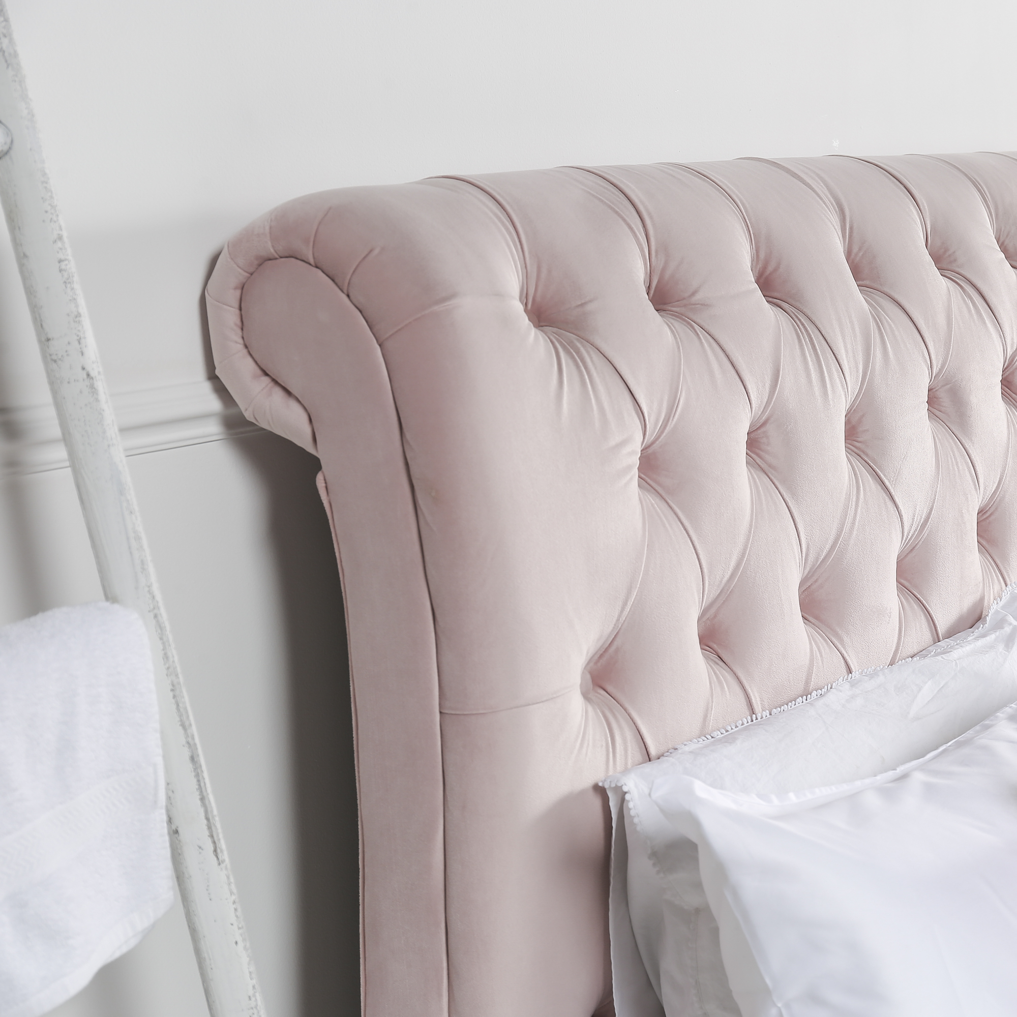 Make the most of your time in bed with this new, improved classic Chesterfield King Size bed which comes with luxury pink velvet upholstery.
