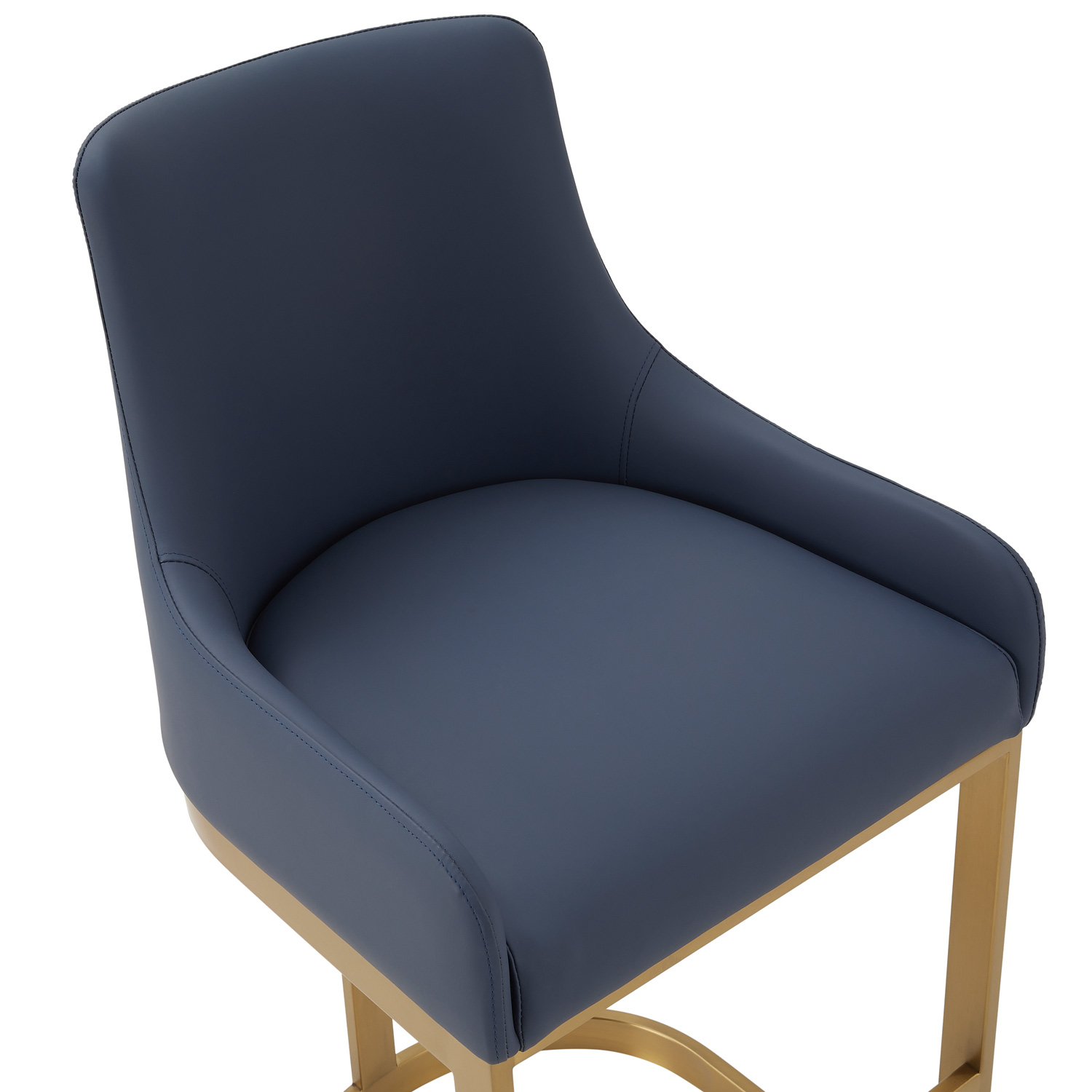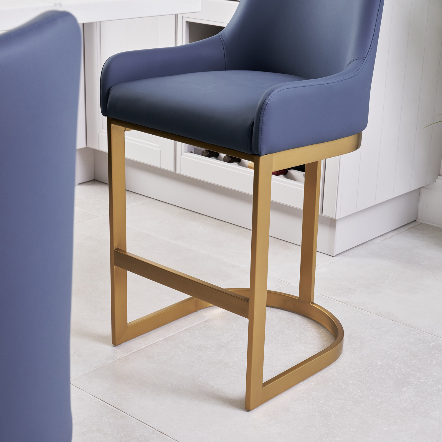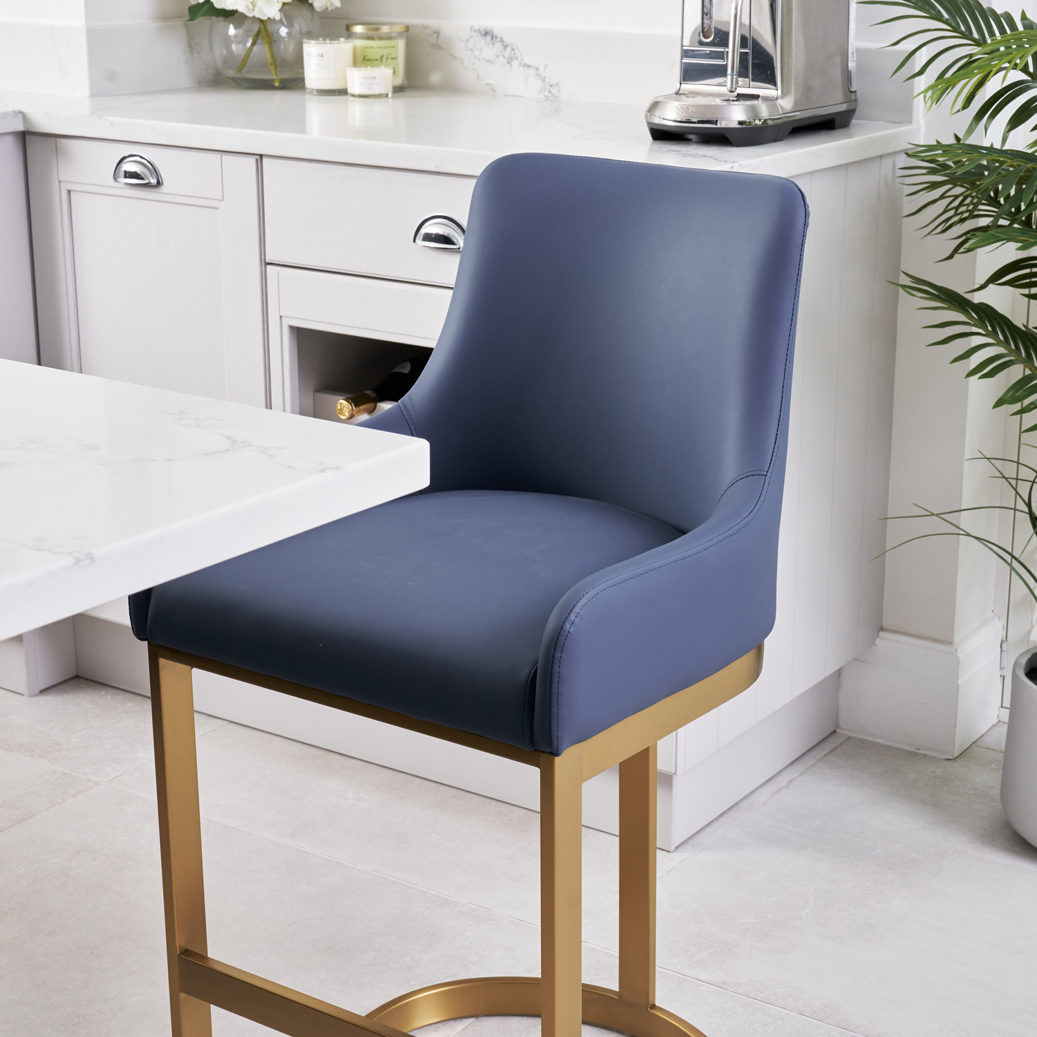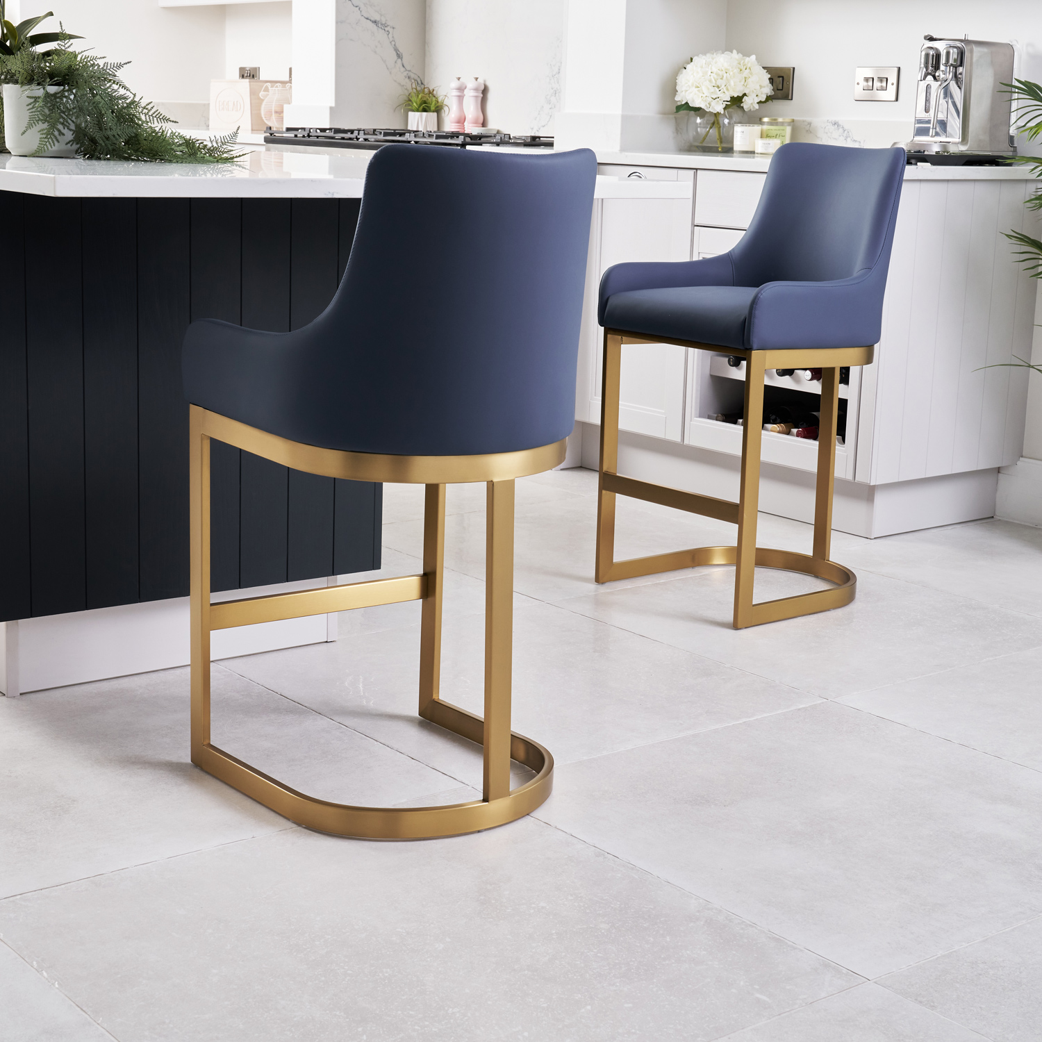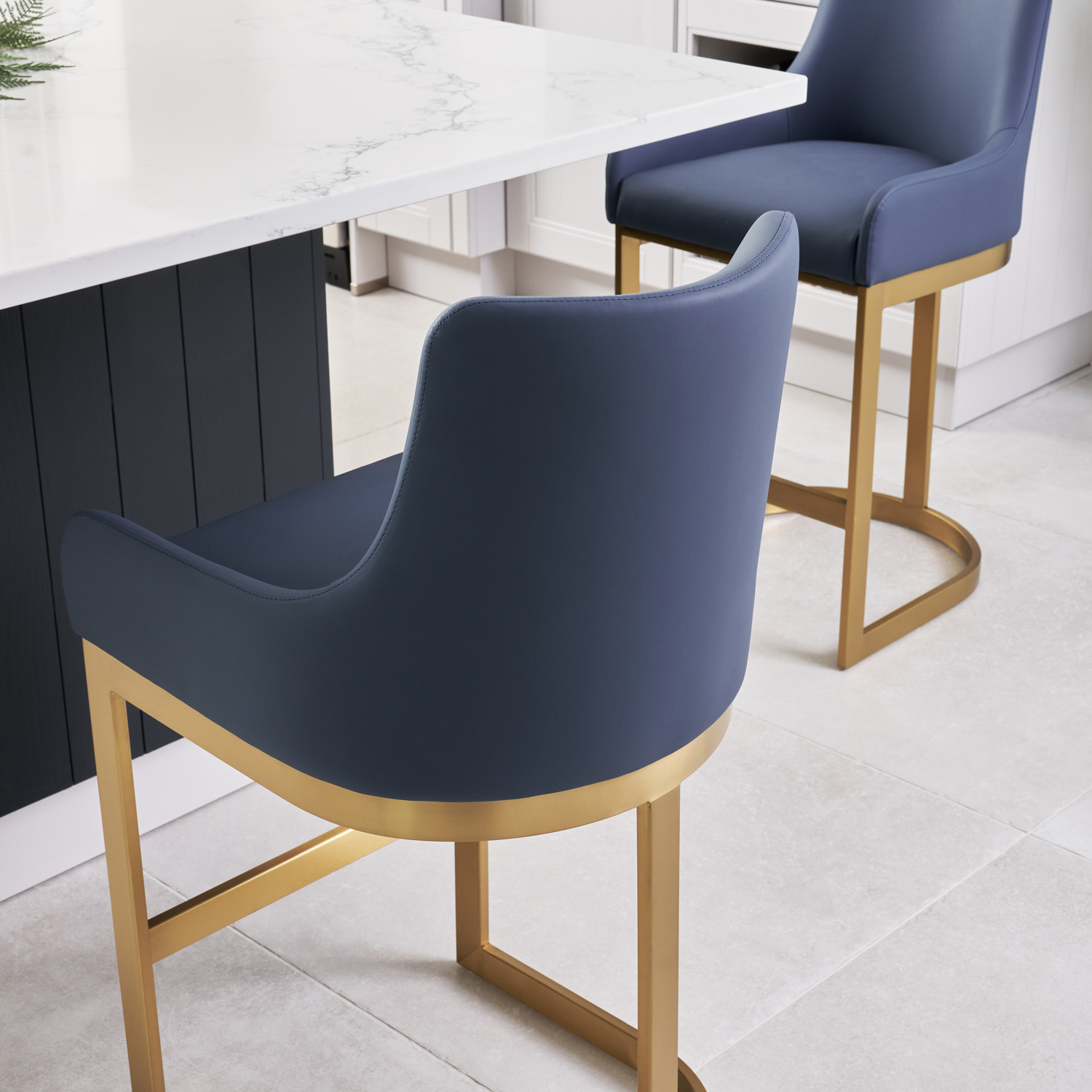 If you enjoy entertaining guests or just want a comfy place to sit in your kitchen island, then look no further than these Clara counter bar stools which are upholstered in a smooth Blue Faux leather upholstery. The soft padding runs all the way up the curved backrest which has been designed to offer you plenty of support. Featuring a elegant matt Gold steel frame with footrest.
