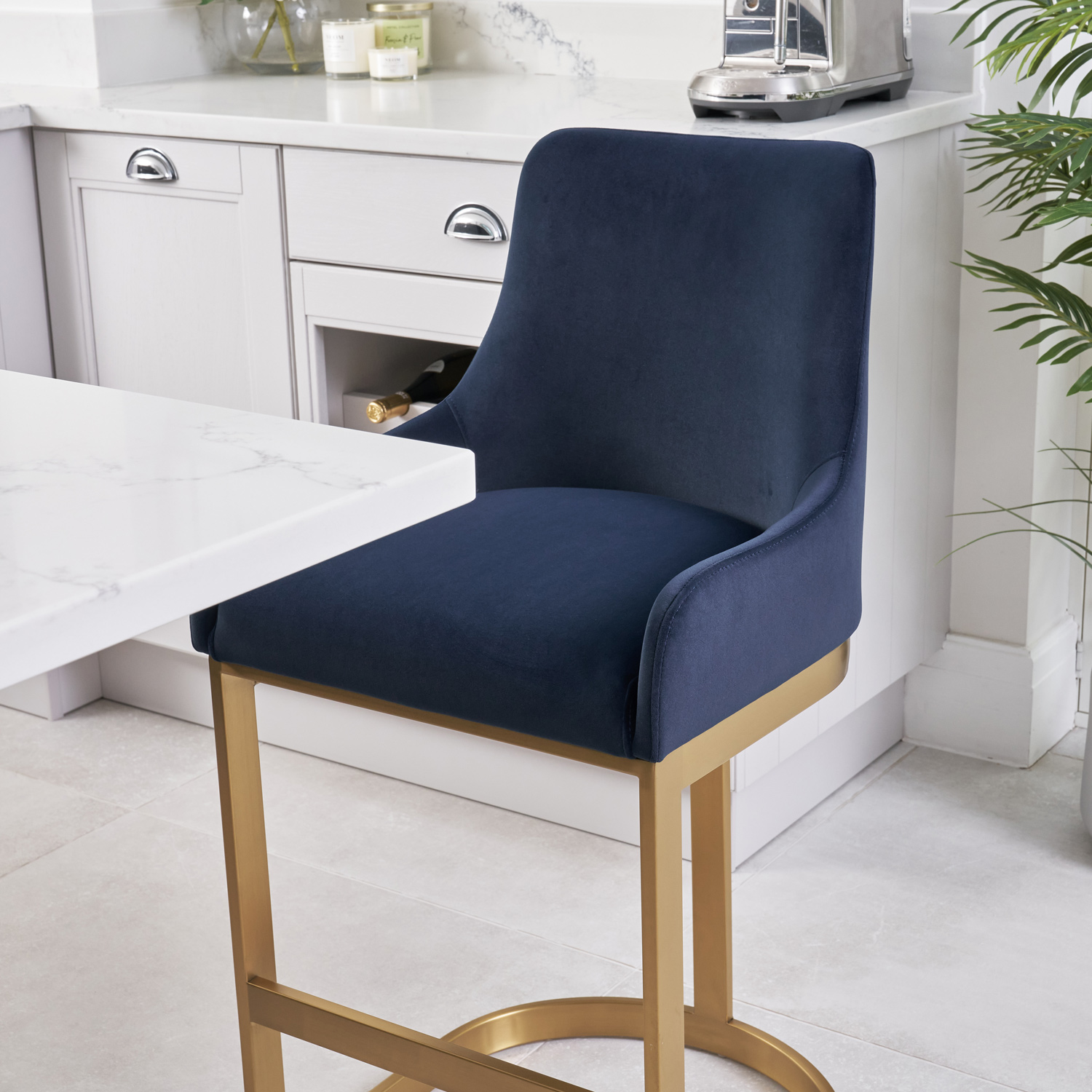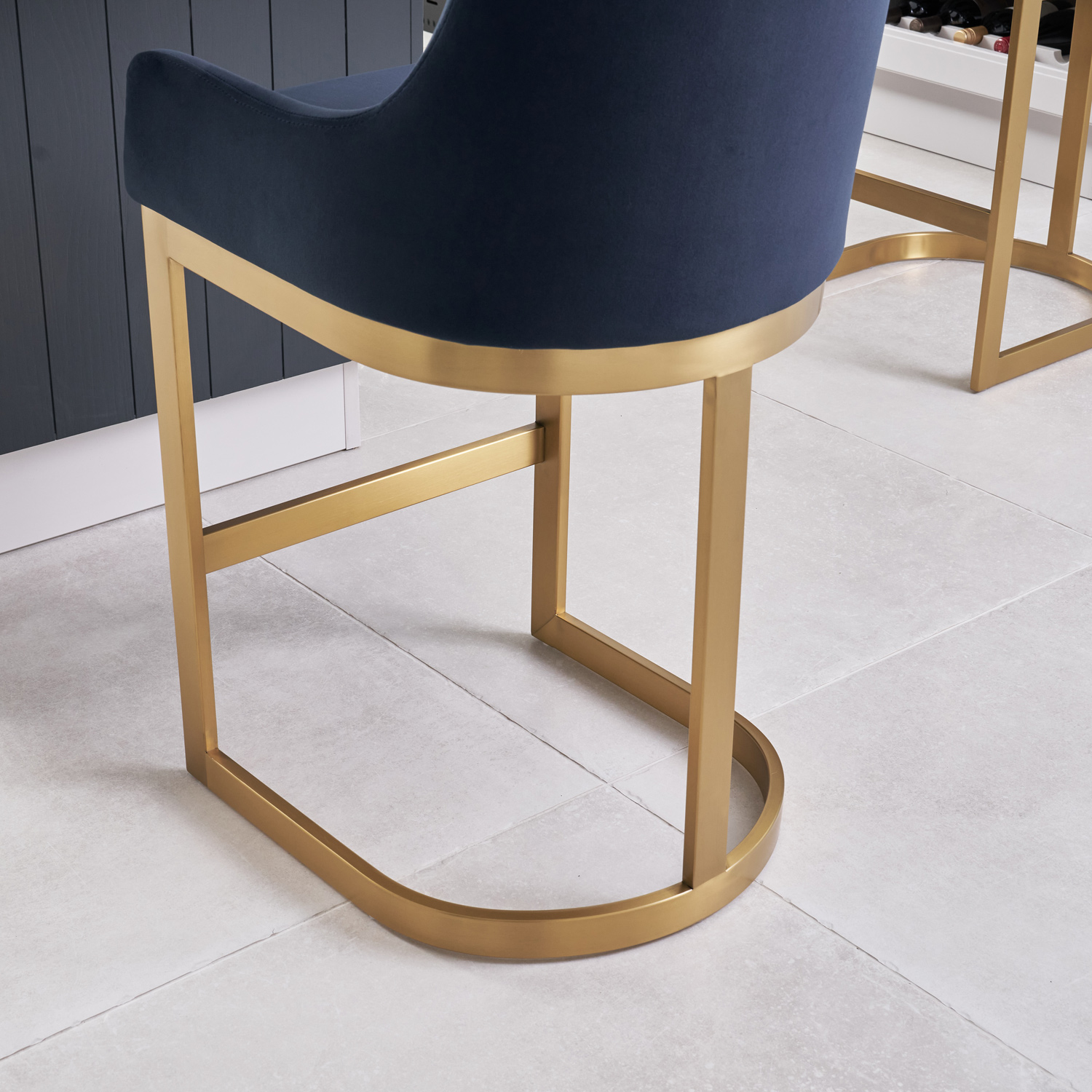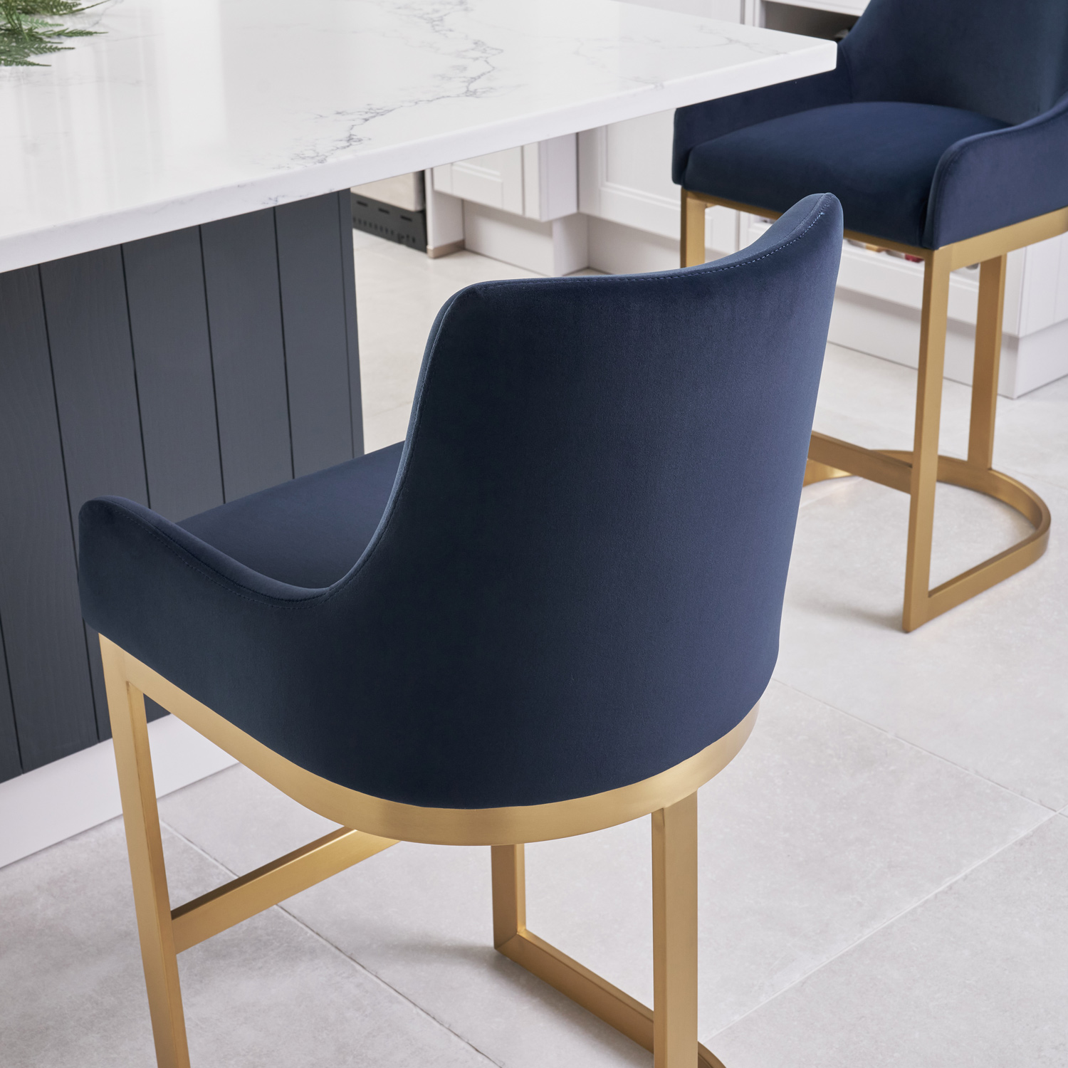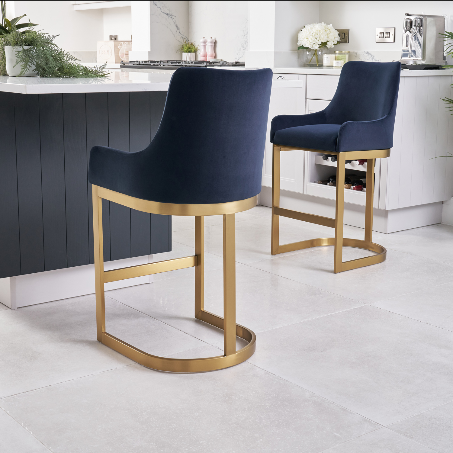 If you enjoy entertaining guests or just want a comfy place to sit in your kitchen island, then look no further than these Clara counter bar stools which are upholstered in a smooth dark blue velvet upholstery. The soft padding runs all the way up the curved backrest which has been designed to offer you plenty of support. Featuring a elegant matt Gold steel frame with footrest.