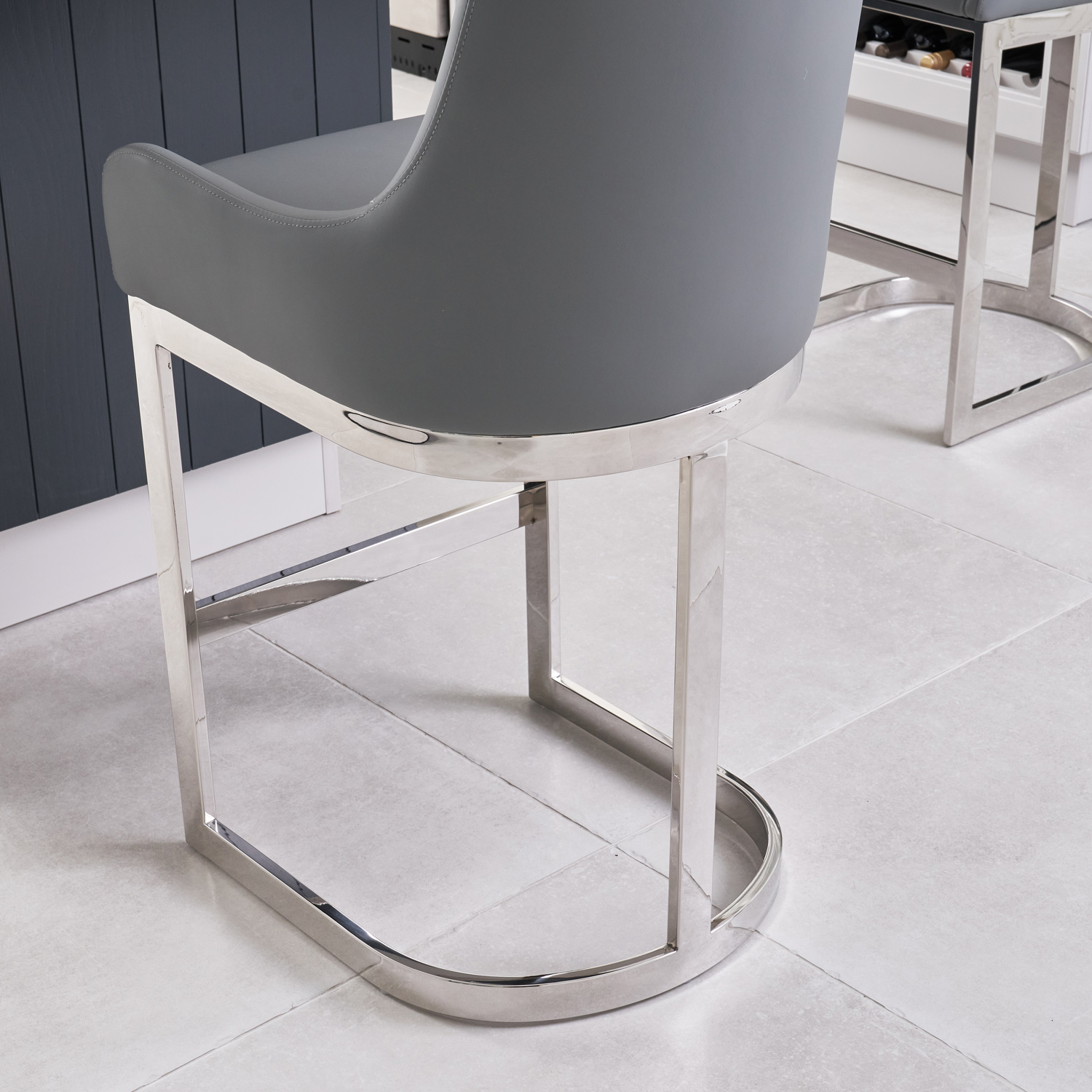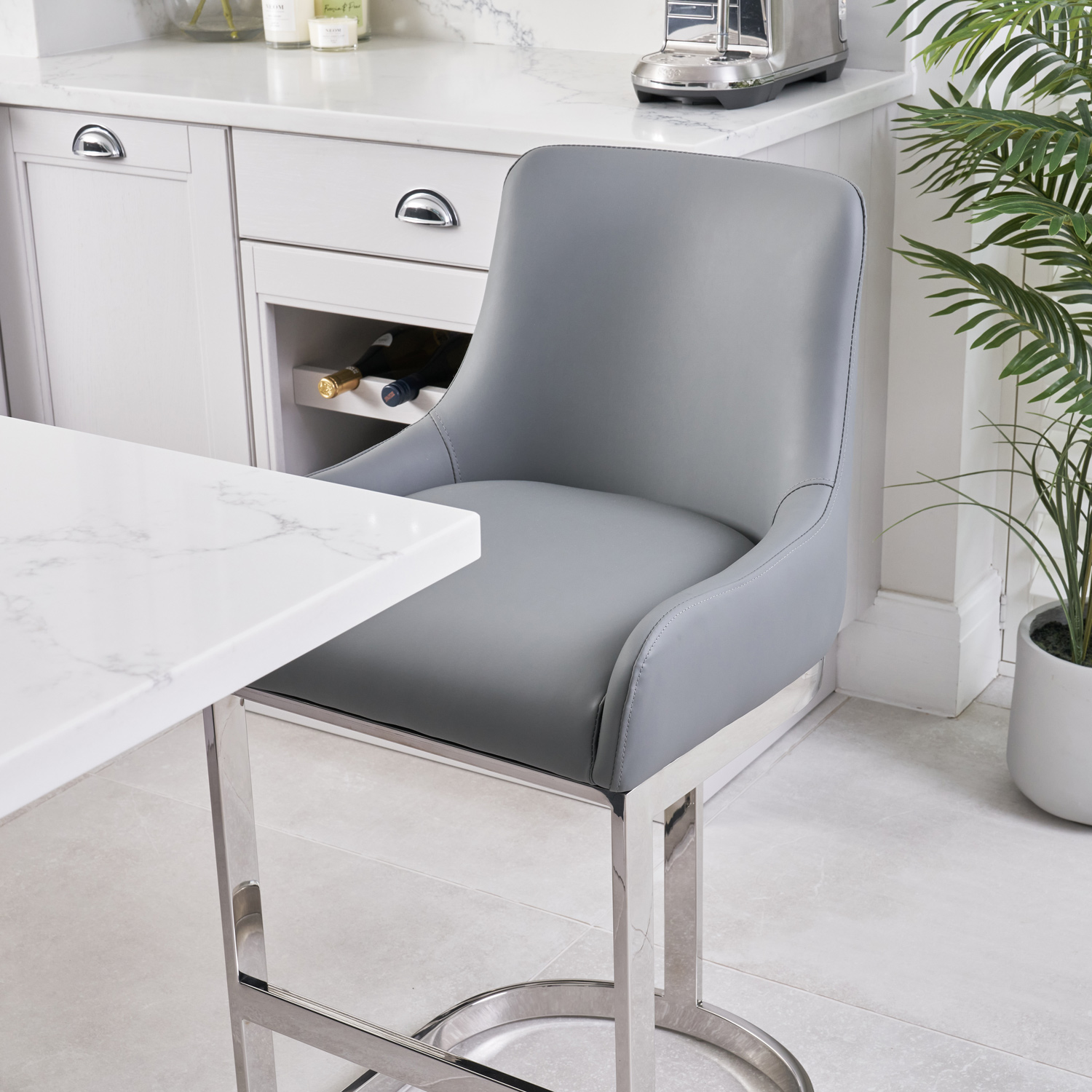 If you enjoy entertaining guests or just want a comfy place to sit in your kitchen/bar, then look no further than these Clara counter bar stools which are upholstered in a grey faux leather upholstery. The soft padding runs all the way up the curved backrest which has been designed to offer you plenty of support. Featuring a sleek polished stainless steel frame with footrest.