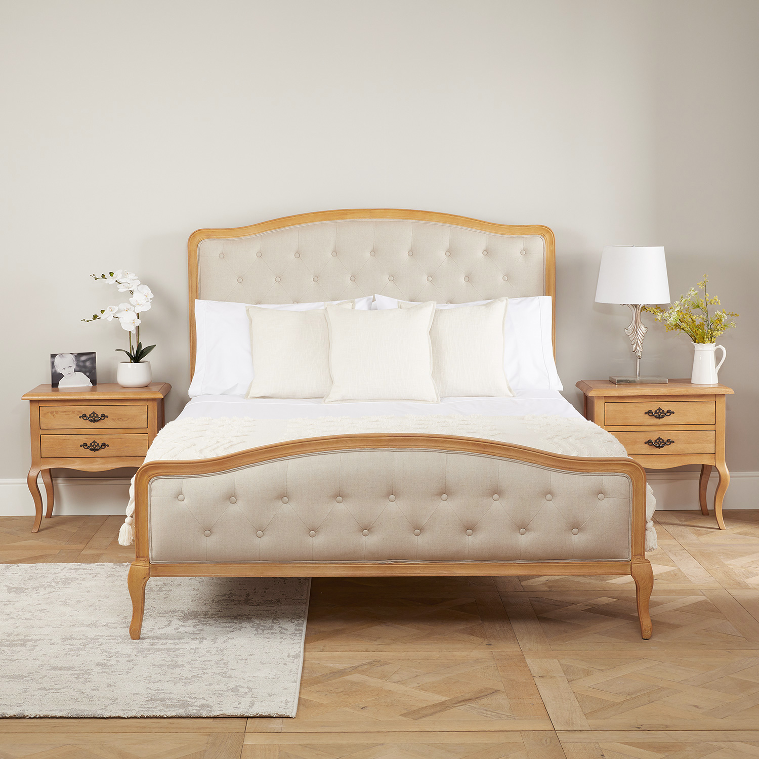 Add some French neoclassical sophistication to your abode with this stunning Double size Oak bed which features delicate oat meal Belgian linen upholstery.