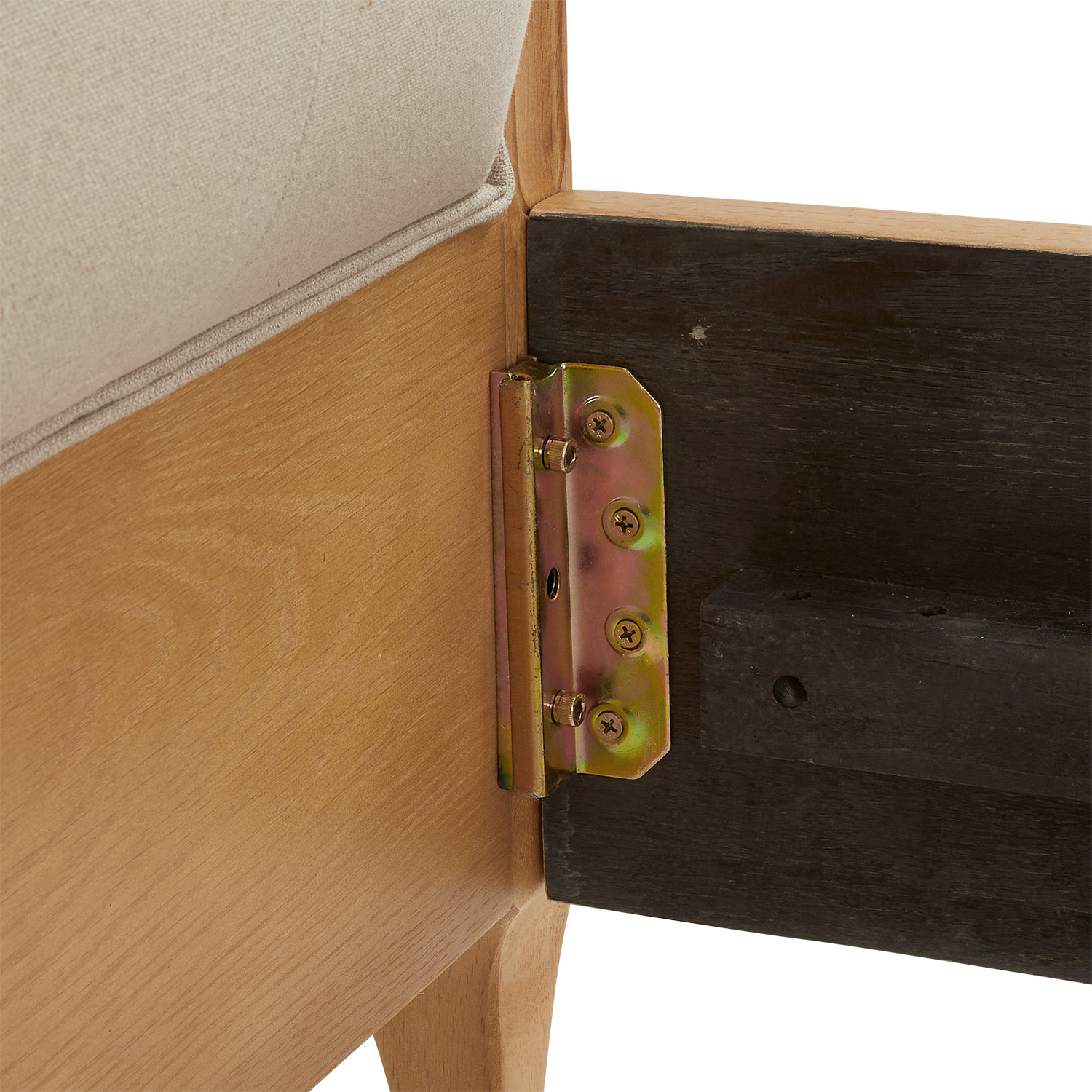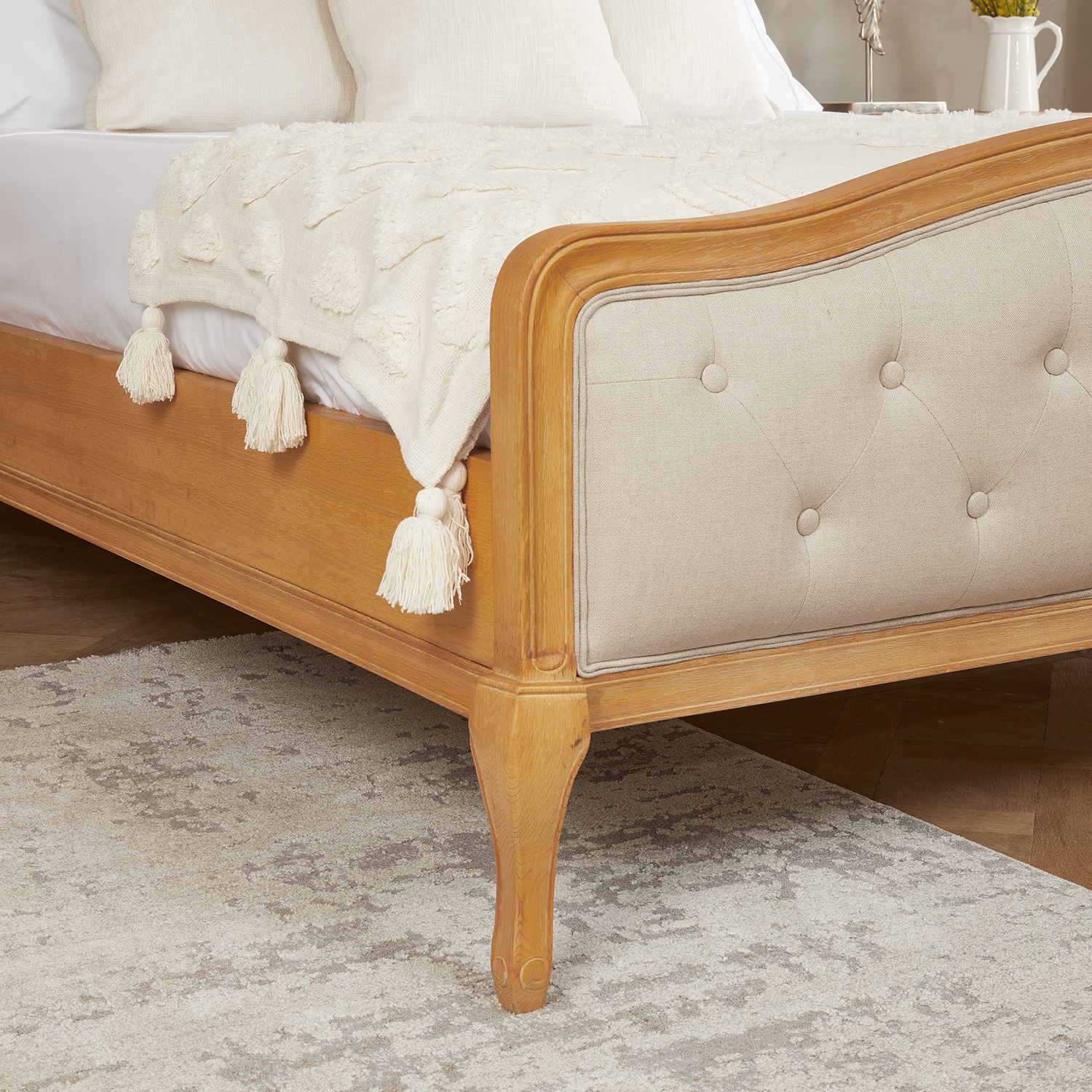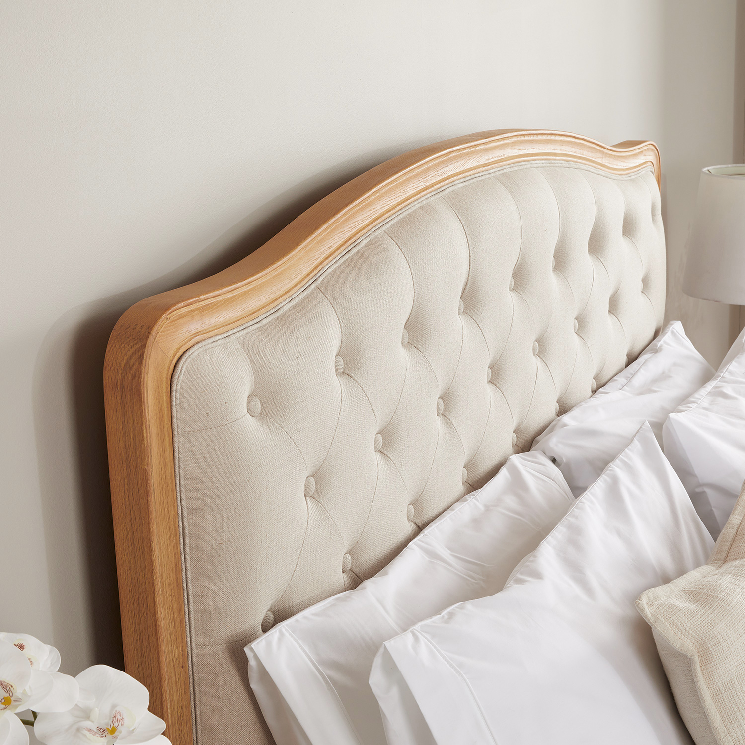 The hallmarks of French neoclassical design understated elegance and fine, Celeste natural Oak wood are showcased in our sumptuous upholstered French style bed. Handcrafted in solid Oak with a natural oak finish, it features classical hand-carved details and is richly upholstered in a oat meal Belgium linen fabric in a deep tufted buttoned design.