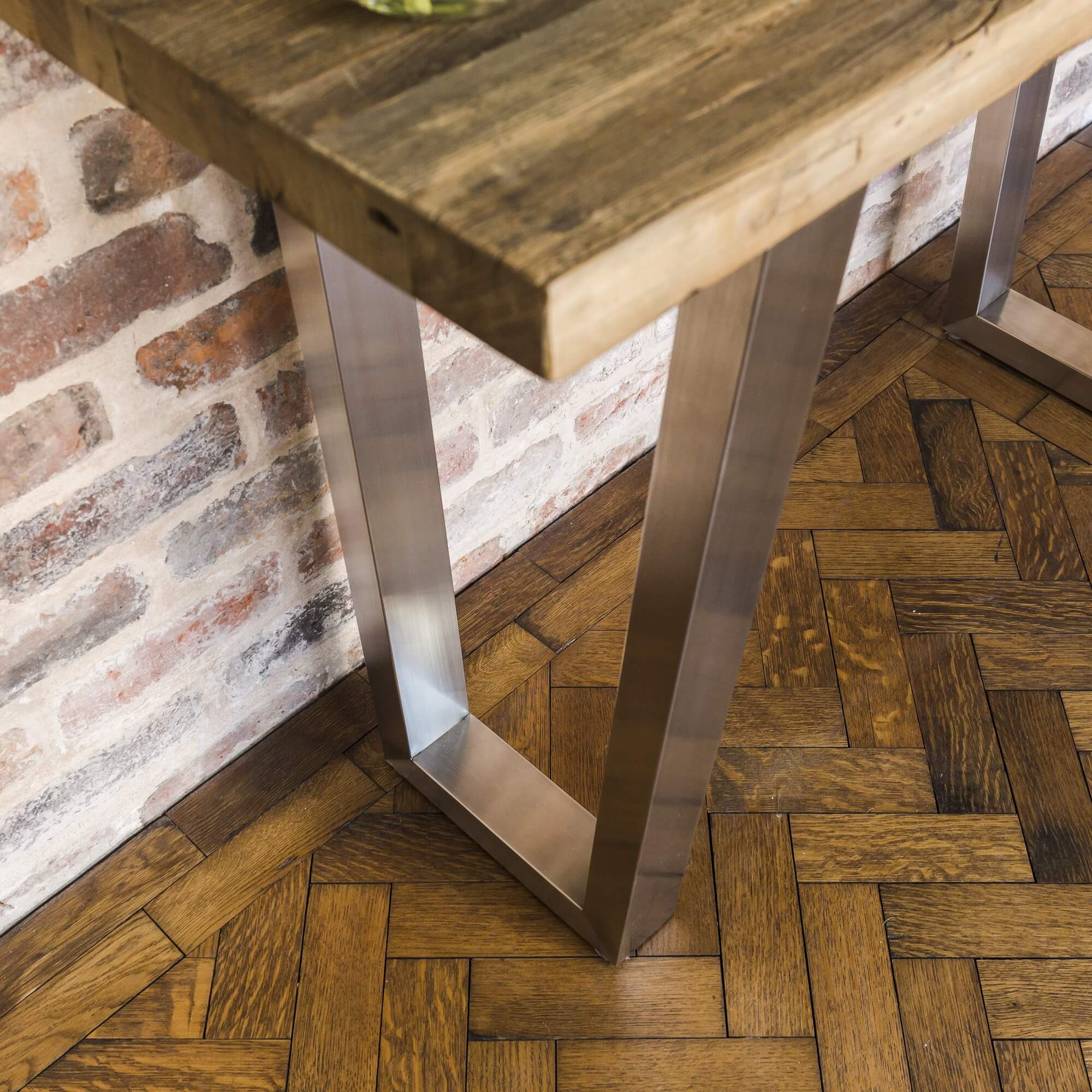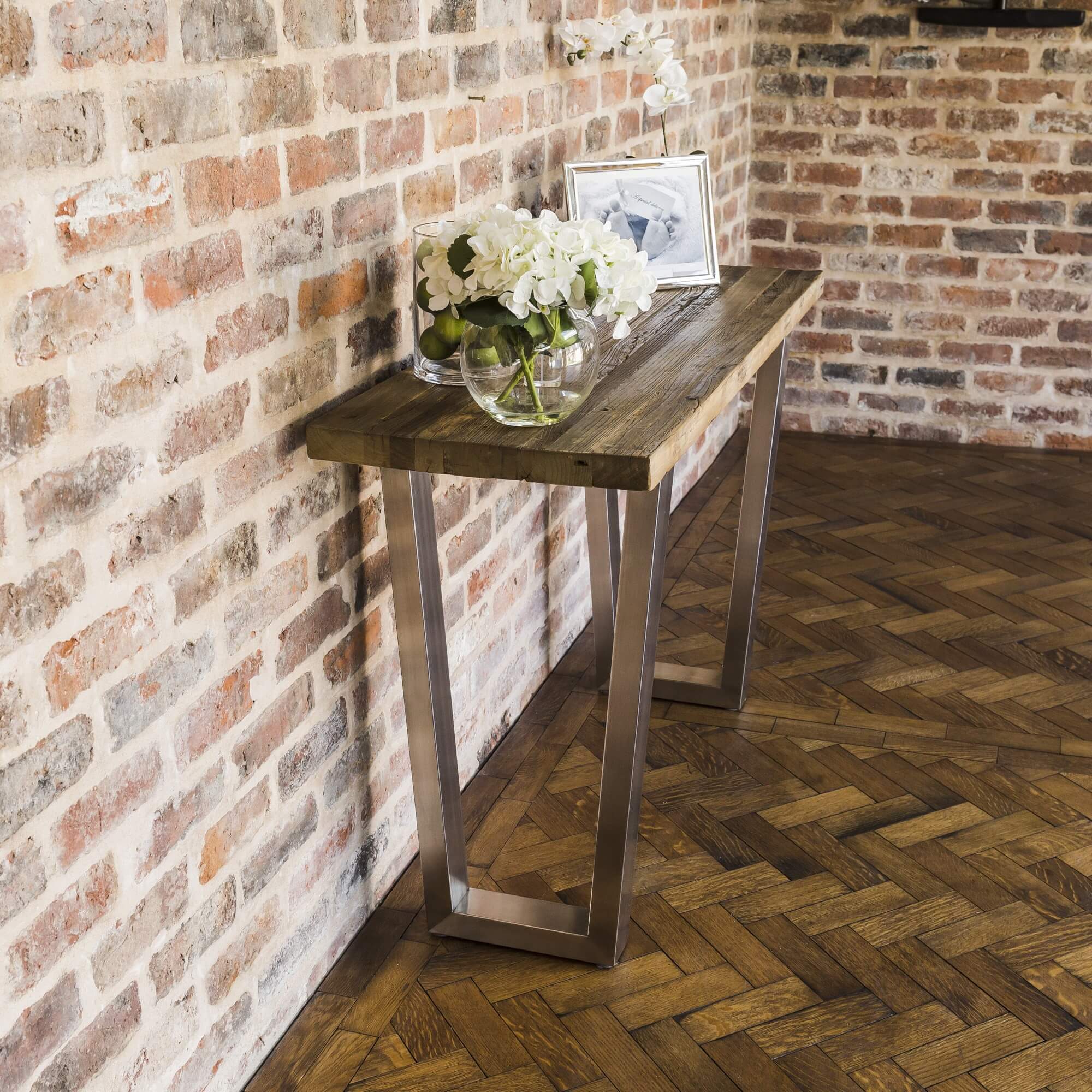 Keep up to date with the latest rustic interior style approach when you purchase this ultra modern brushed steel and reclaimed elm console table from Grosvenor Furniture.