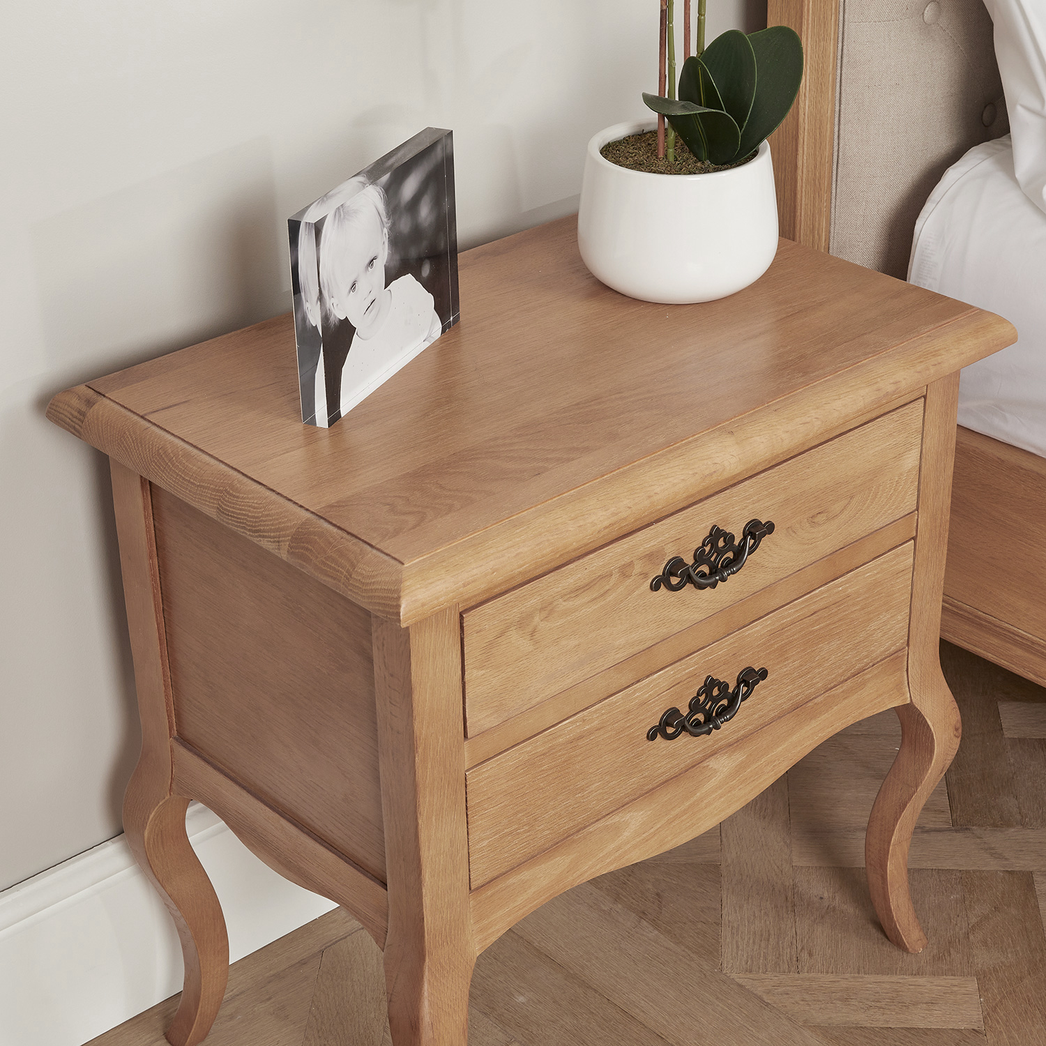 This beautifully designed French light Oak bedside table is another new fantastic edition to our French bedroom collection which would go perfect with our French Oak upholstered beds. The bedside features two drawers having antique solid brass French style carved handles. The top of the bedside table sits on four cabriole legs.