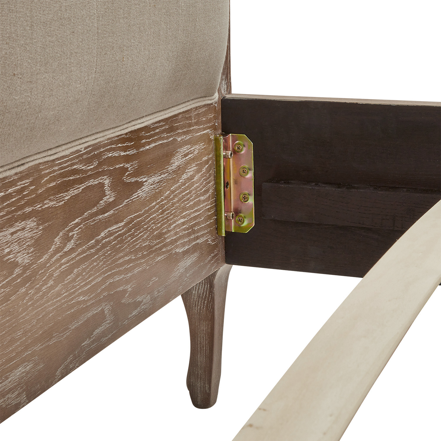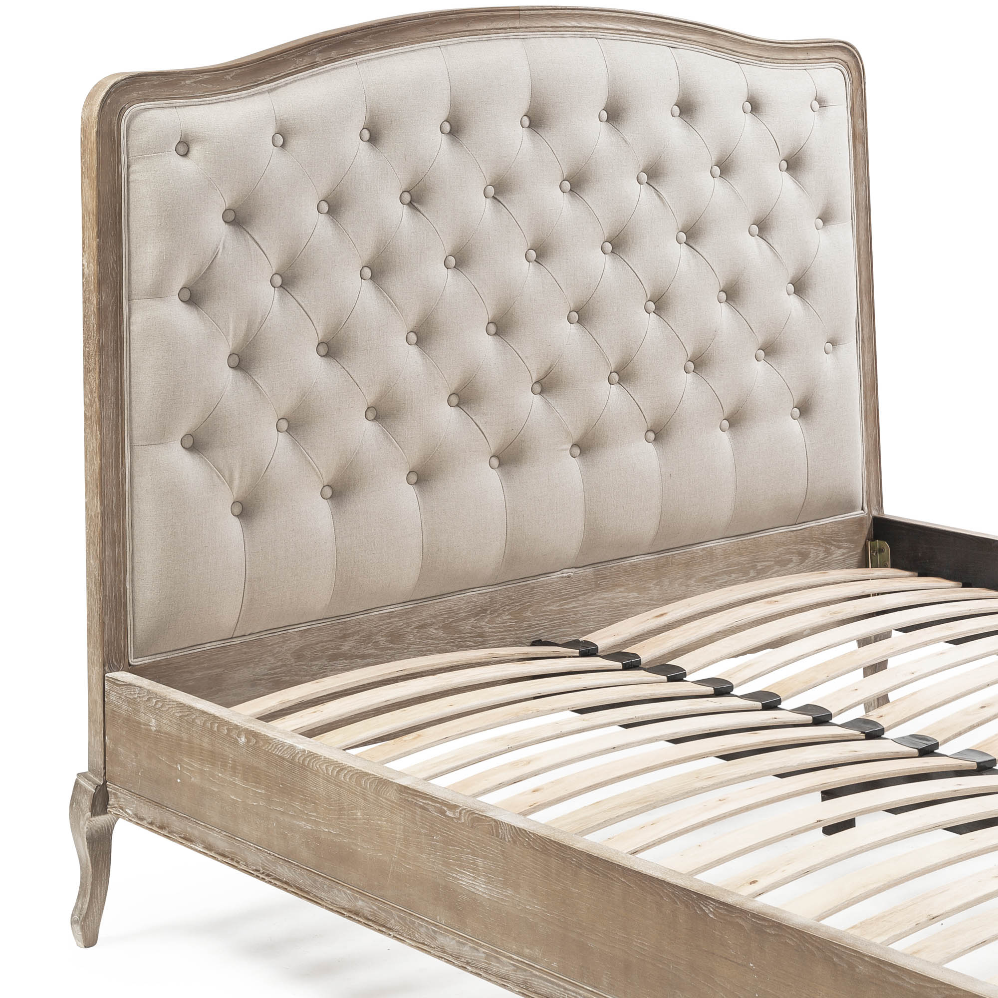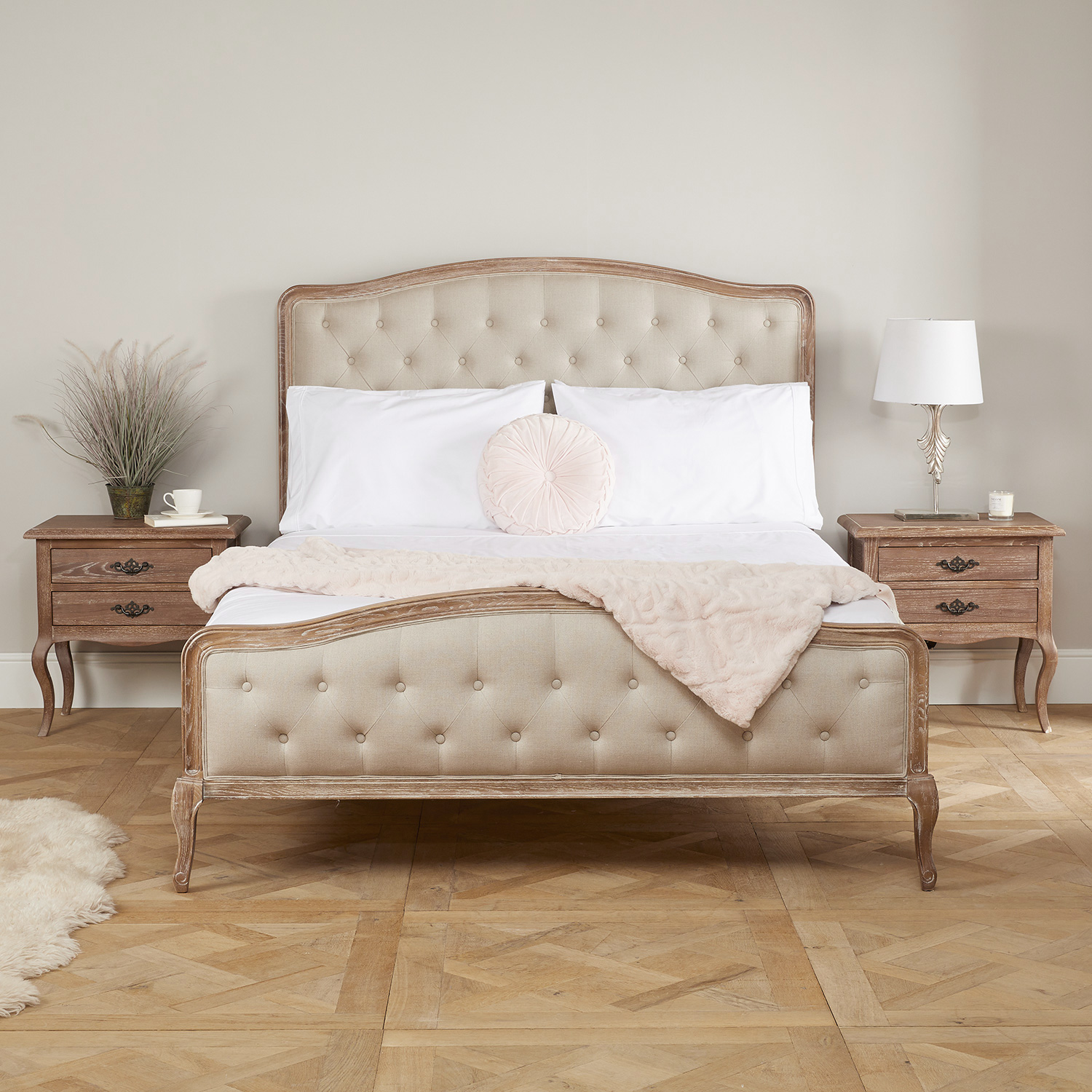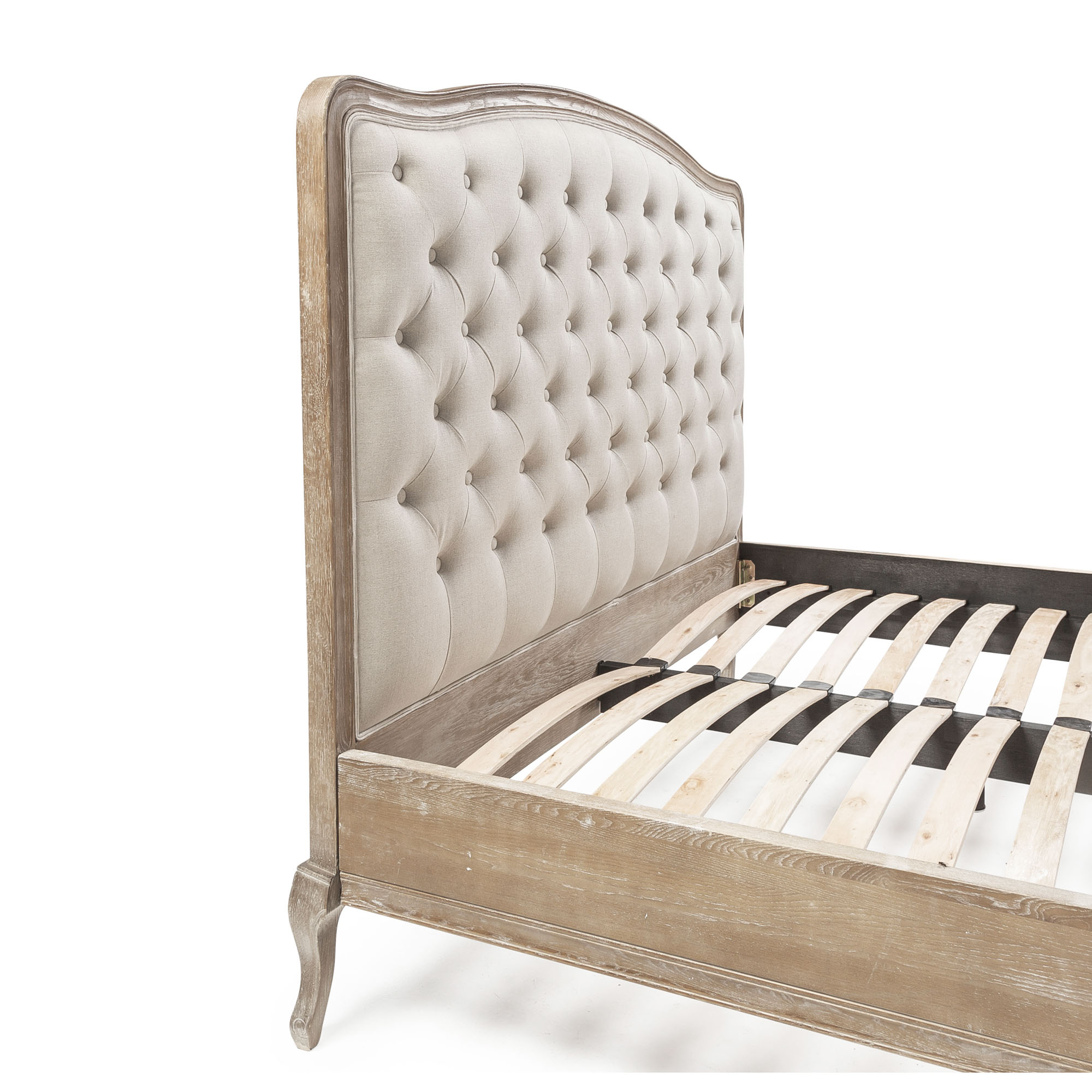 Made from solid ash wood but with a limed oak finish and complimentary Oat Meal Belgian linen upholstery in a deep tufted buttoned design, this King size bed offers understated elegance and a solid finish ensuring a king size bed frame which is designed to last and offer endless comfort with a sprung slatted base for additional support. All of this is ably supported by cabriole French style legs.