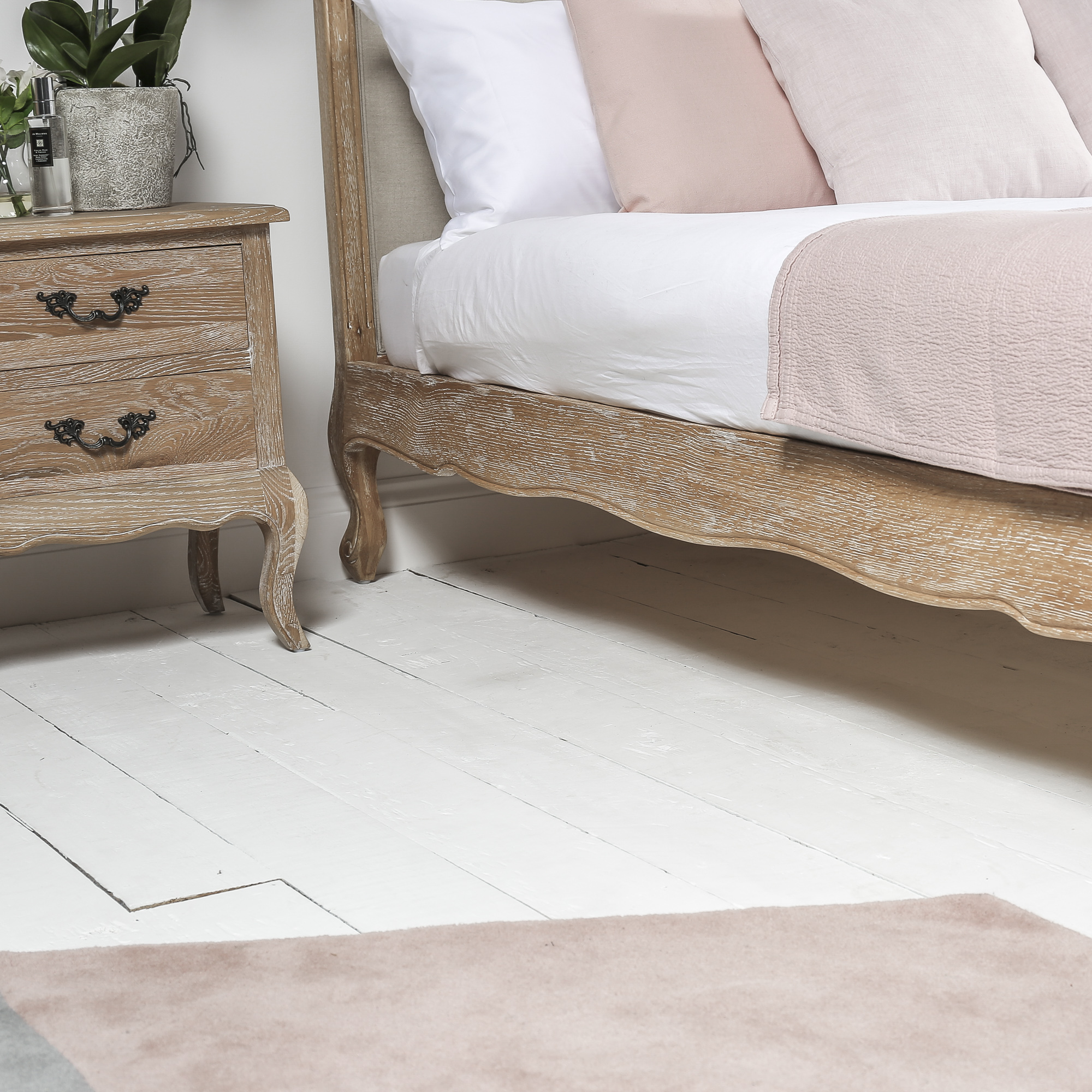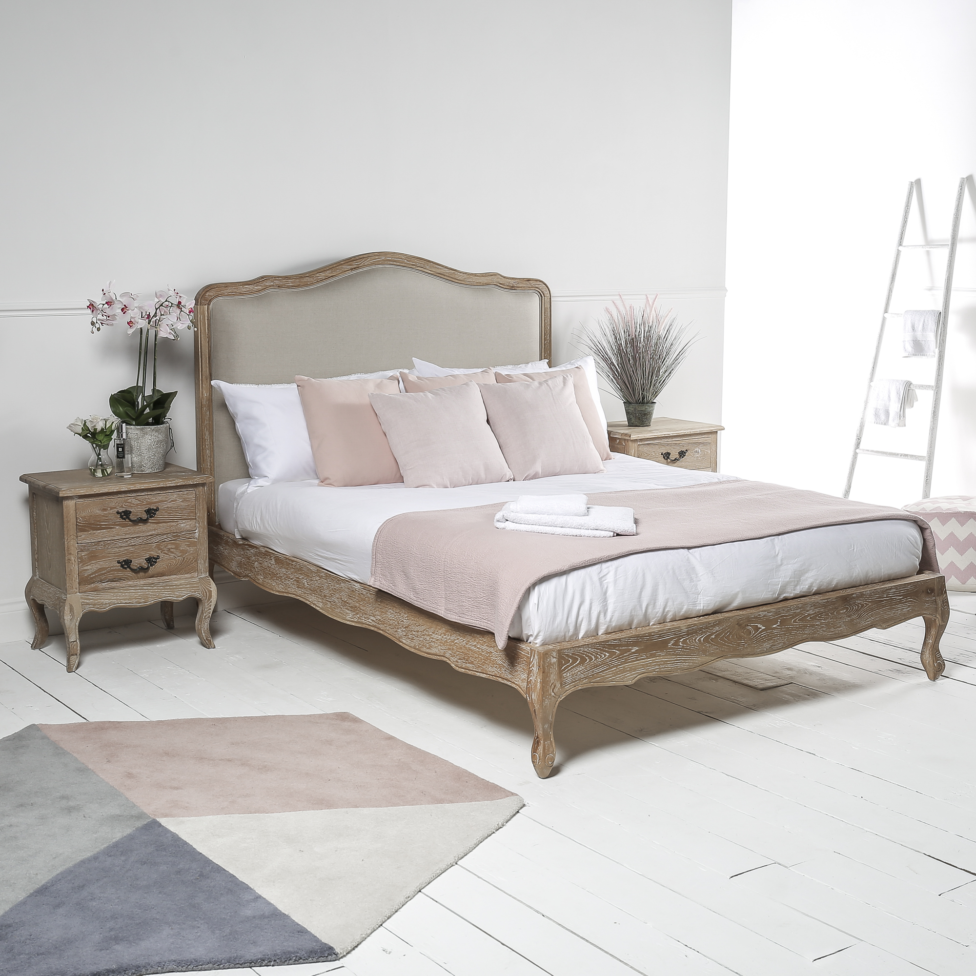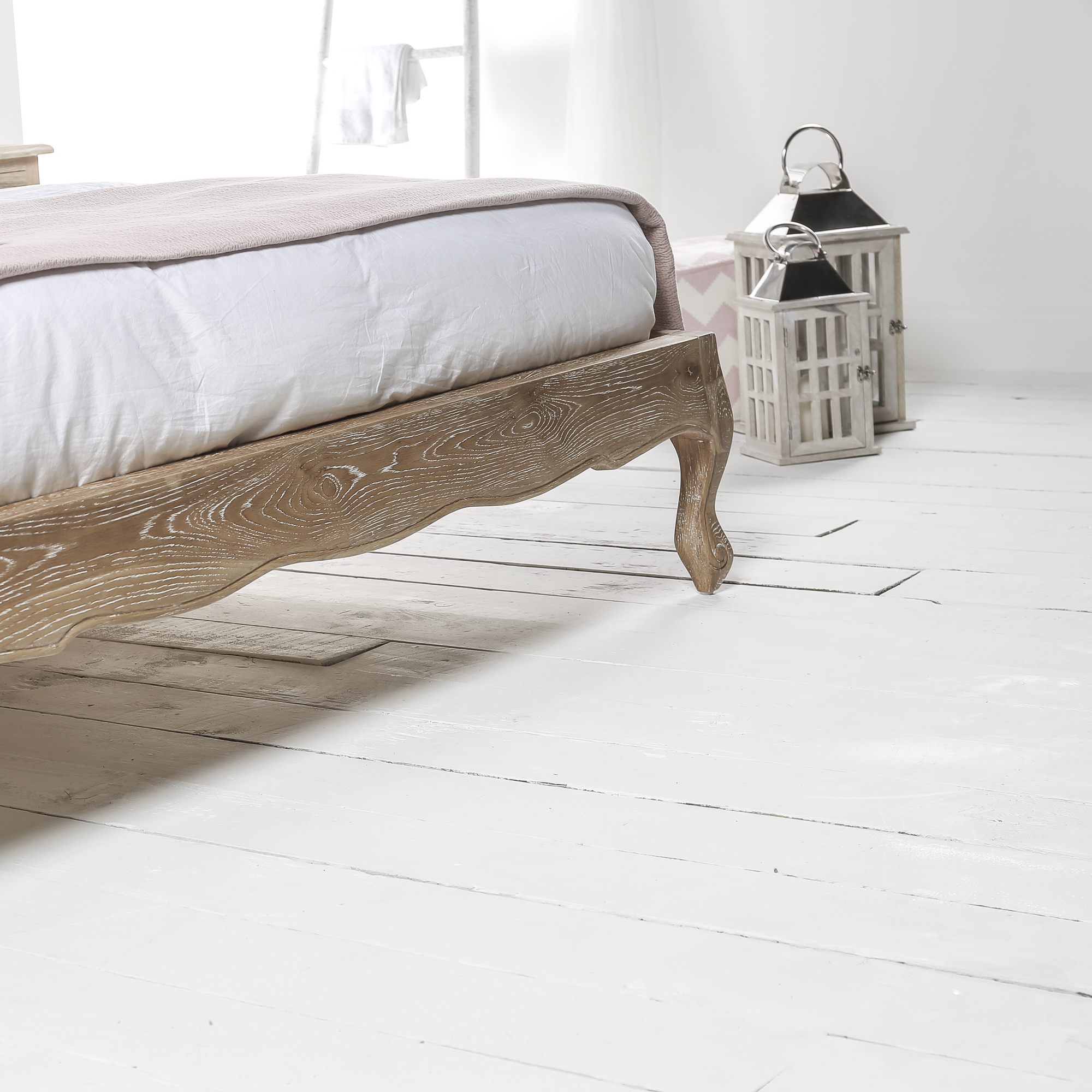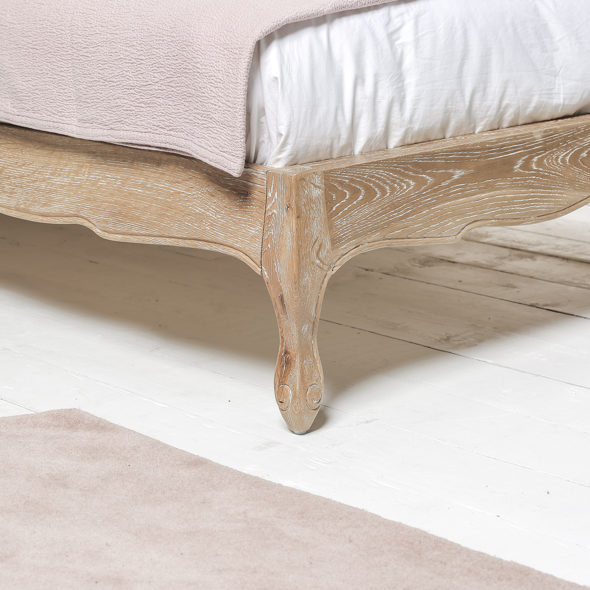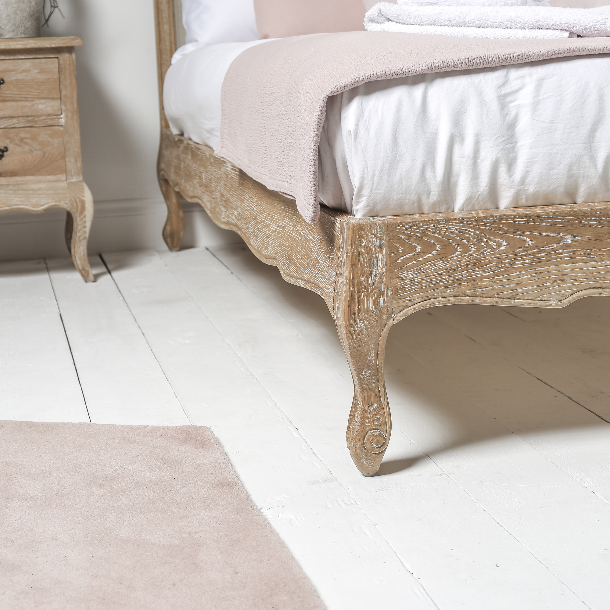 Clementine French Weathered Whitewash Oak Upholstered Low Foot Board Bed – Super King Size
