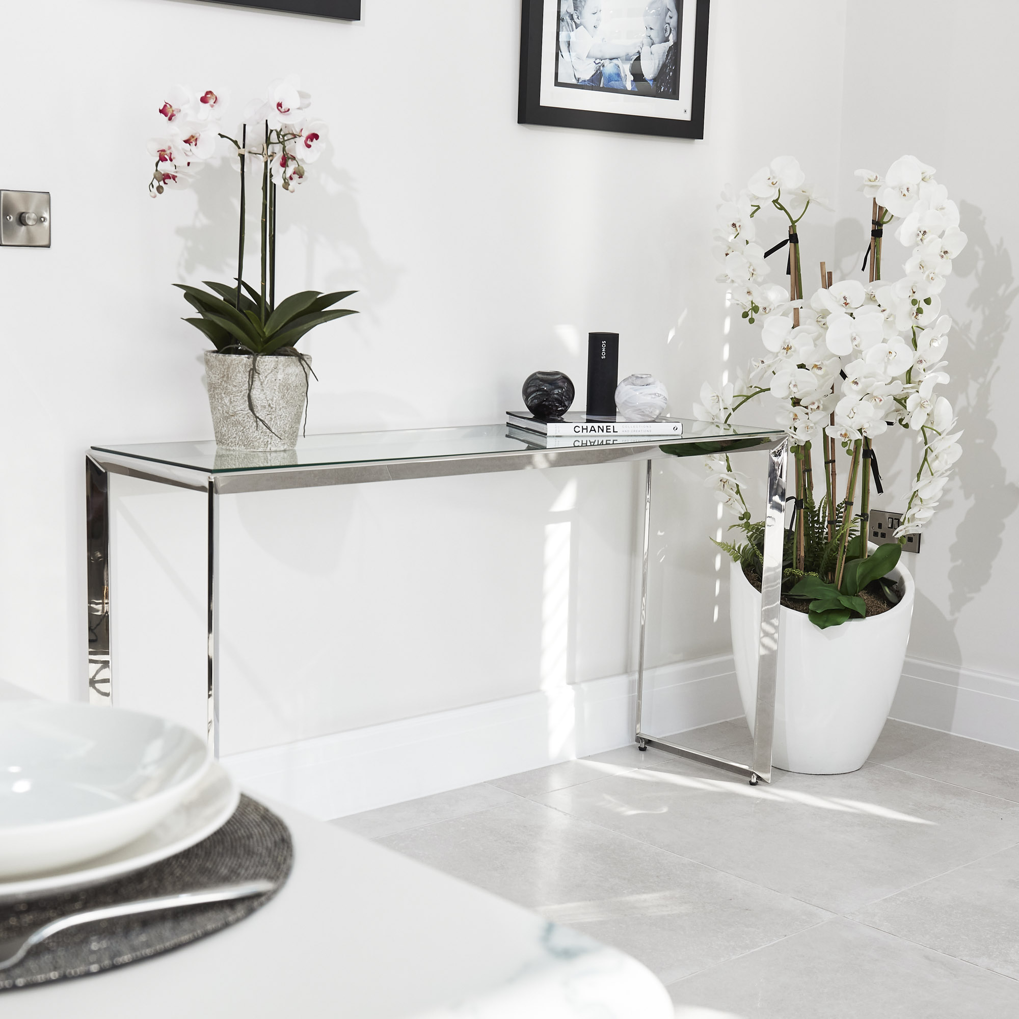 The clean and simplistic design ensures that this glass console table can transcend changing design trends and continue to act as a handy and unimposing addition on which to display your favourite home accessories, family photos or even the odd award.