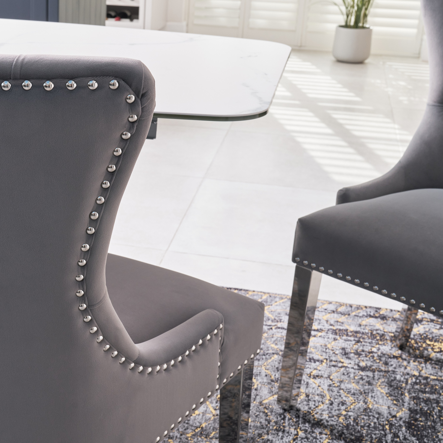 Everyone who enters you home is sure to be wowed by the aura of elegance that this luxurious velvet dining chair portrays with its stunning grey velvet upholstery, polished steel legs and silver detailing stud work, all of which is sure to impress the design conscious. The grey velvet upholstery covers a plush padded surface which adds additional comfort, with the velvet itself having been crafted using a traditional weaving technique. This is the only way that we could achieve the impeccable high standards that we expect for our customers, helping us to produce a deep colour and a surface which is designed to last as well as being easy to clean.