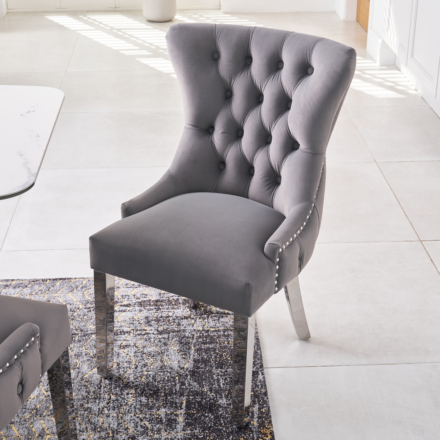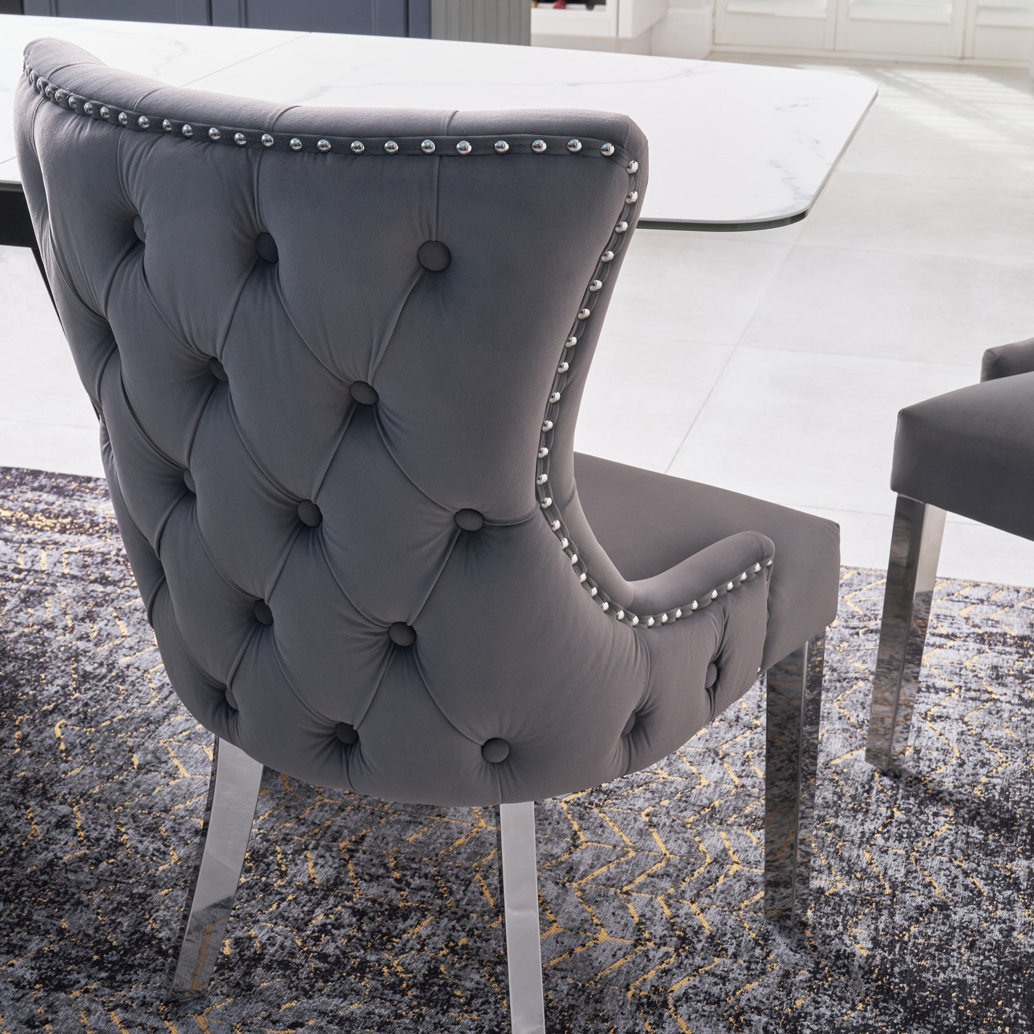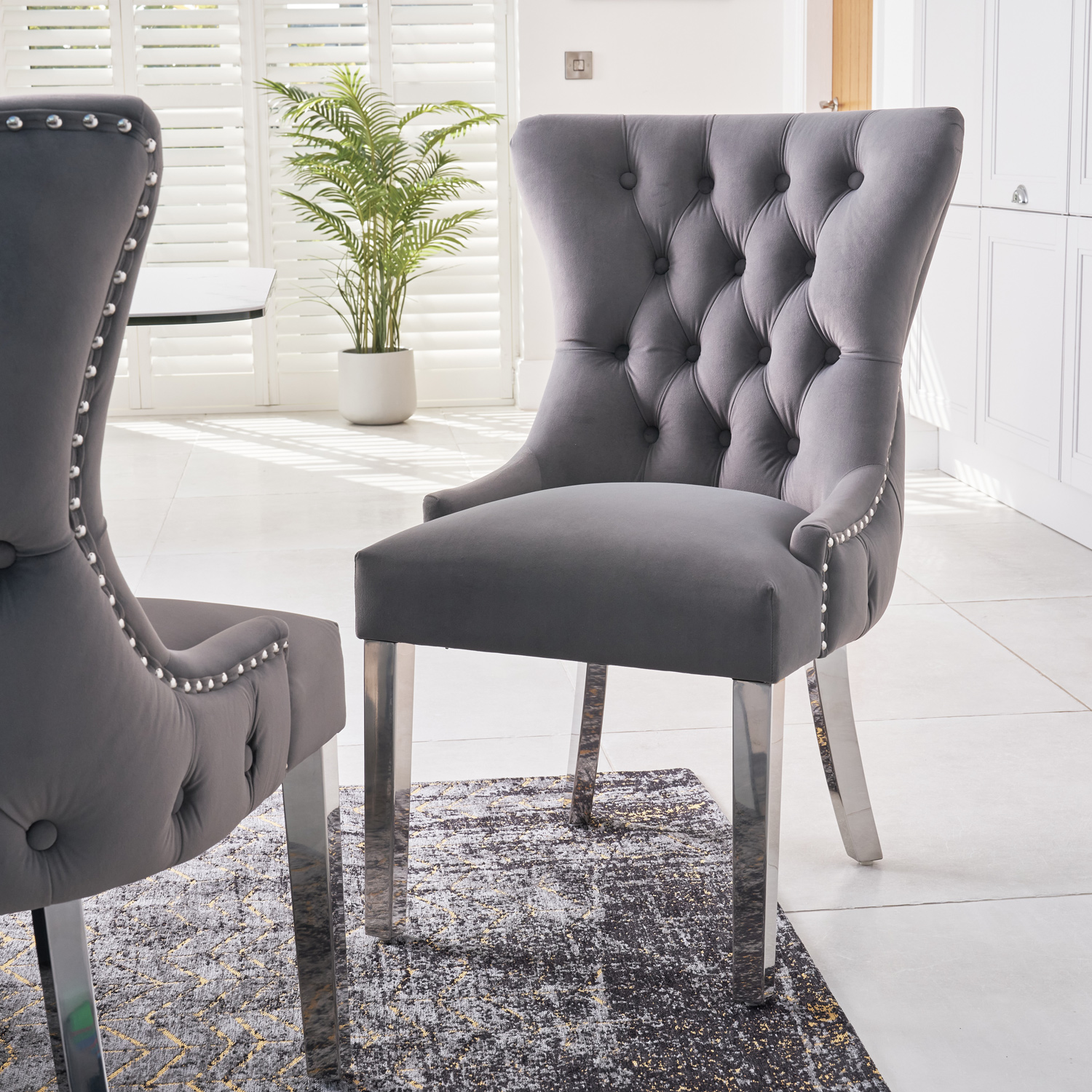 Hailing from the Knightsbridge area of London, the original Knightsbridge dining chair is famous for its outstanding levels of comfort which are afforded on account of the high padded backrest and plump, padded seating area. Coated in our traditionally weaved luxury grey velvet upholstery and featuring button tufted details, polished steel legs. Our latest Knightsbridge dining chair is the natural evolution of this classic design.