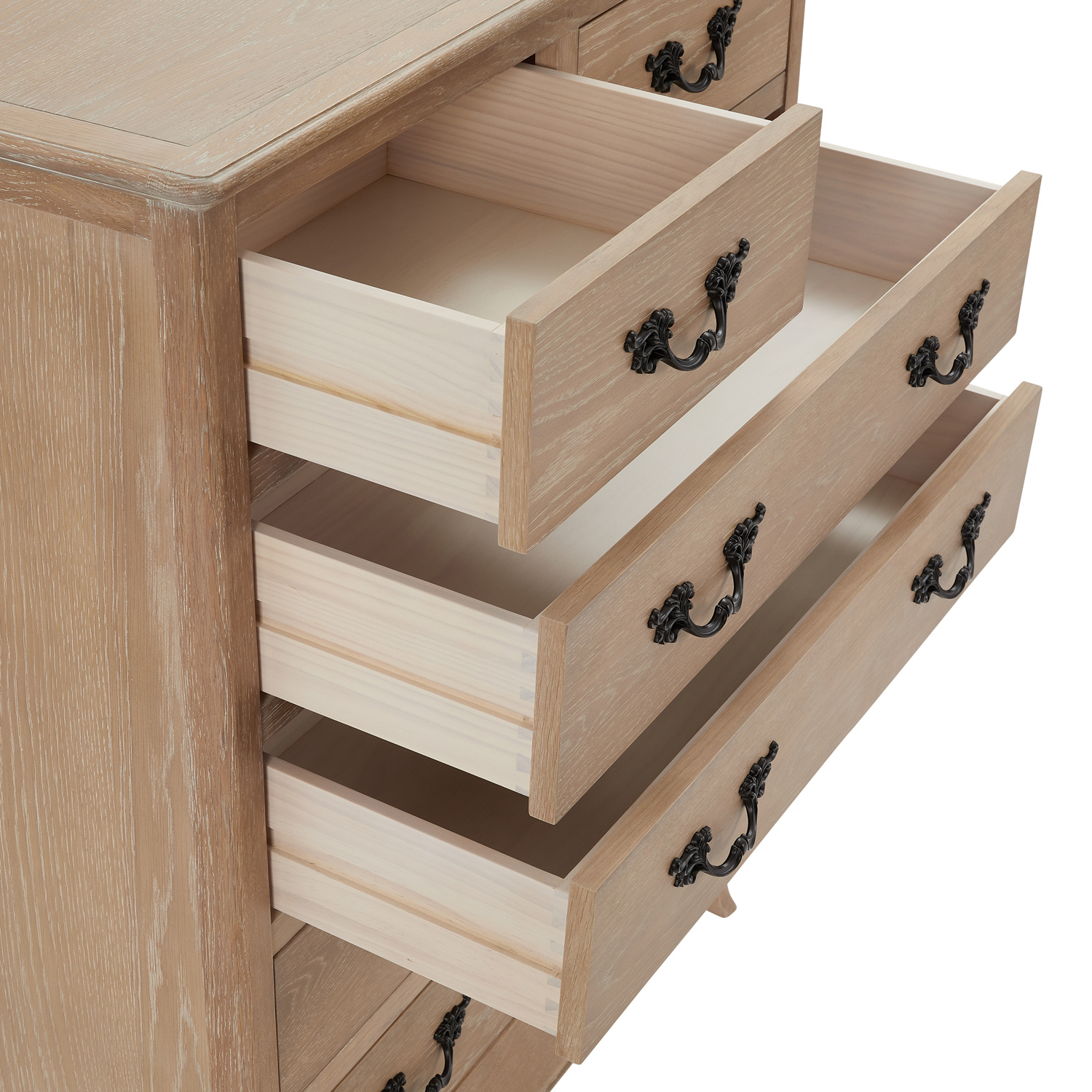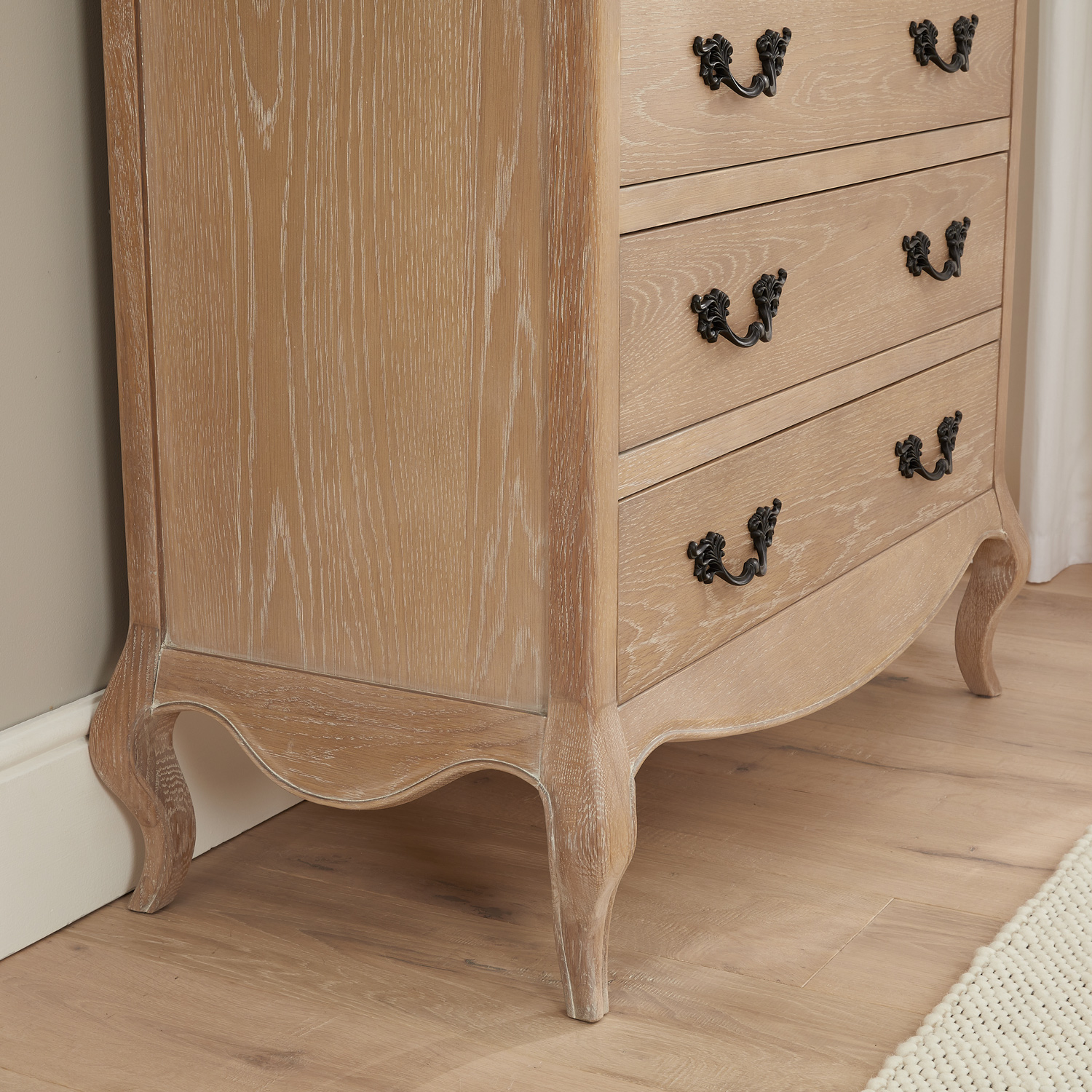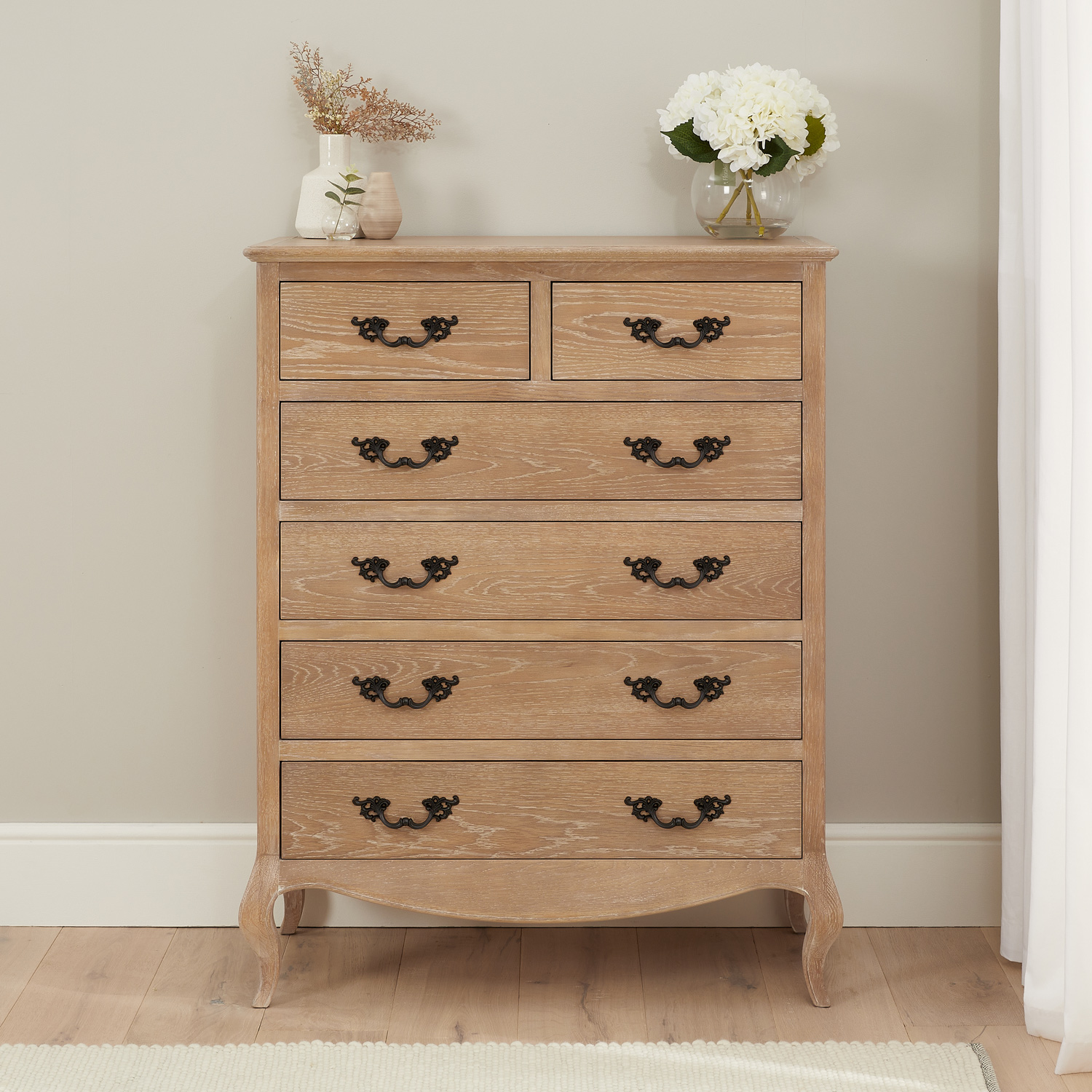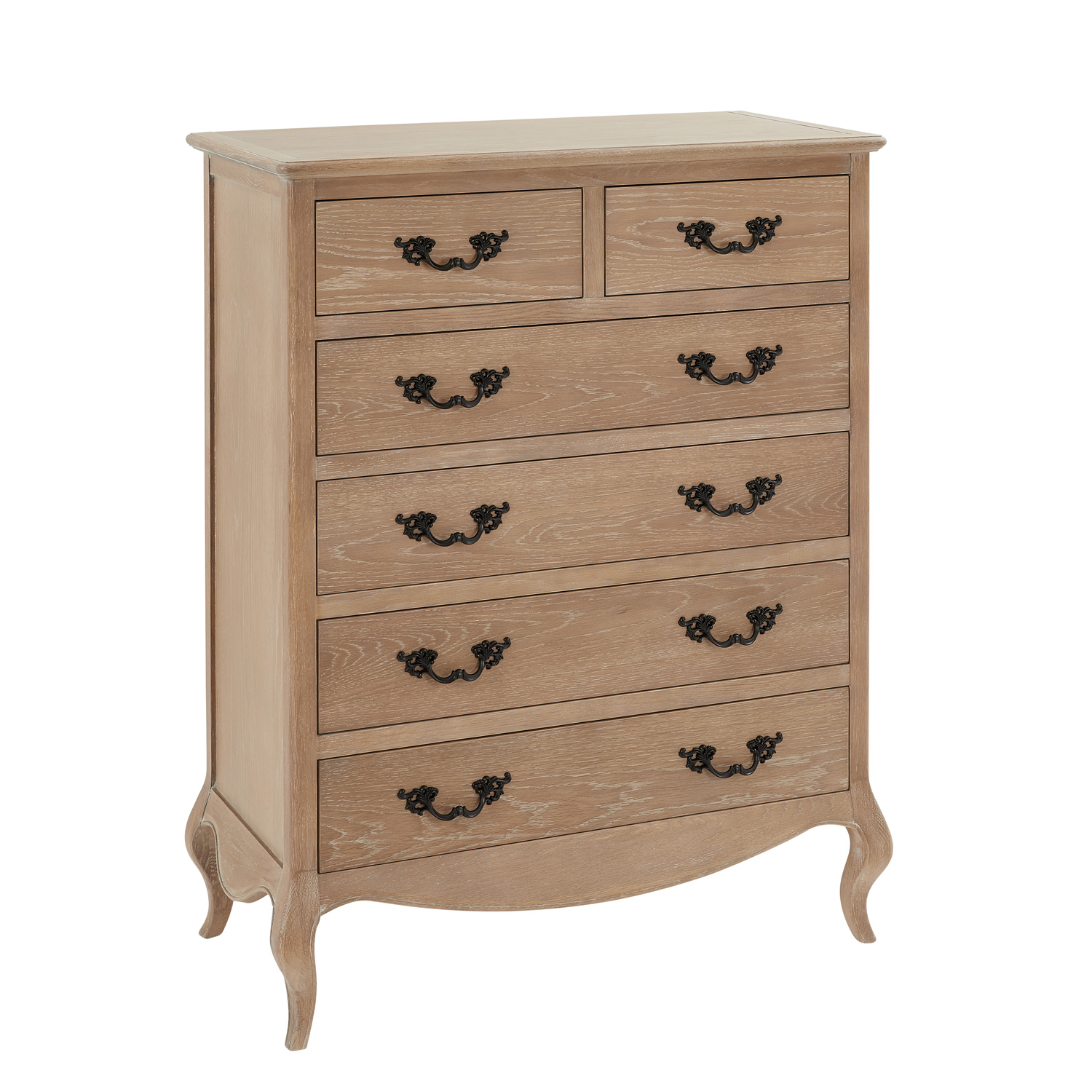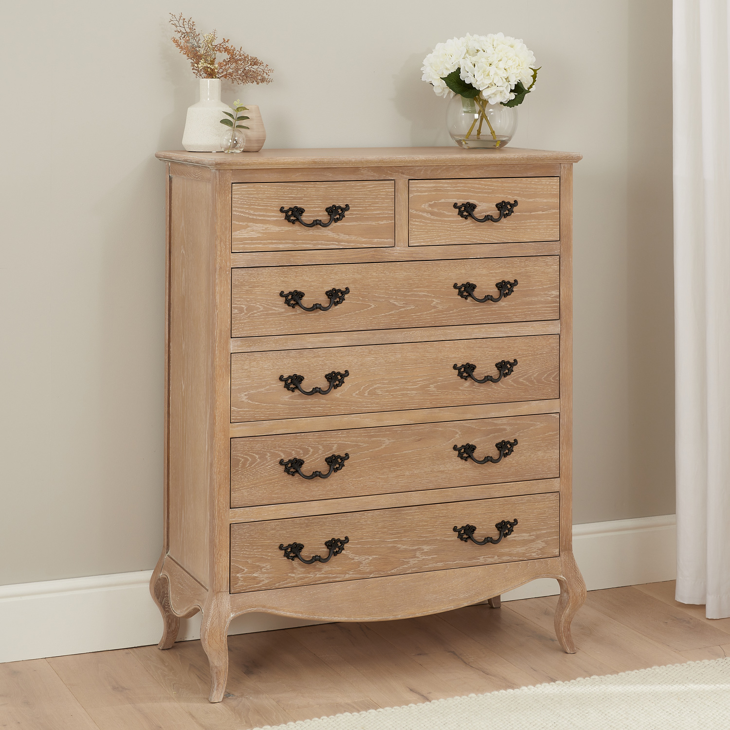 This beautifully designed French limed Oak chest of drawers is another fantastic edition to our new Lille French limed oak bedroom collection. The chest features two over four drawers each having solid black satin painted French style carved handles. This chest of drawers sits above on four cabriole carved legs.
