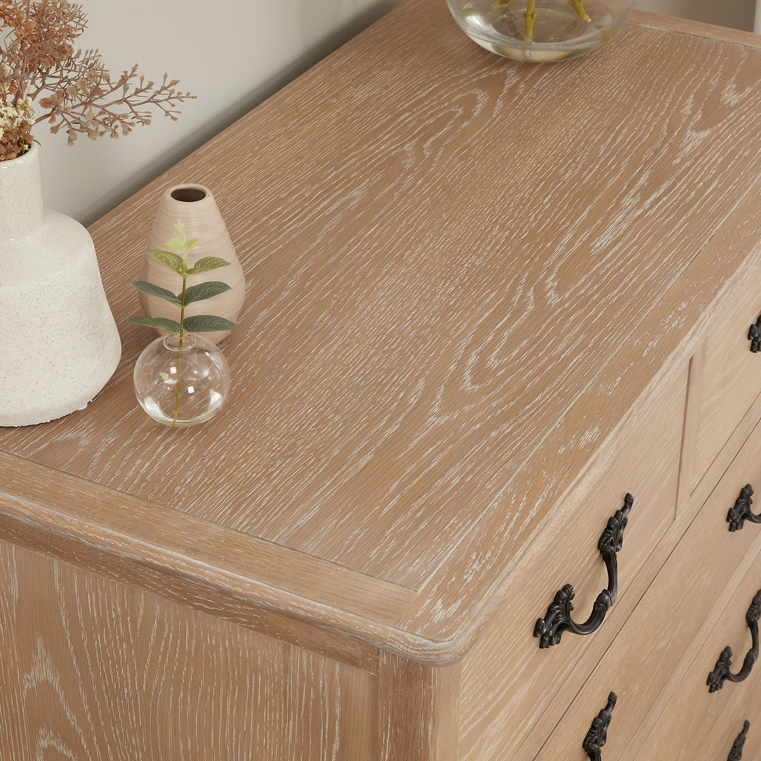 This luxurious French tall chest of drawers is sure to grab the attention of guests, with its stunning limed Oak finish design.