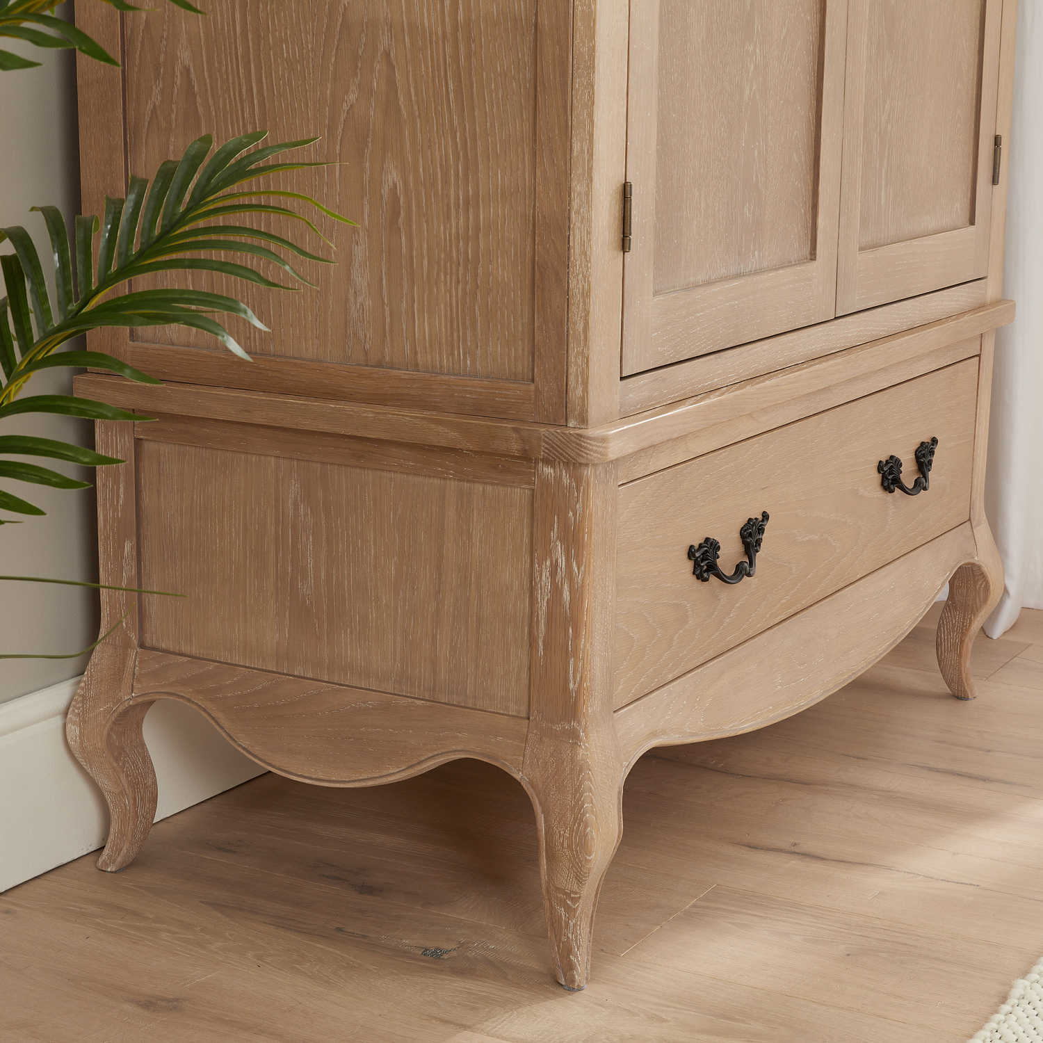 Add elegany styling and handy storage solutions to your bedroom with this stunning French limed Oak Lille wardrobe from Grosvenor Furniture.