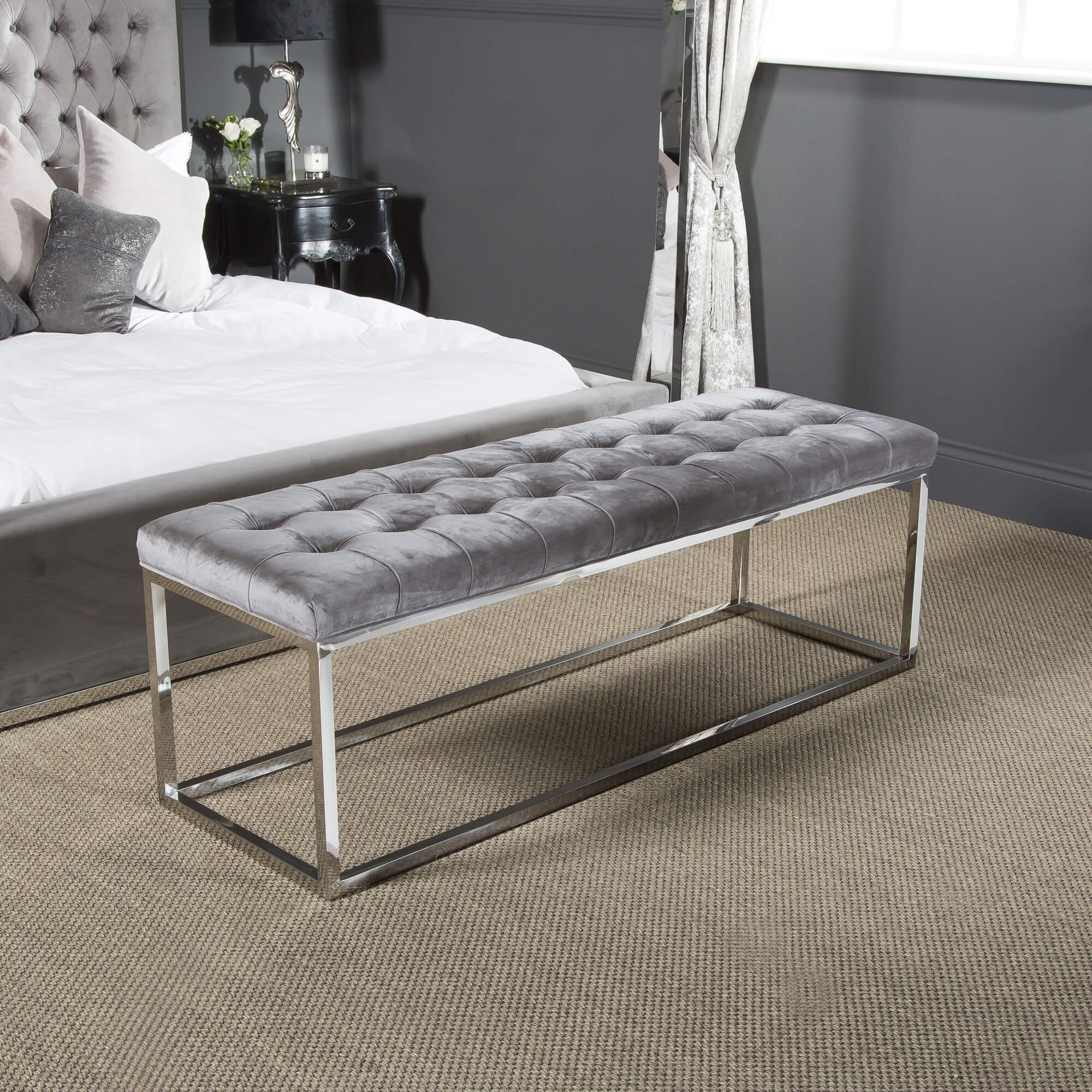 This hand tufted brushed velvet bedroom bench provides comfort, convenience & aesthetic appeal. The perfect addition to our existing grey bedroom furniture collection.