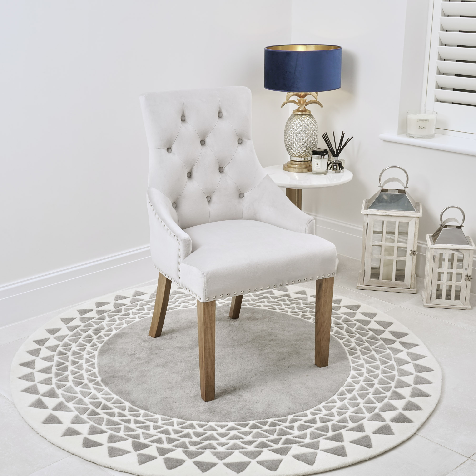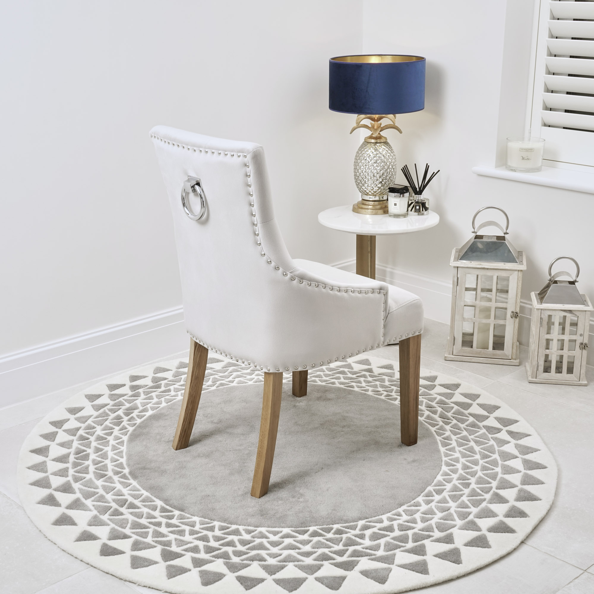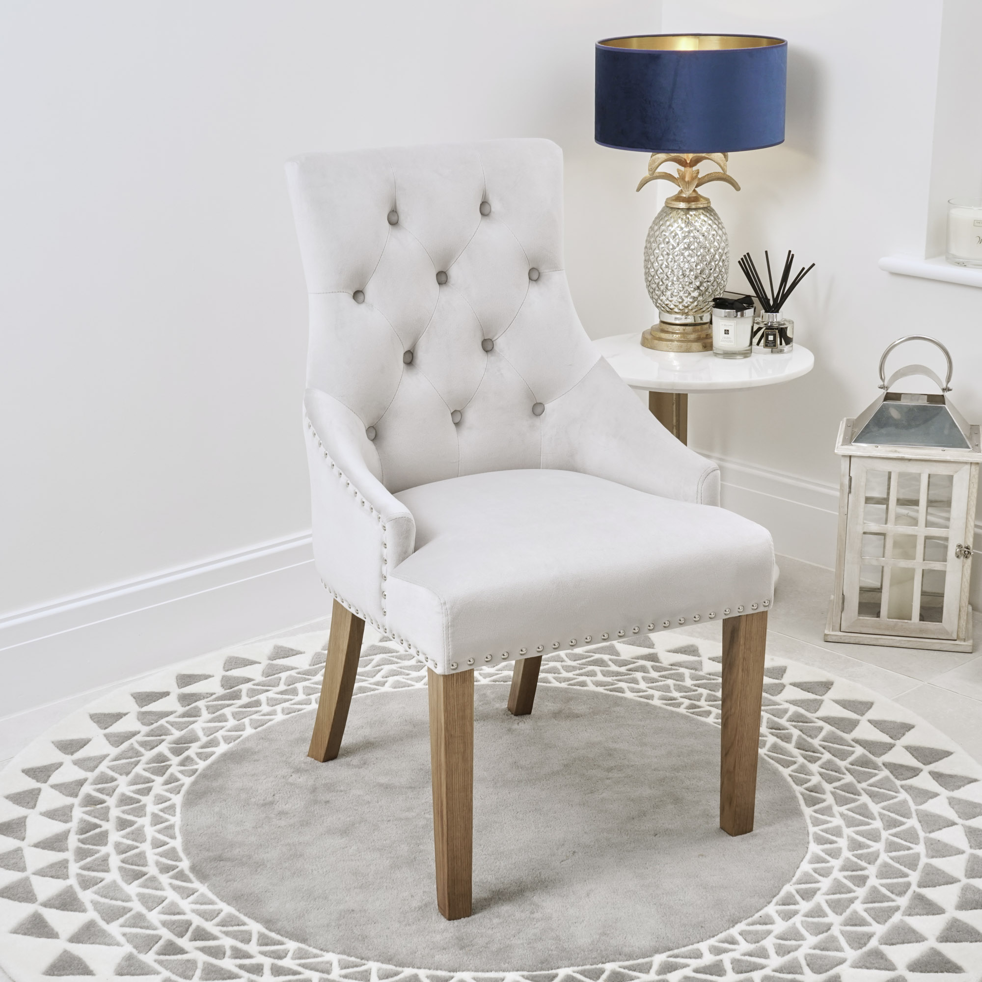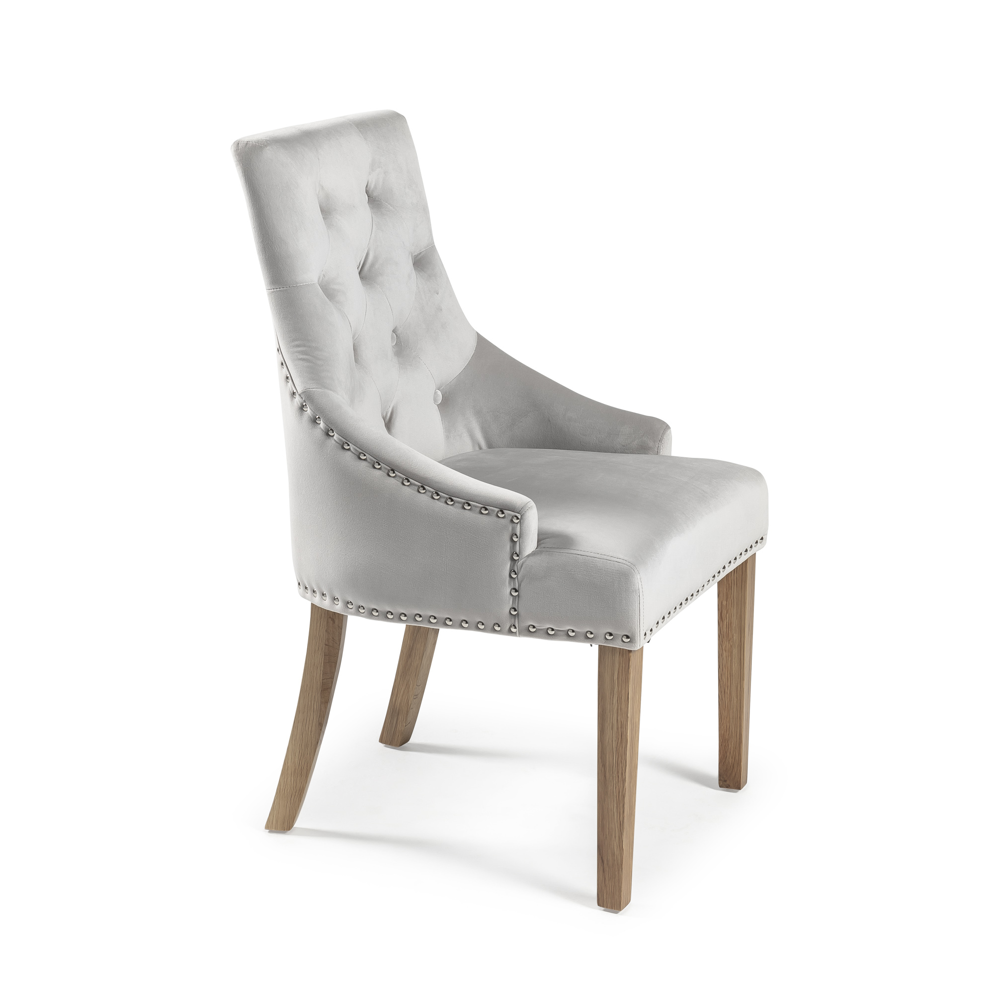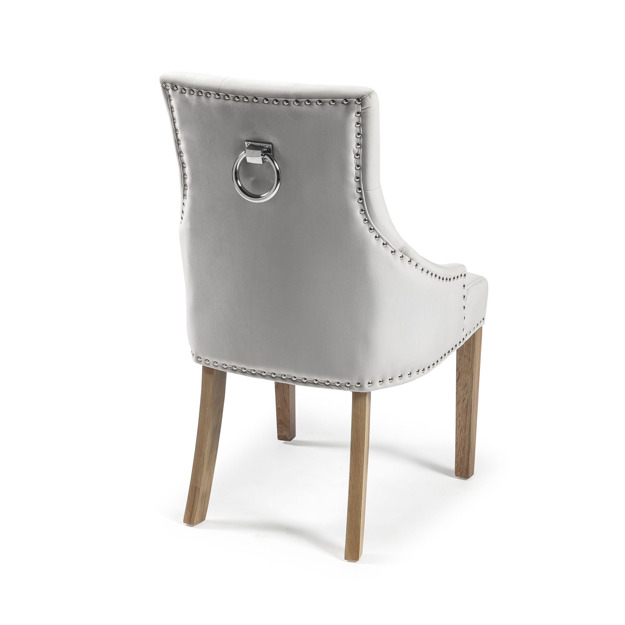 With a smooth dove grey velvet upholstery and scoop back design, this is a dining chair which is designed for maximum comfort without impacting on its aesthetic prowess. It really is as comfortable as it looks, with the addition of the now stylish knocker handle decoration to the rear of the back rest so as to keep up to date with modern trends. This is in addition to decorative metal studs which dot the perimeter of the backrest, providing that extra sparkle which helps to set this Chelsea dining chair design apart from the rest.