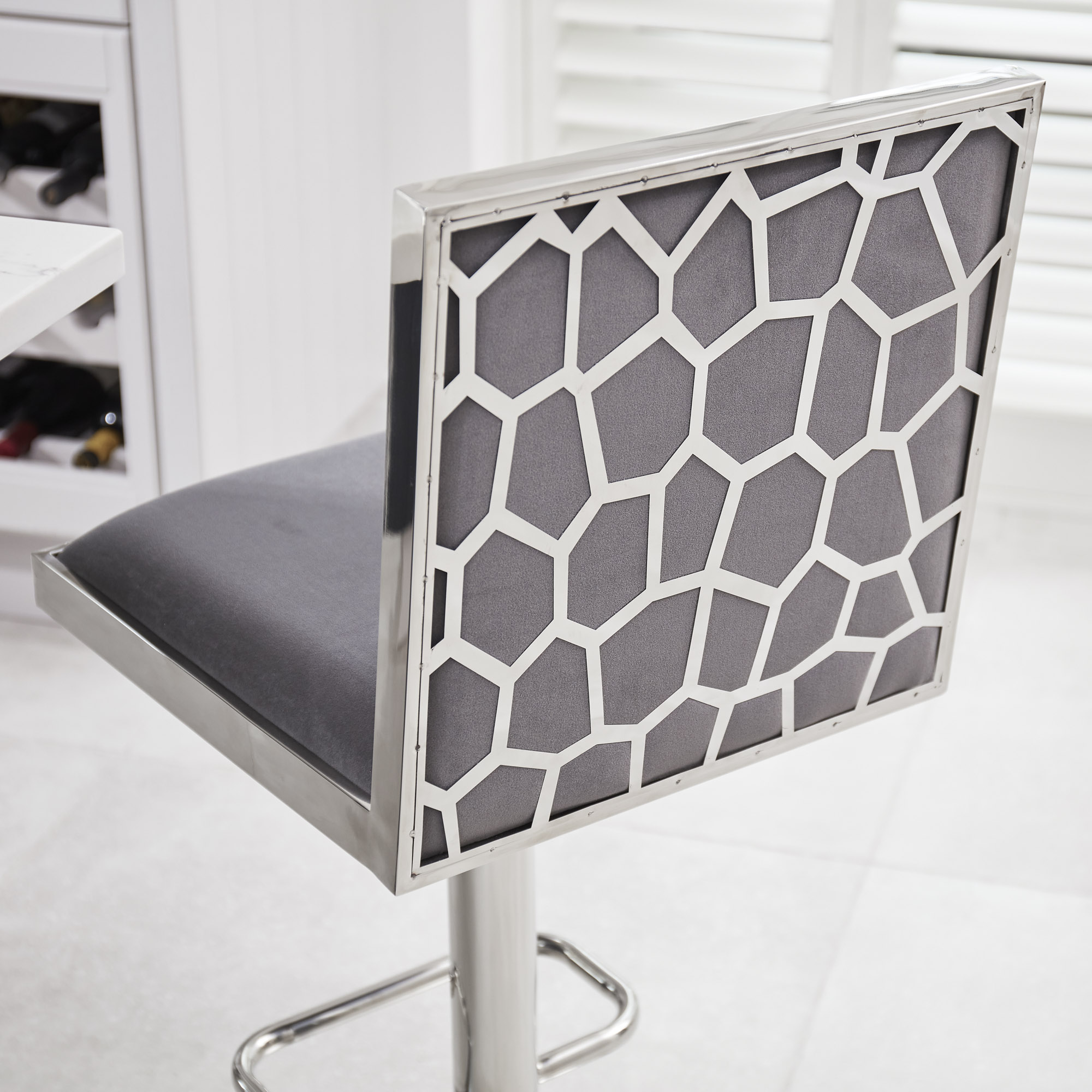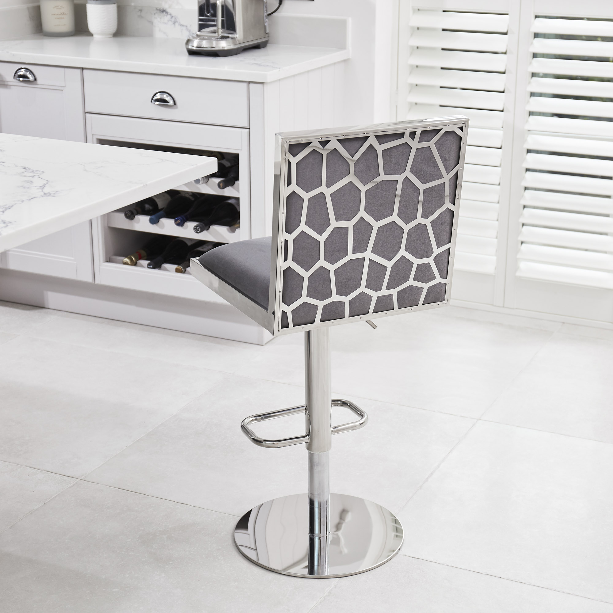 The Mia contemporary Bar/Kitchen stool is upholstered in luxurious grey velvet fabric. This luxuriously padded seat has a supportive backrest to deliver premium comfort and great support. The rear of the stool has an interricate laser cut panel with a minimal contemporary design to it.