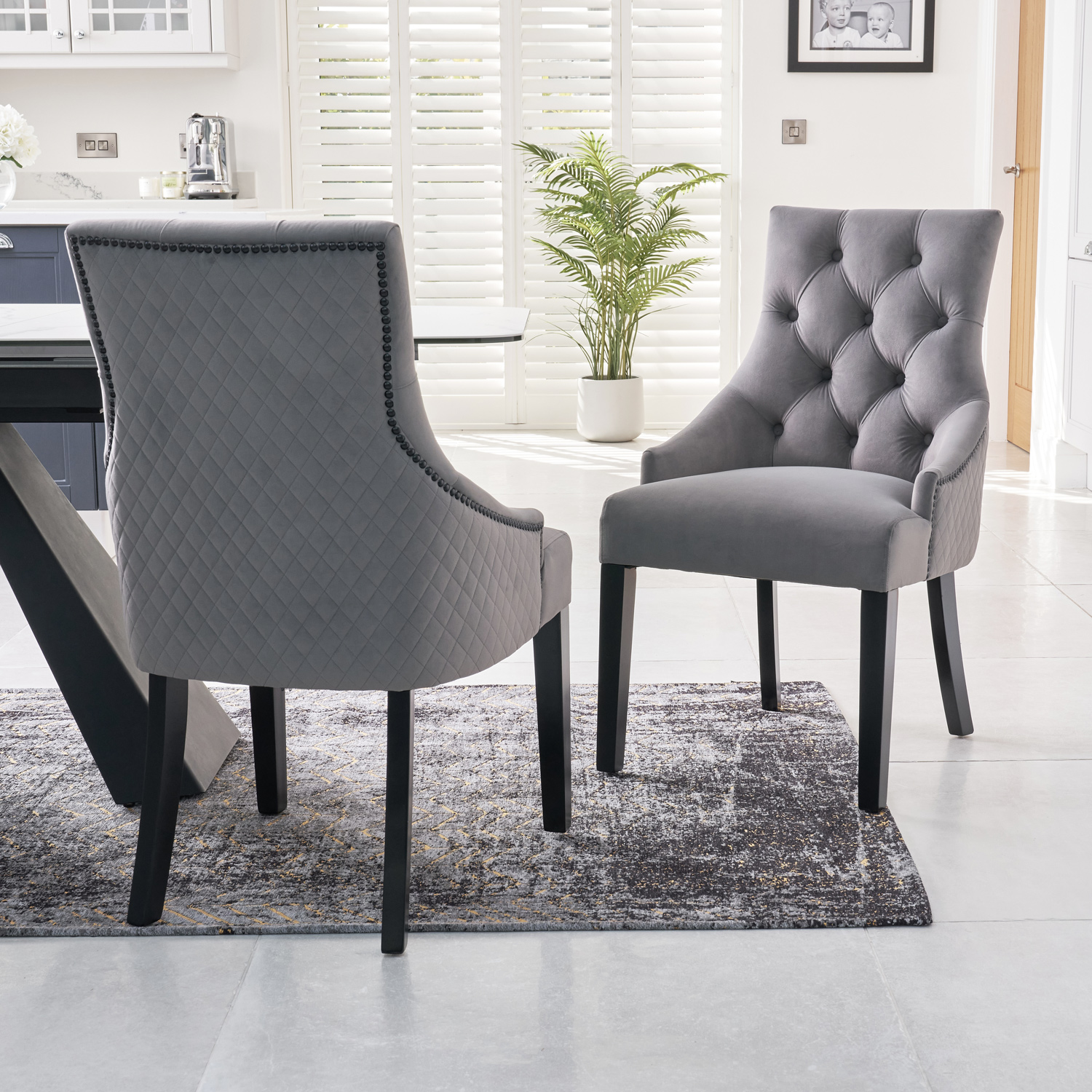 New Chelsea Quilted Grey Brushed Velvet Scoop Back Dining Chair Black Studs