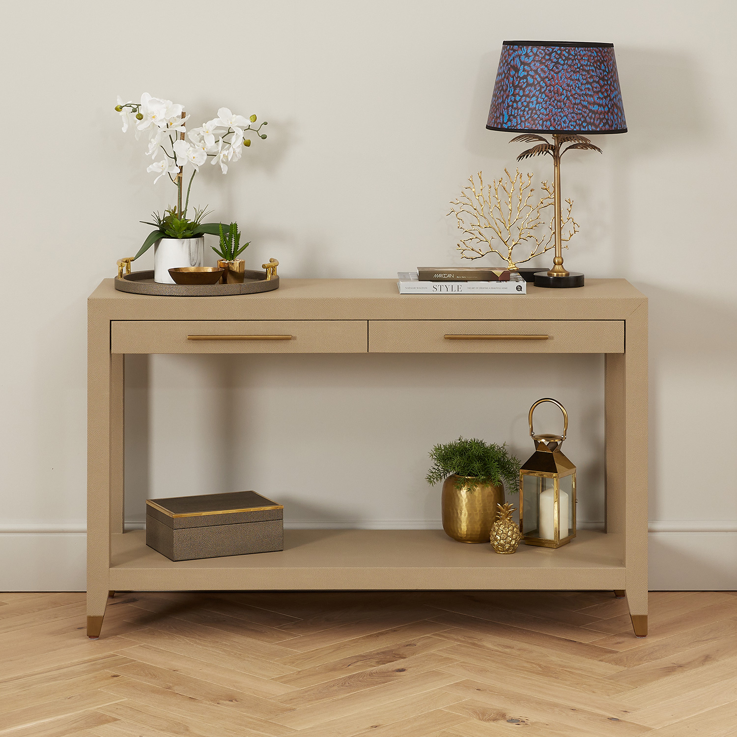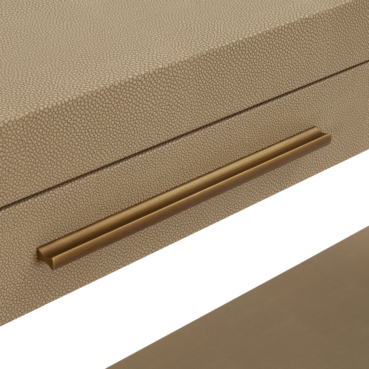 Enhance your living space with the sophisticated and stylish Shagreen two drawer console table. This luxurious Richmond collection is inspired by the sumptuous refinement of 1920’s to 1930s Paris. This luxurious textured Shagreen-embossed leather, has a very soft texture and subtly complex pattern of stingray hide. Showcasing two drawers with refined brass handles.