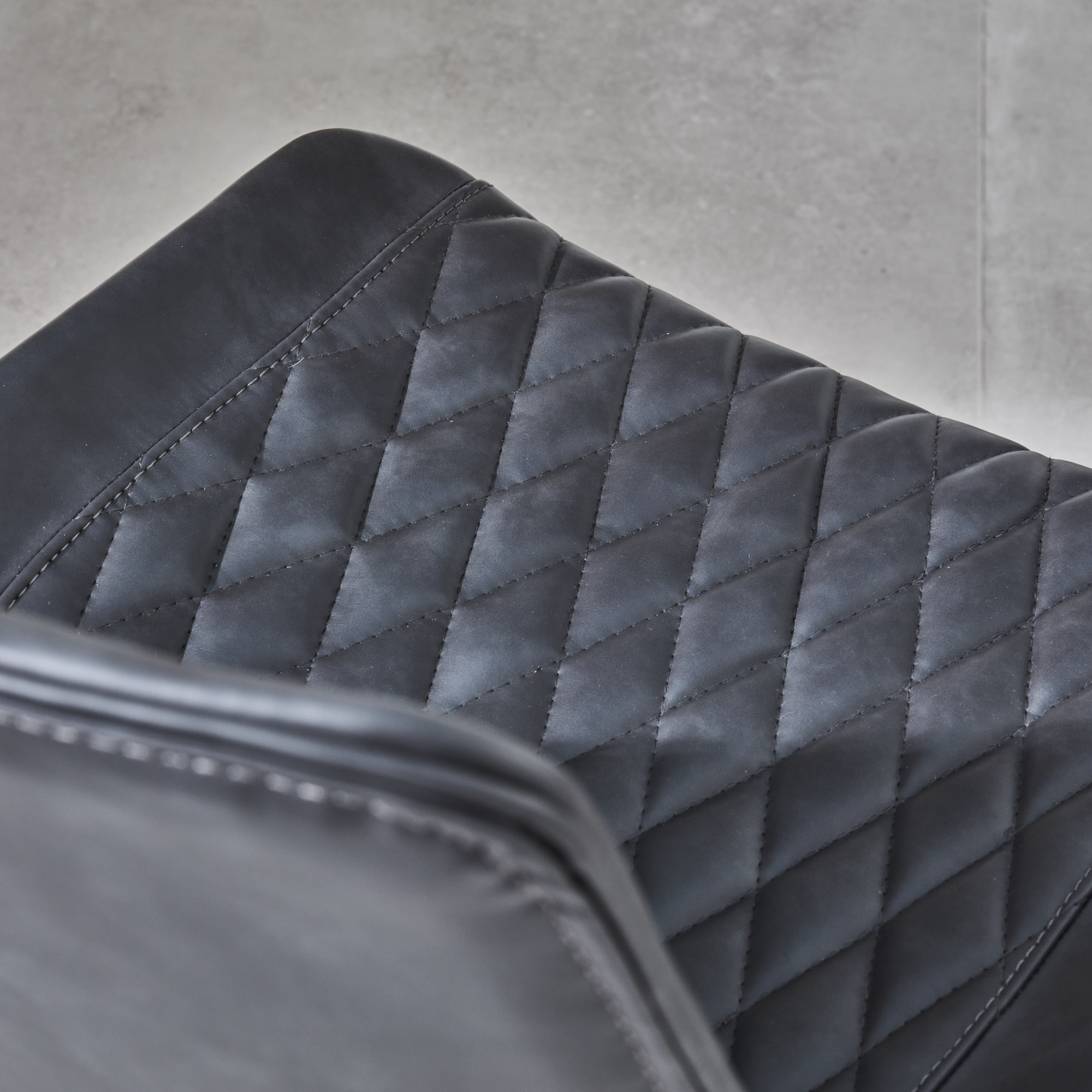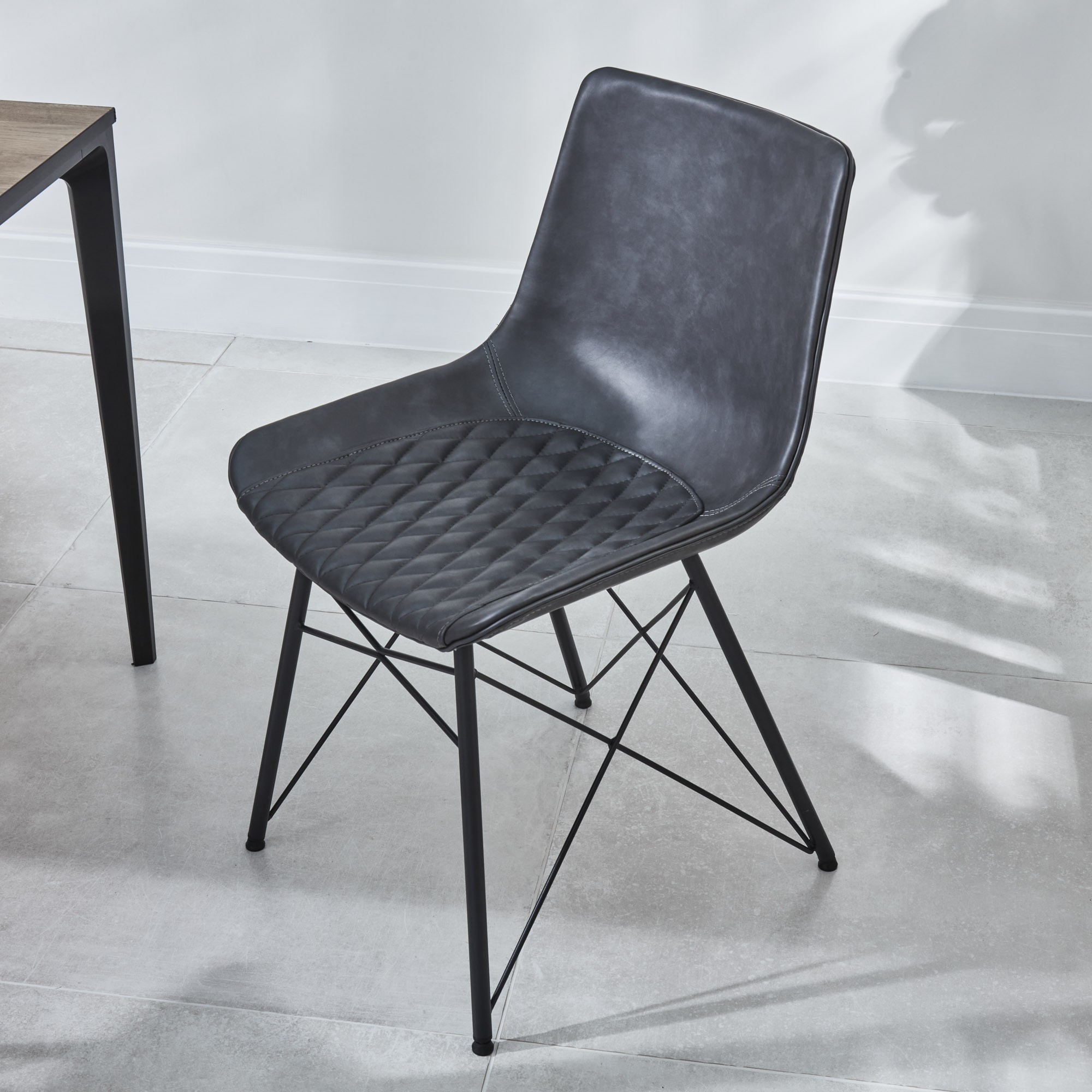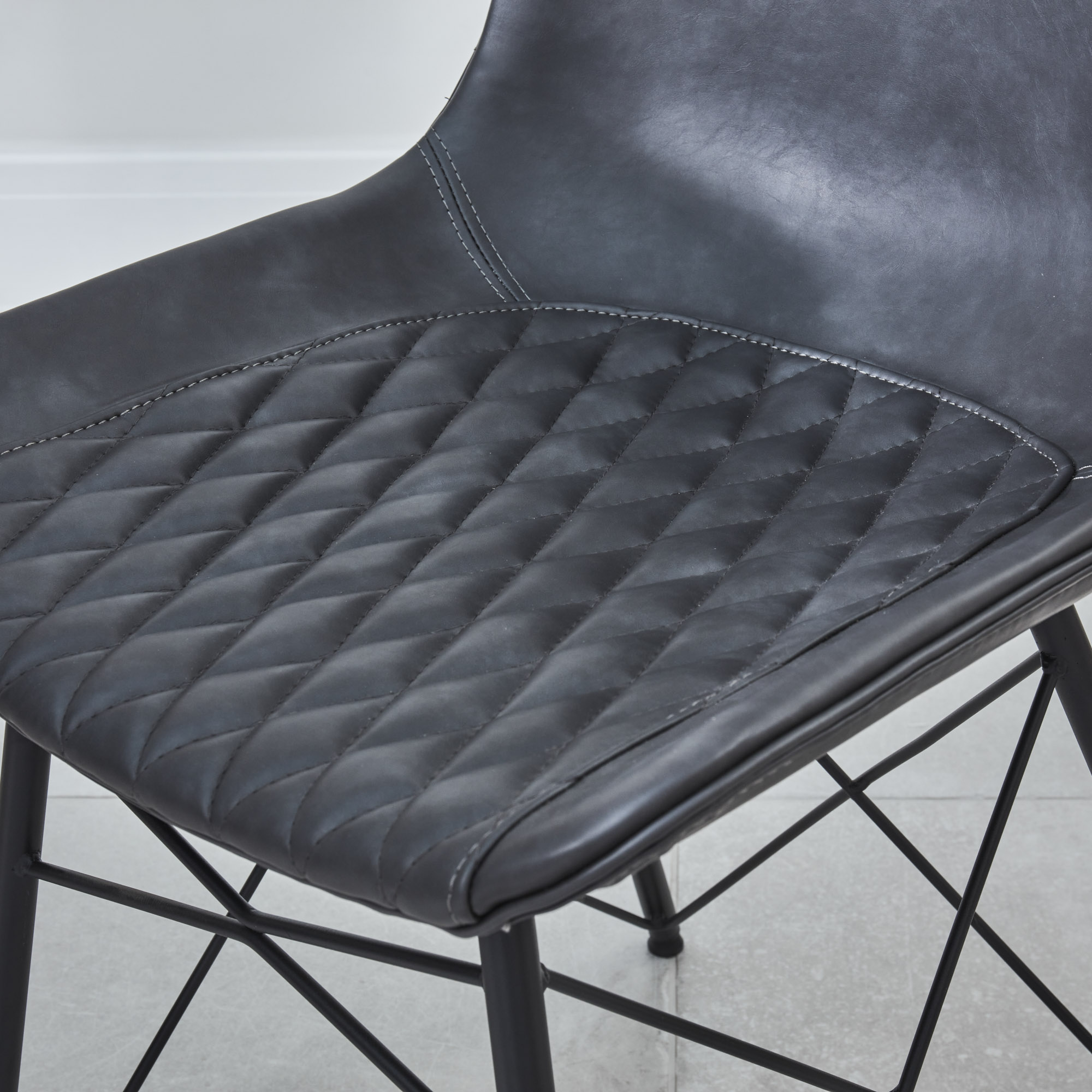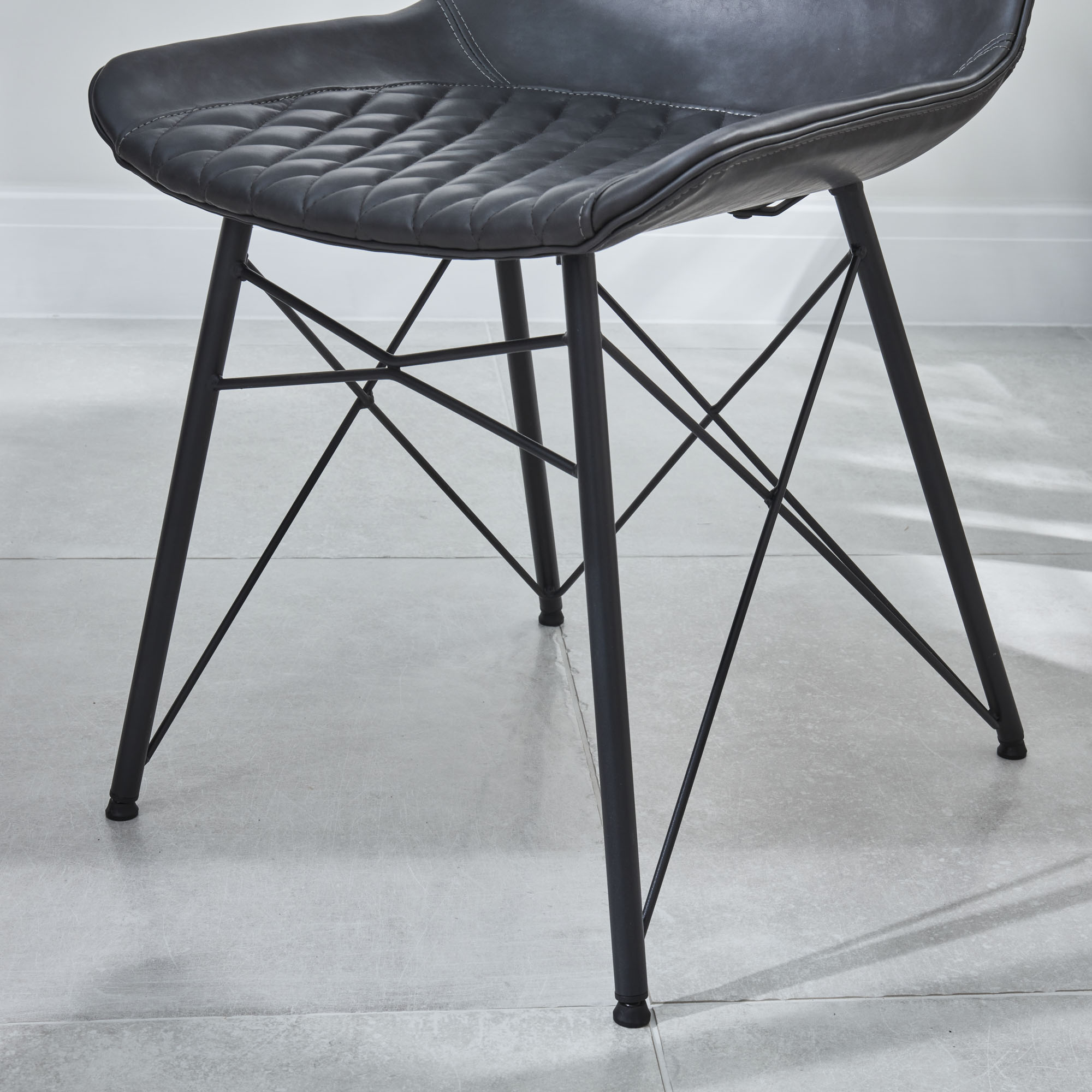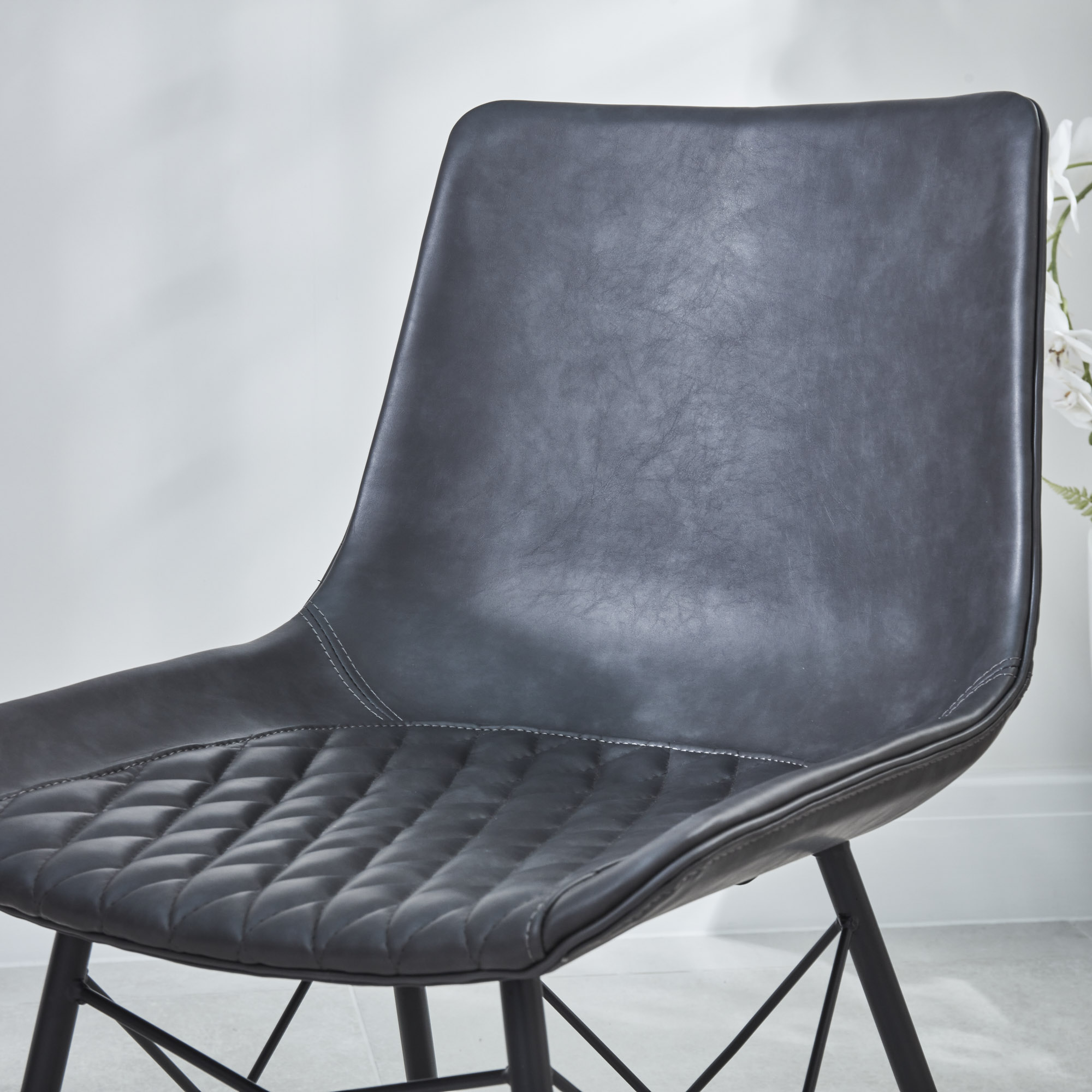 With its luxurious quilted faux leather charcoal padded seat, and neat stitching detail, the Leon dining chair is so much more than just somewhere to sit. This modern chair will make your space look great and you feel the comfort when sat in. The four powder coated legs have a stylish look to the base structure.